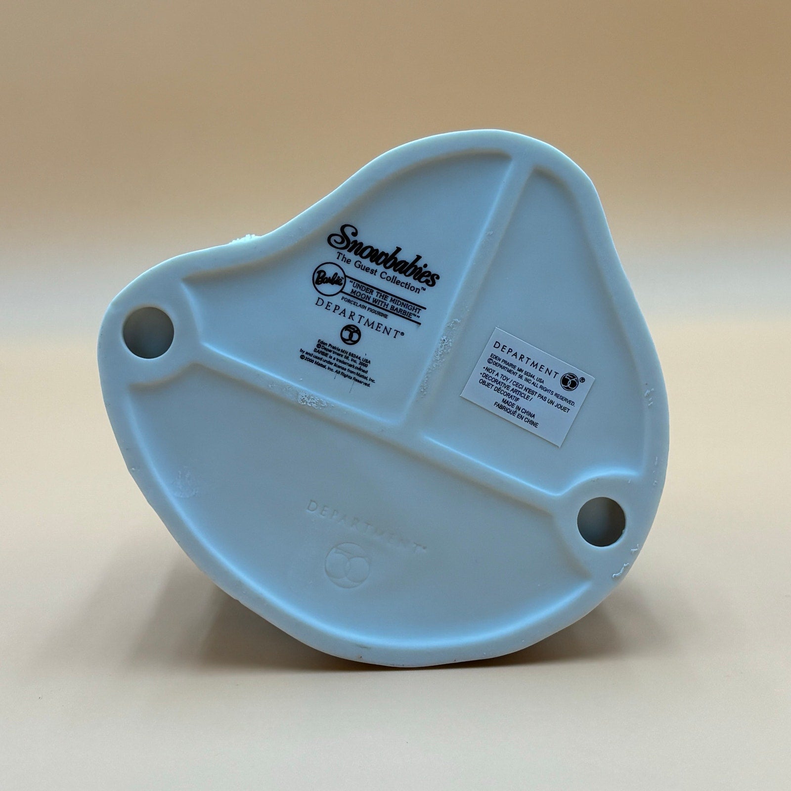 Porcelain figurine from the Snowbabies Guest Collection by Department 56. Titled “Under the Midnight Moon with Barbie.” Features Barbie in a blue winter gown holding hands with two Snowbabies in textured snowsuits, one holding a gift. Official Barbie and Snowbabies collaboration. Includes original box.