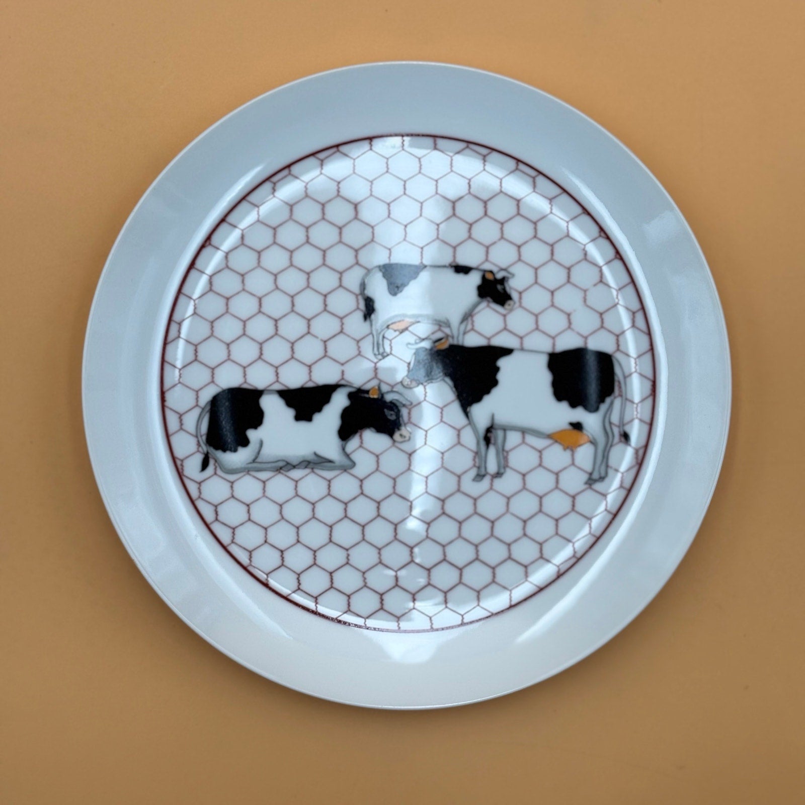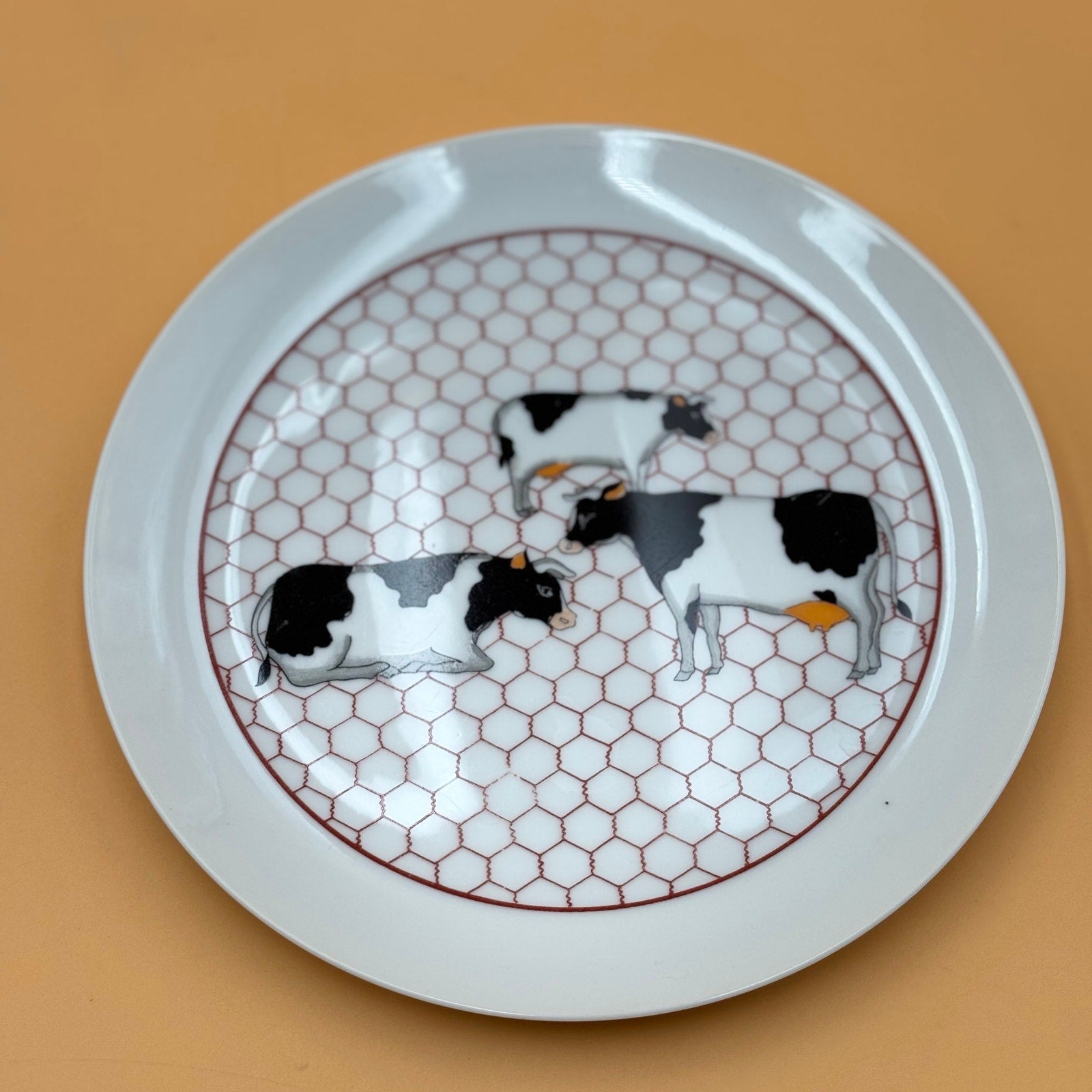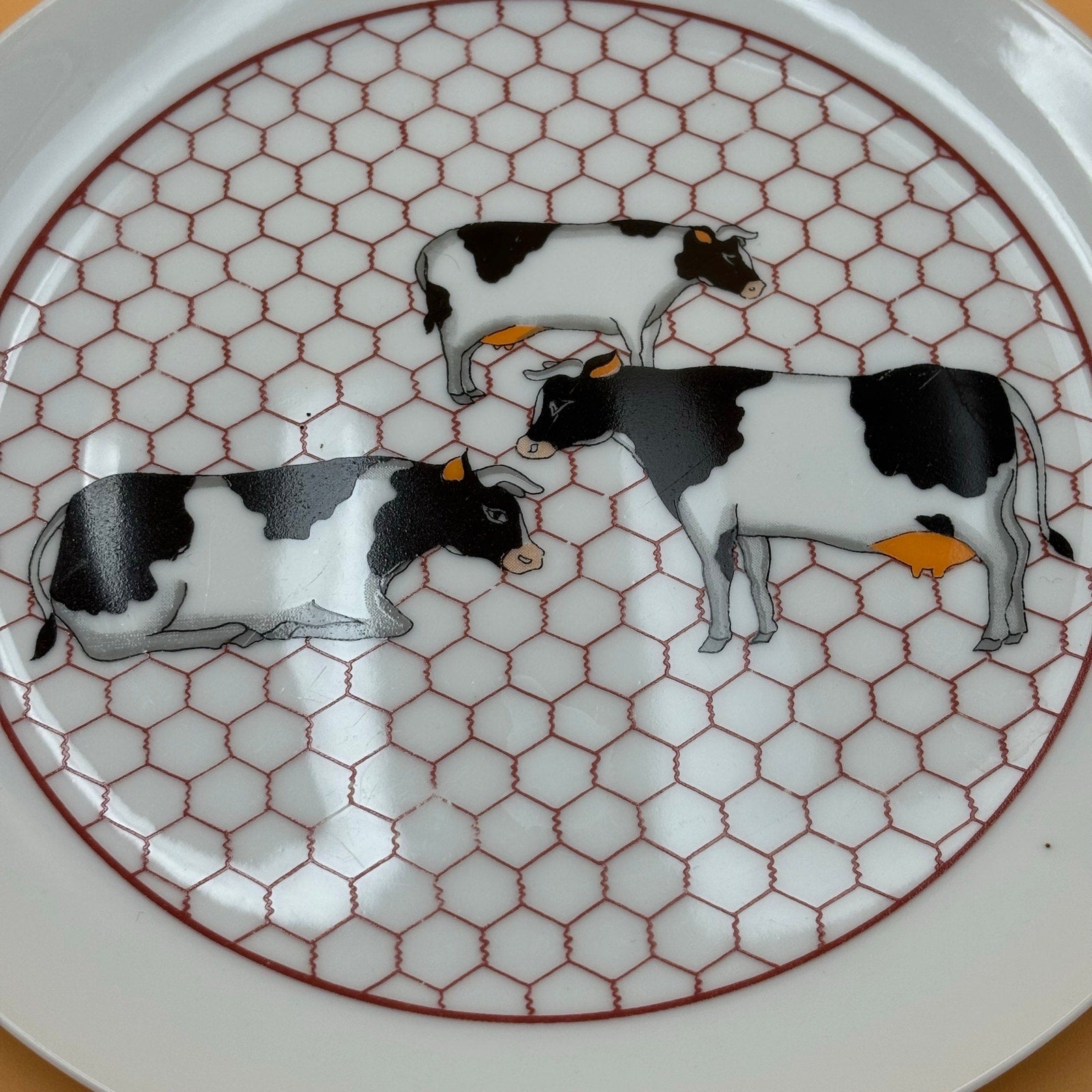 Pair of porcelain dessert plates by Takahashi San Francisco, featuring a playful cow and chicken wire farm design. Made in Japan. Beautiful glossy finish with crisp detail — perfect for farmhouse, country, or eclectic kitchen décor.