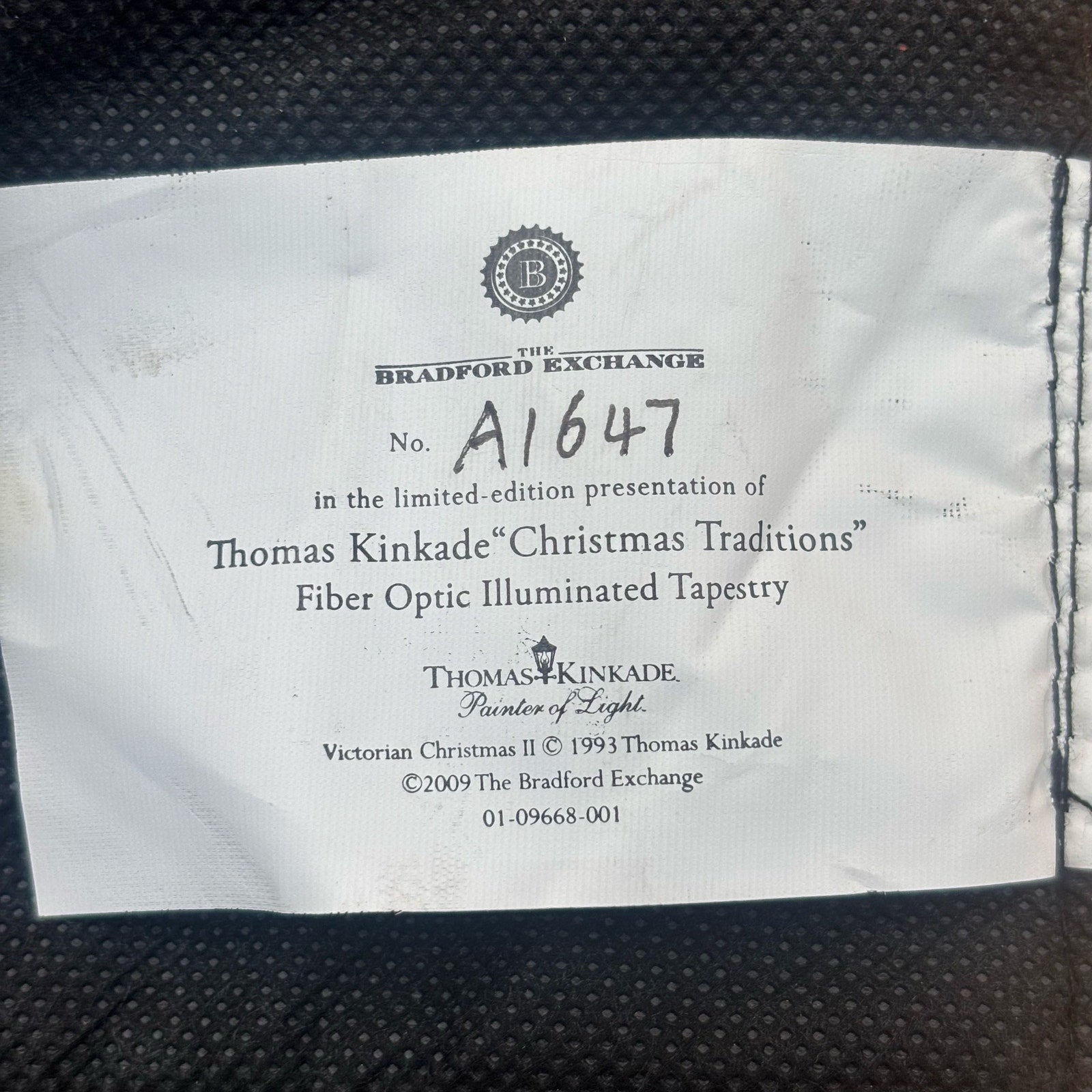 Limited edition Thomas Kinkade “Christmas Traditions” fiber optic illuminated tapestry from The Bradford Exchange, featuring the 1993 painting Victorian Christmas II. The tapestry lights up beautifully with multicolor fiber optics and gold fringe trim. A stunning collectible holiday wall hanging.