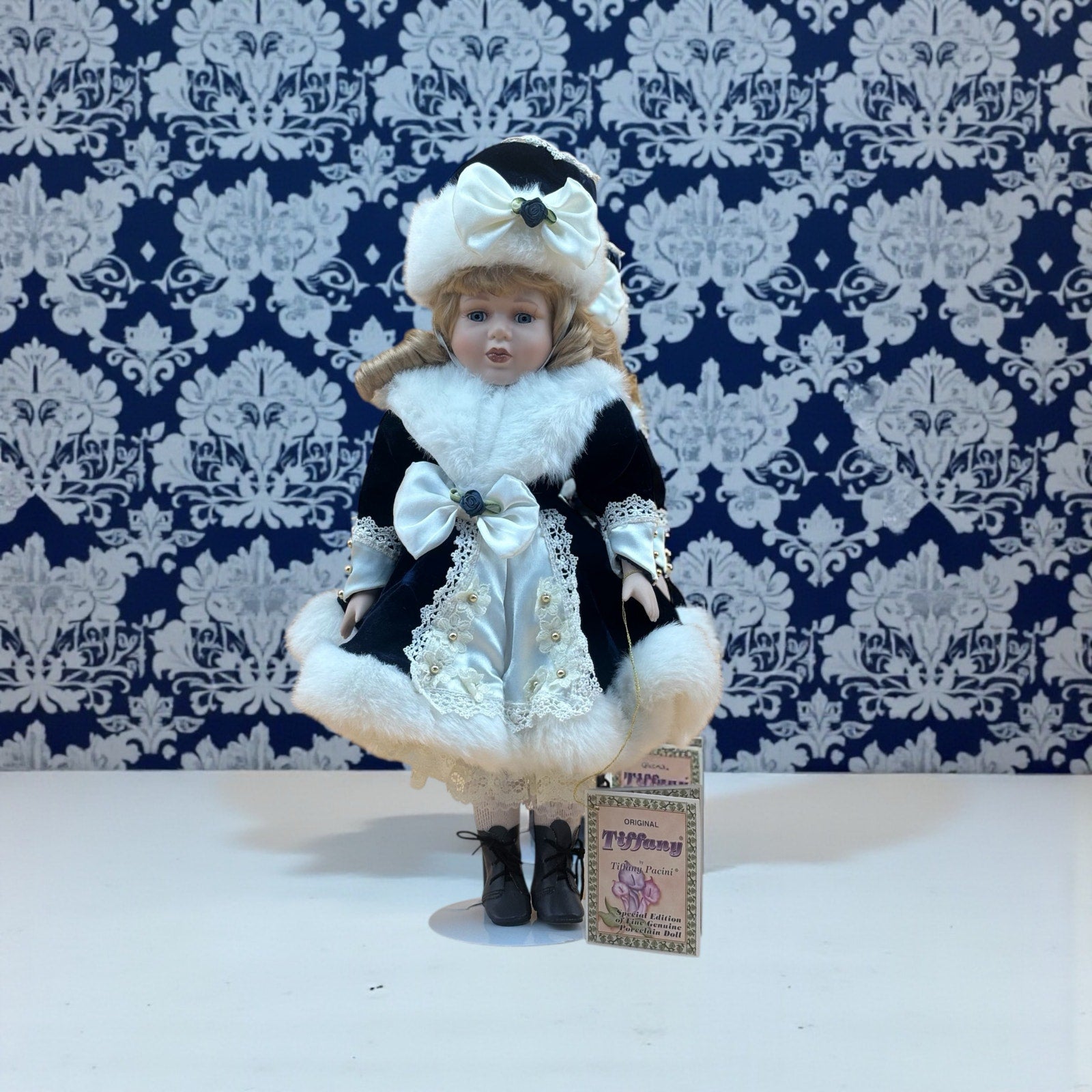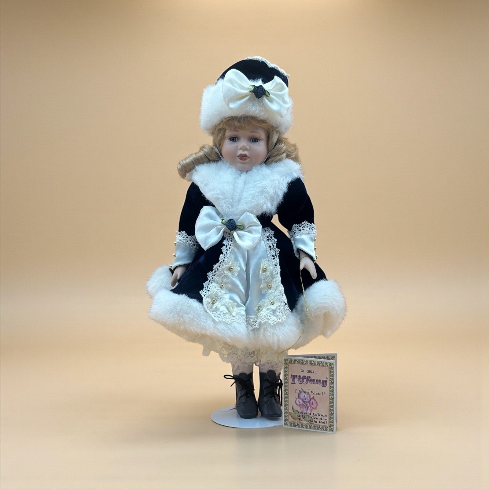 Original Tiffany Pacini limited-edition porcelain doll from the Victorian Collection. Dressed in a navy-blue velvet coat trimmed with faux fur, satin bows, lace, and pearl accents. Includes matching hat, lace petticoat, black lace-up boots, and the original certificate booklet. A lovely collectible display doll with stand included.