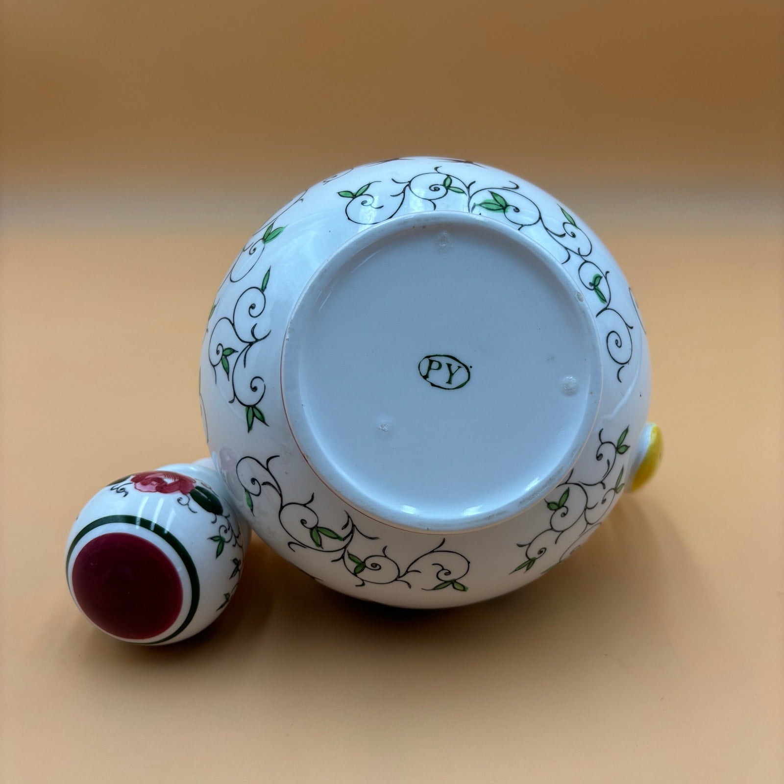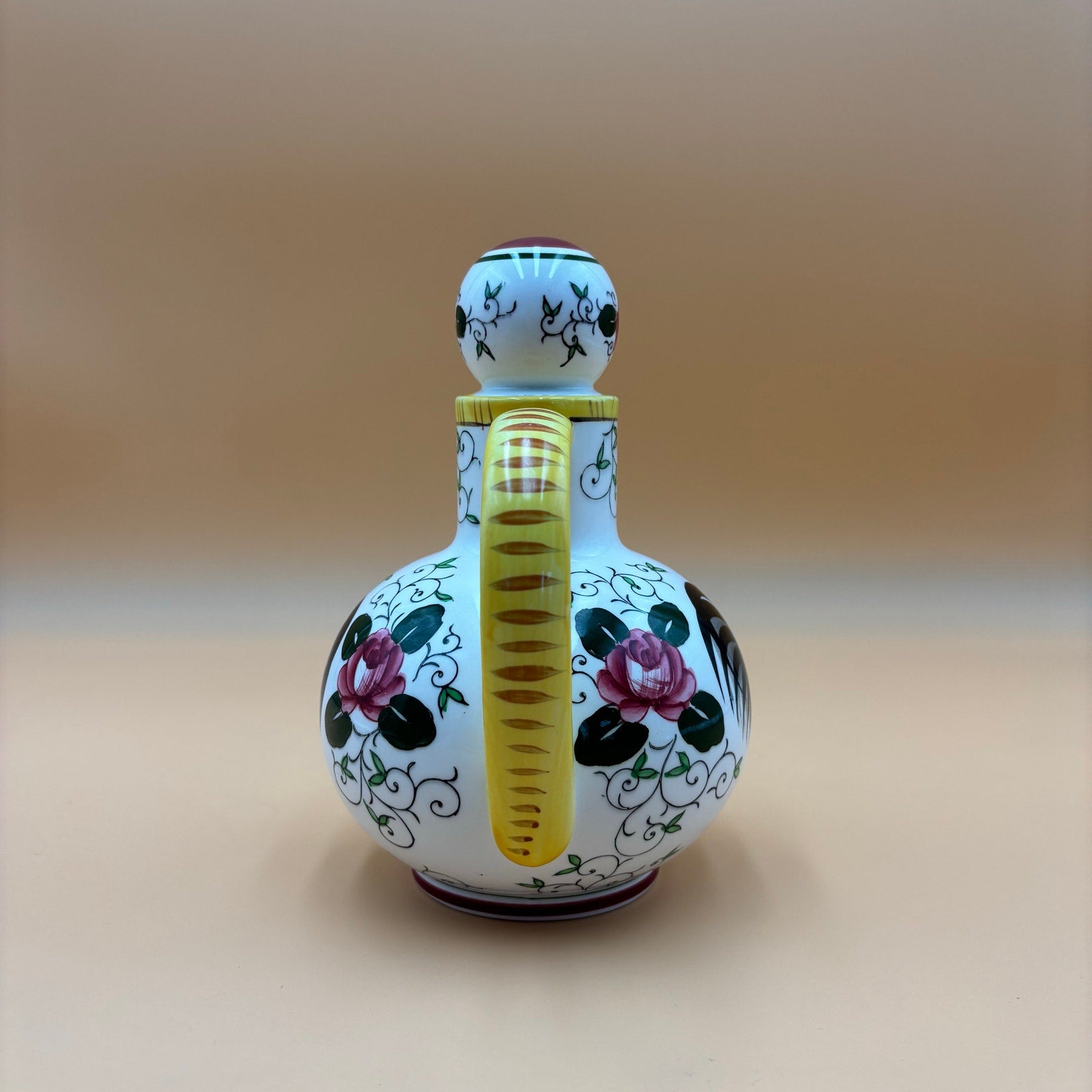 UCAGCO Early Provincial ceramic carafe with lid. Features a hand-painted rooster with red roses, green vines, and yellow handle. Marked βPYβ on bottom, consistent with UCAGCO imports. Made in Japan. Pattern name: Early Provincial.