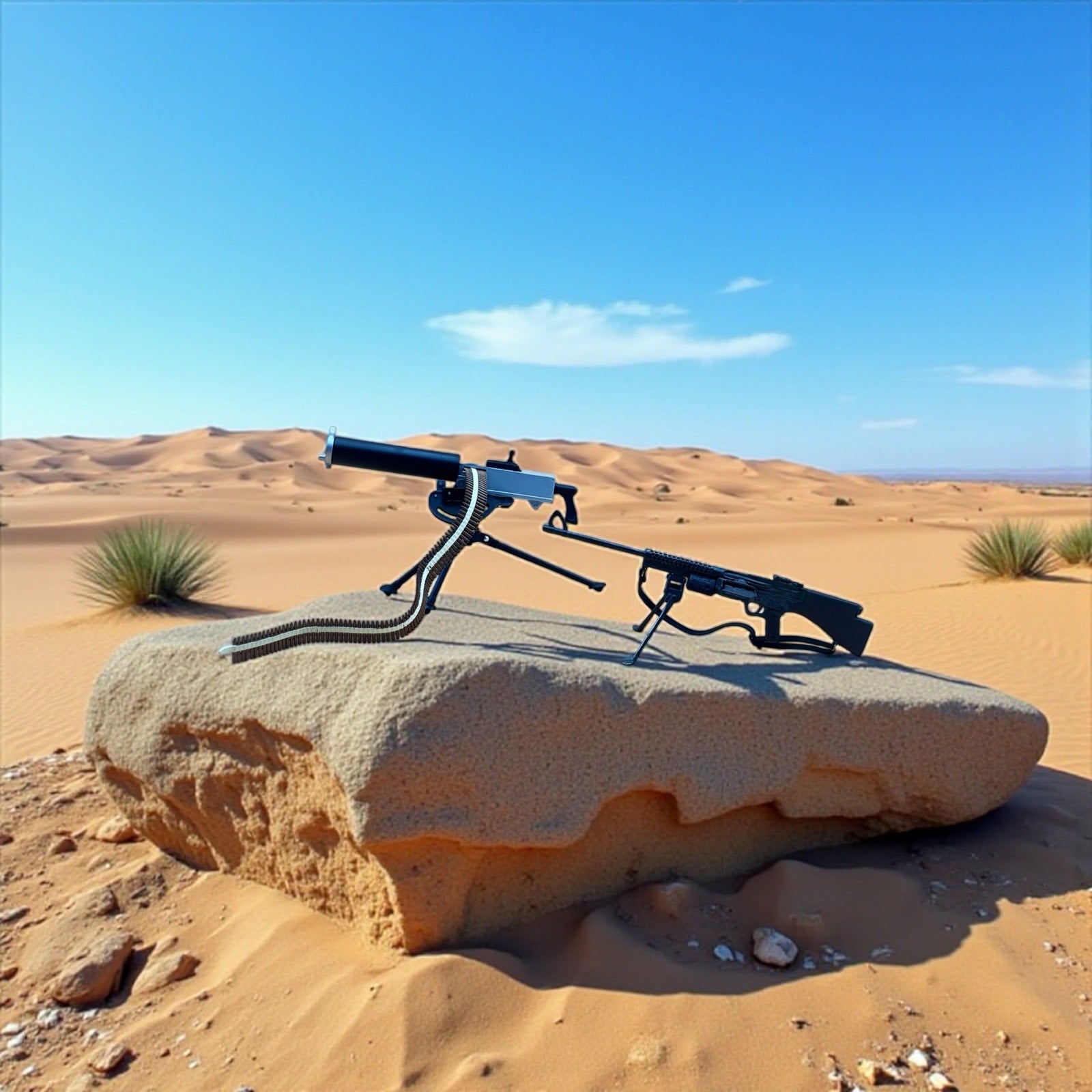 • Tripod-mounted heavy machine gun with attached ammo belt