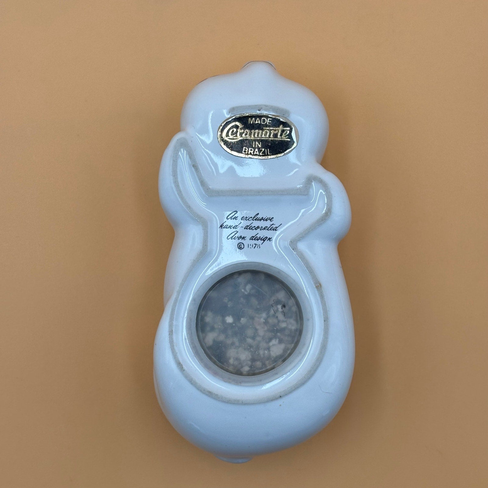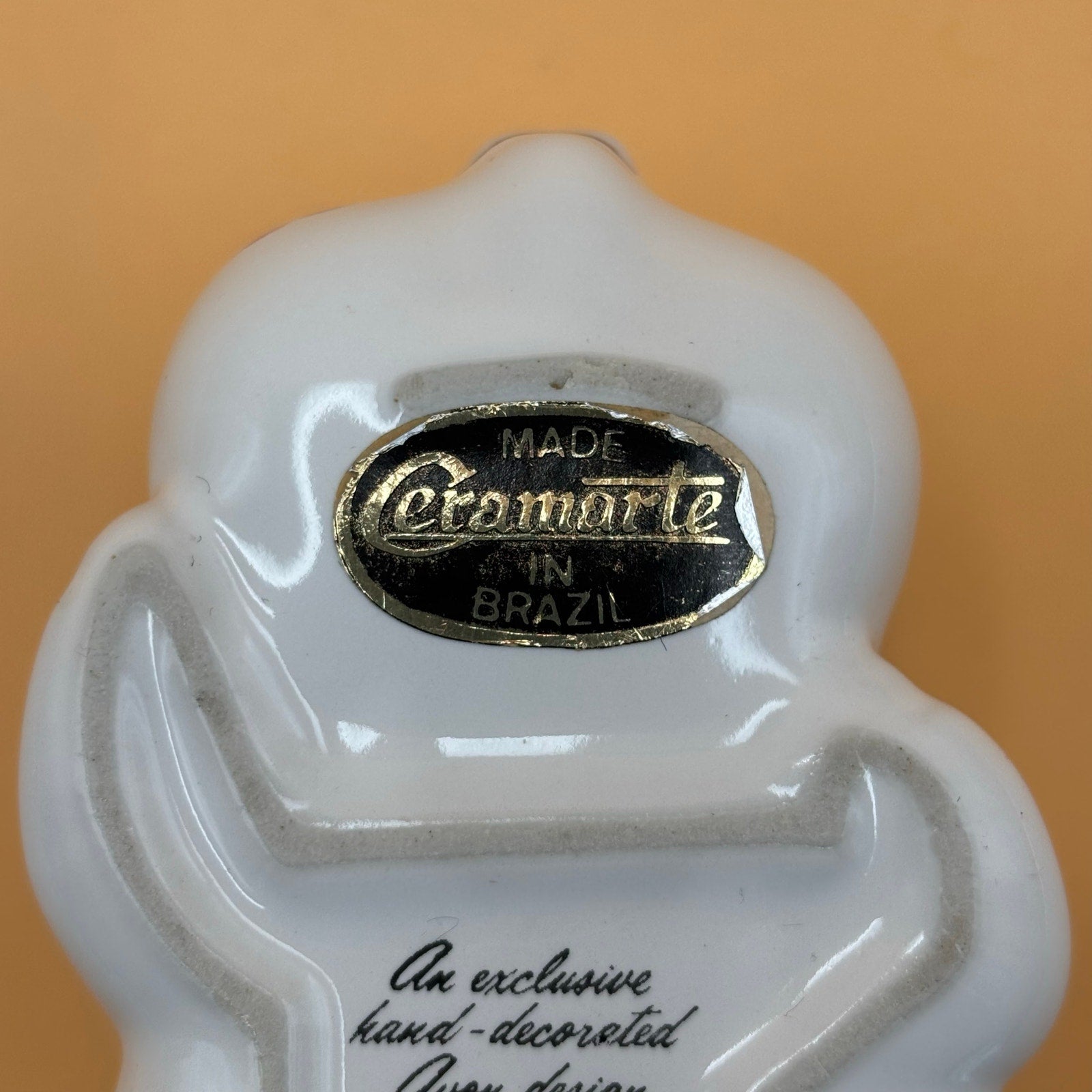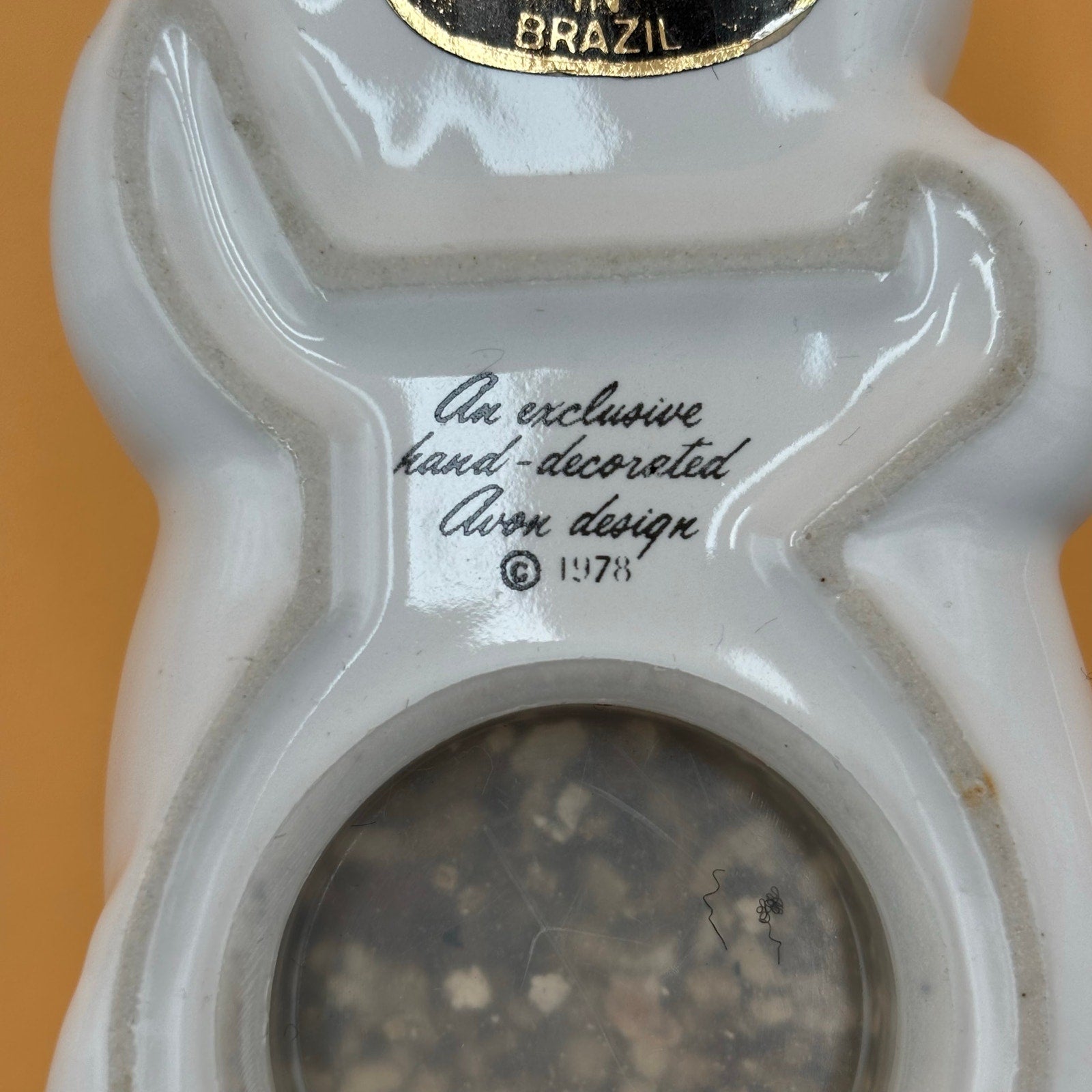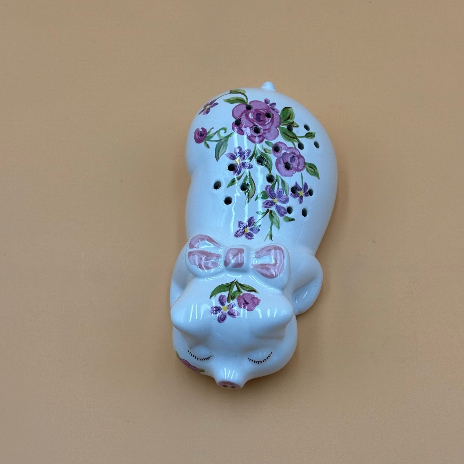 Charming hand-decorated ceramic pig sachet from Avon, dated 1978 and made by Ceramarte in Brazil. Features a sweet sleeping pig with a pink bow and delicate purple floral design. Light scent present. A cute decorative piece for a dresser, vanity, or shelf.