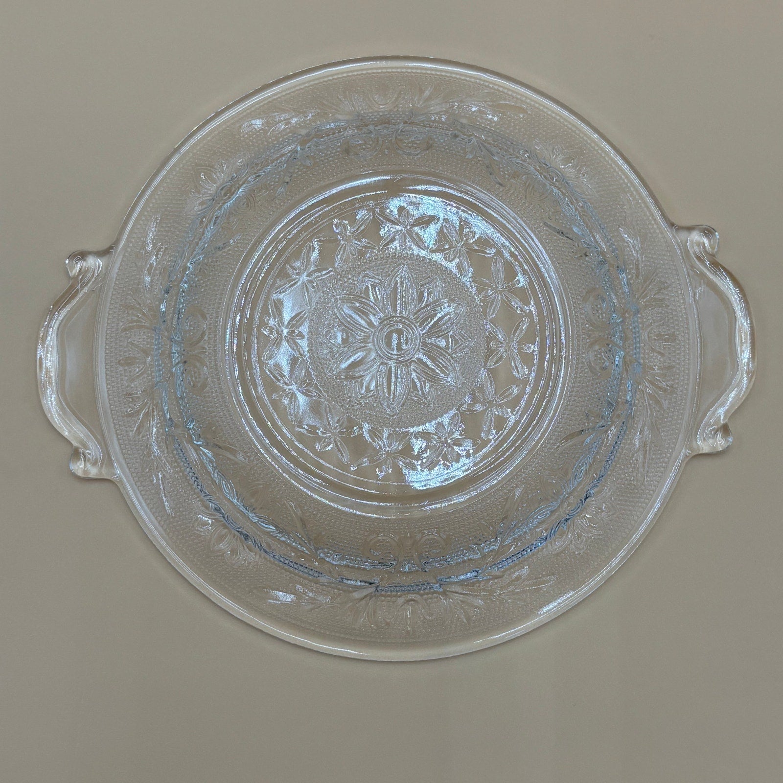 Anchor Hocking domed crystal sandwich/butter dish with floral pattern. Features two side handles and clear glass dome lid with decorative top handle.