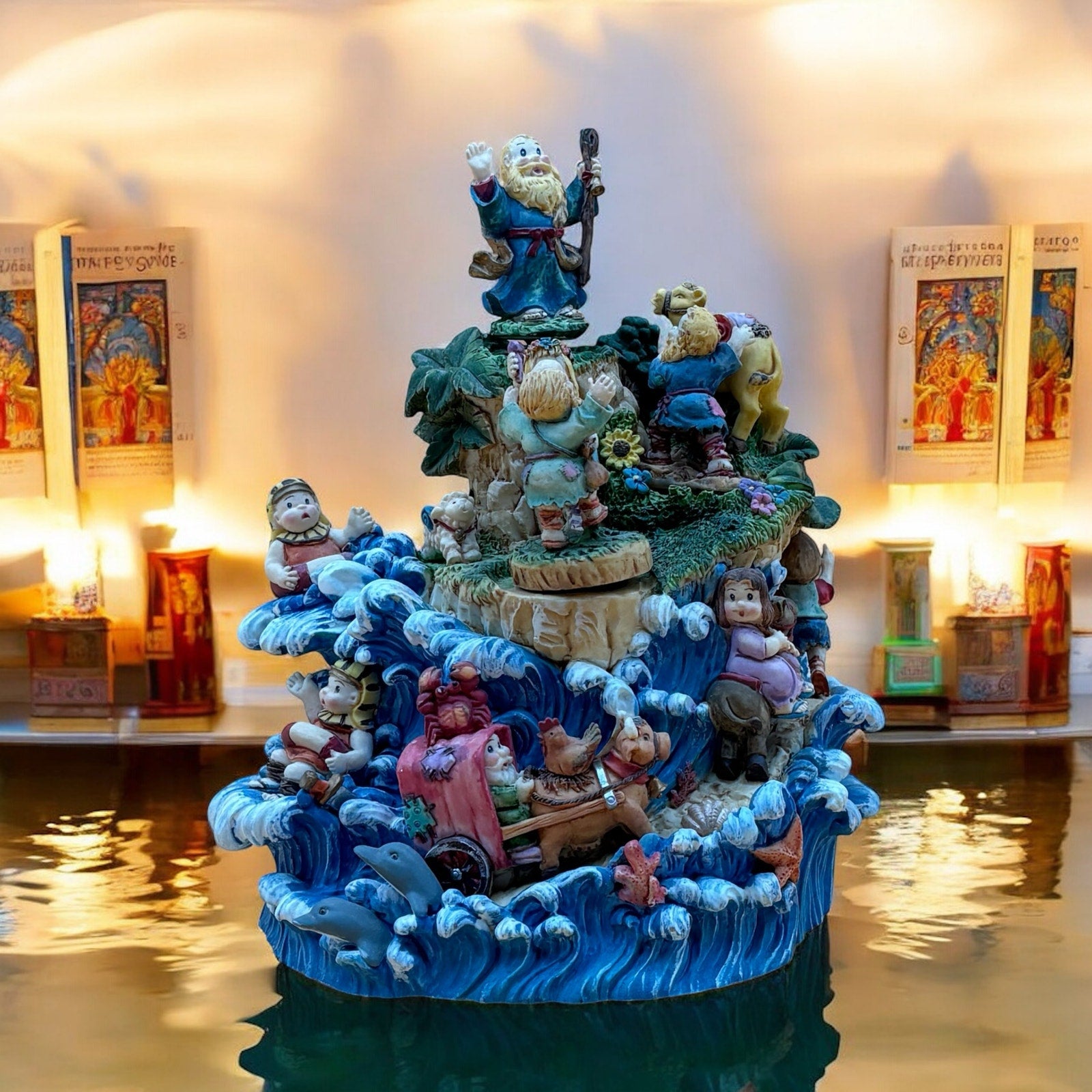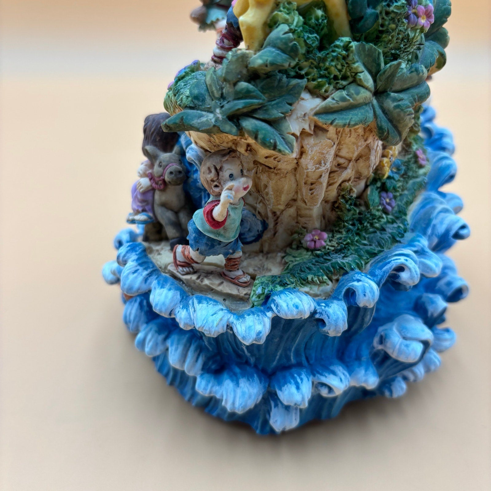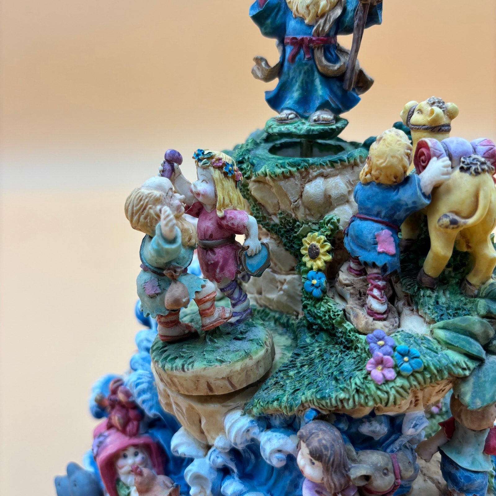 Whimsical and colorful vintage music box featuring a detailed biblical scene with rotating figures. Plays the tune “Chariots of Fire” as the man at the top and the dancing couple below slowly turn. Full of playful and adorable character designs including animals, ocean waves, and cheerful expressions. A fun and unique decorative piece with a lot to look at!