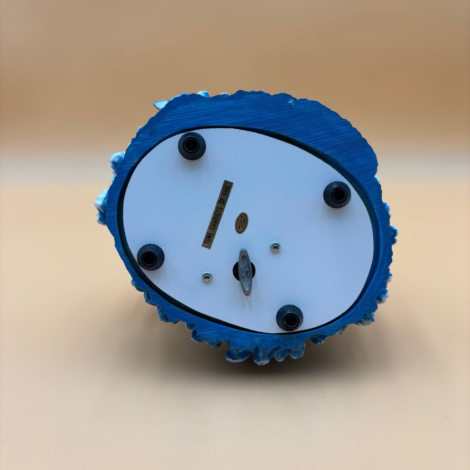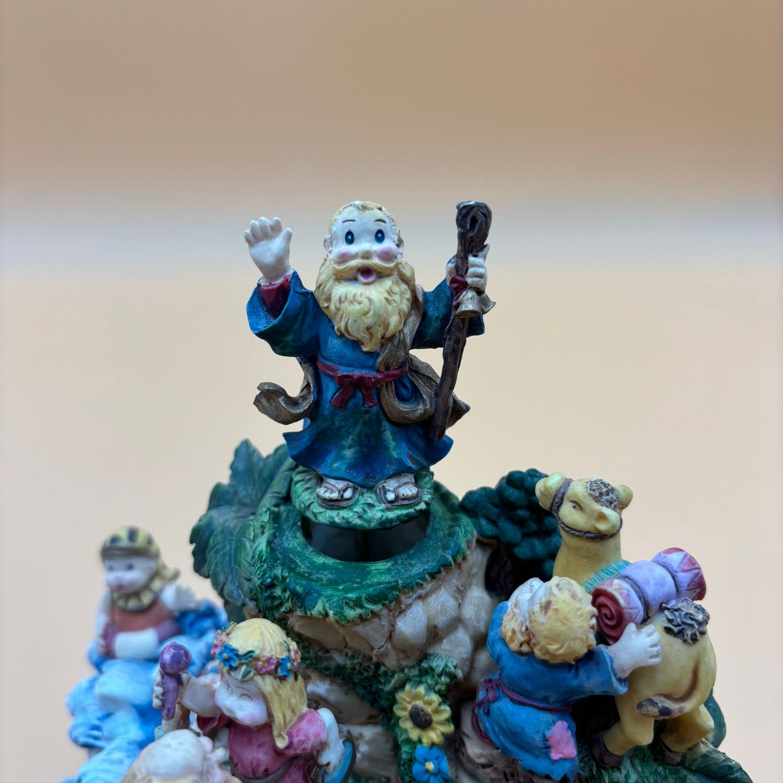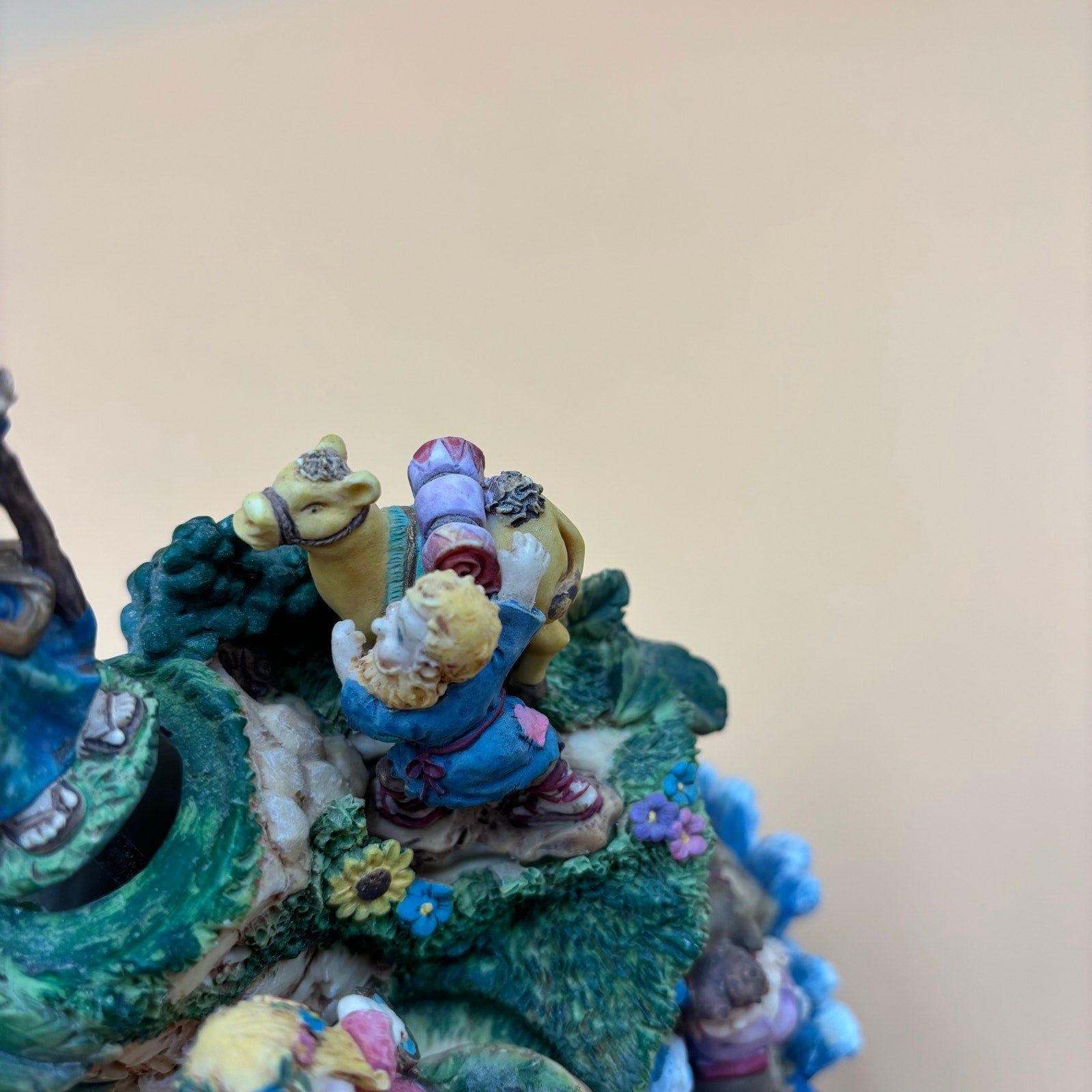 Whimsical and colorful vintage music box featuring a detailed biblical scene with rotating figures. Plays the tune “Chariots of Fire” as the man at the top and the dancing couple below slowly turn. Full of playful and adorable character designs including animals, ocean waves, and cheerful expressions. A fun and unique decorative piece with a lot to look at!