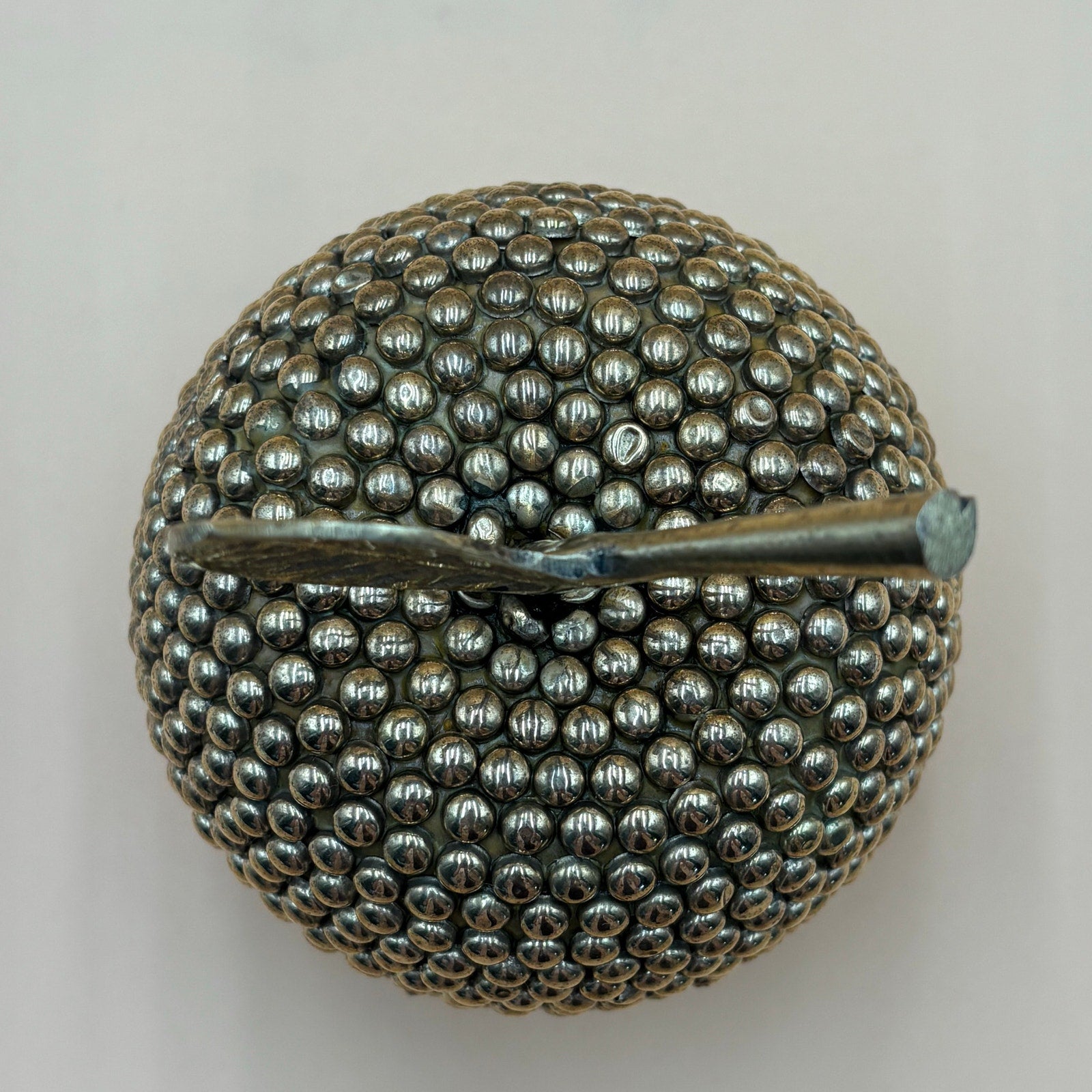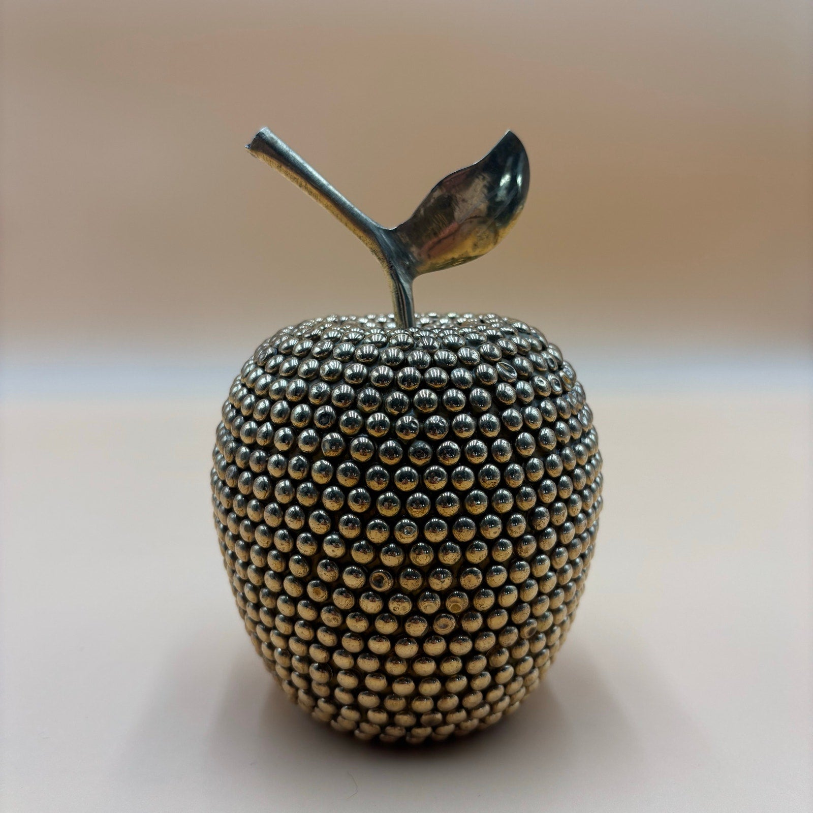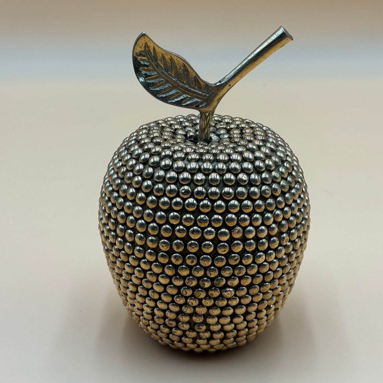 Decorative apple sculpture covered in brass studs for a textured effect. Features metal stem and leaf accent. Substantial weight at approximately 1 pound. Makes a striking centerpiece or bookshelf decorative piece.
