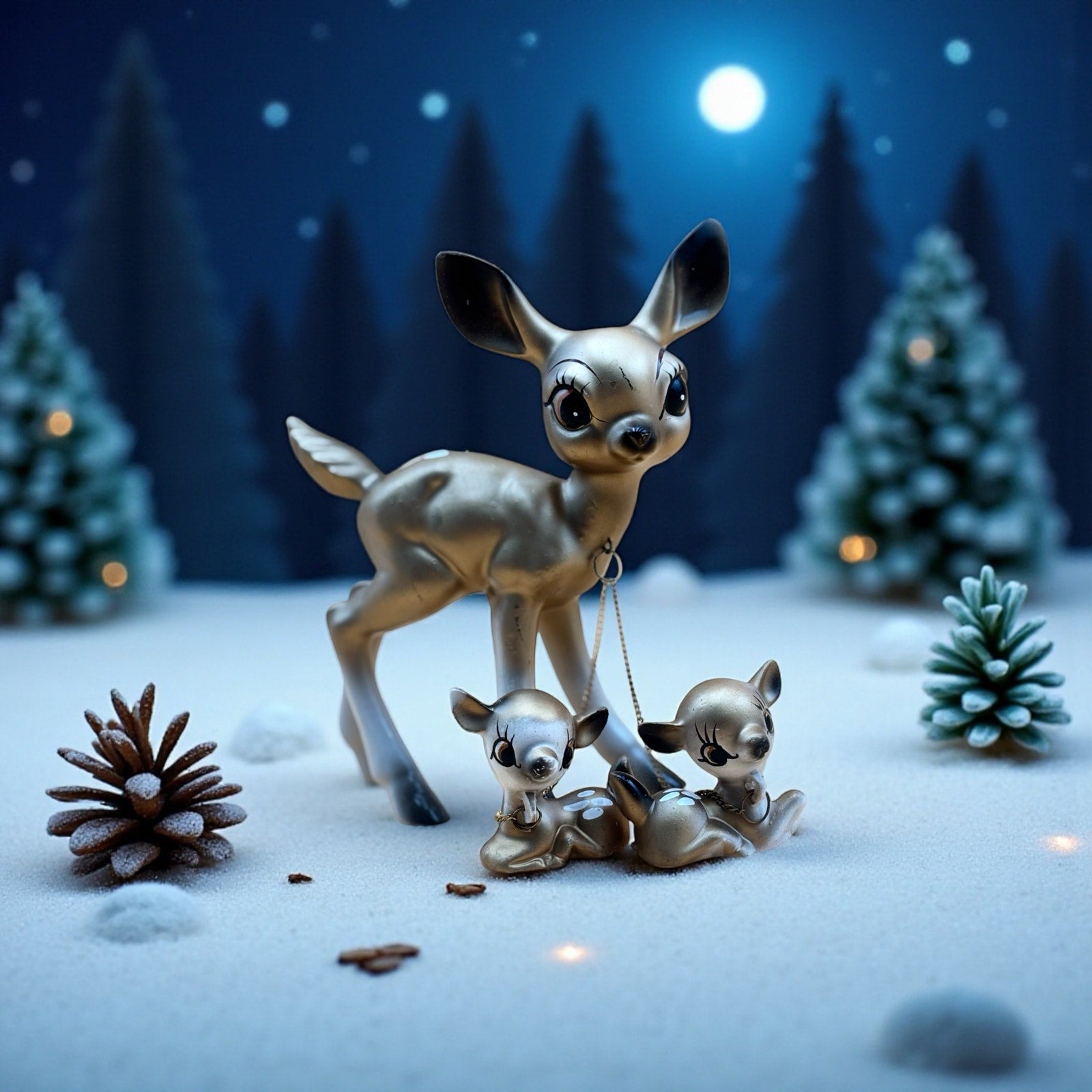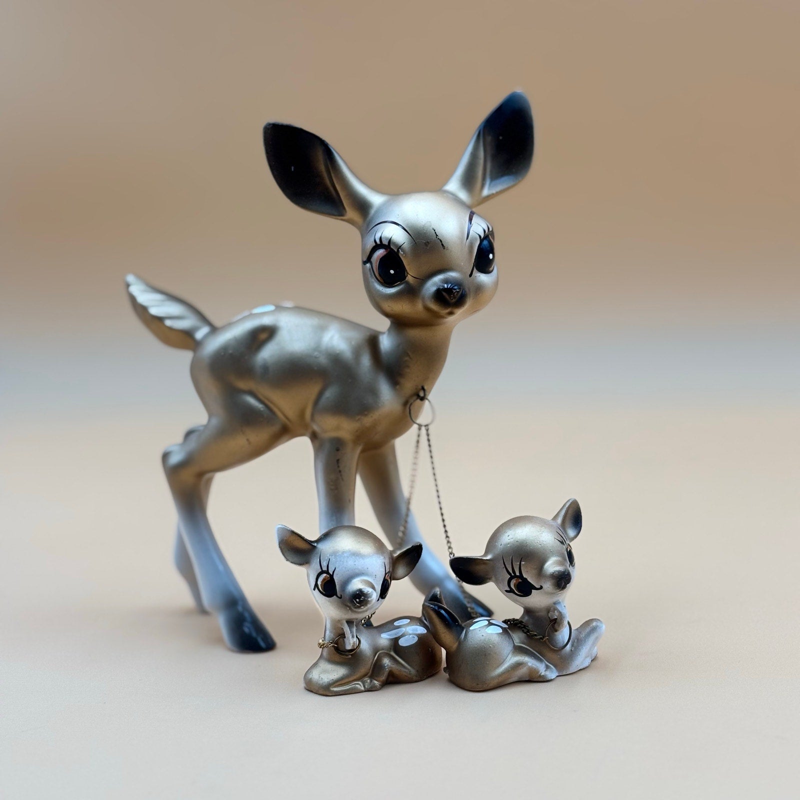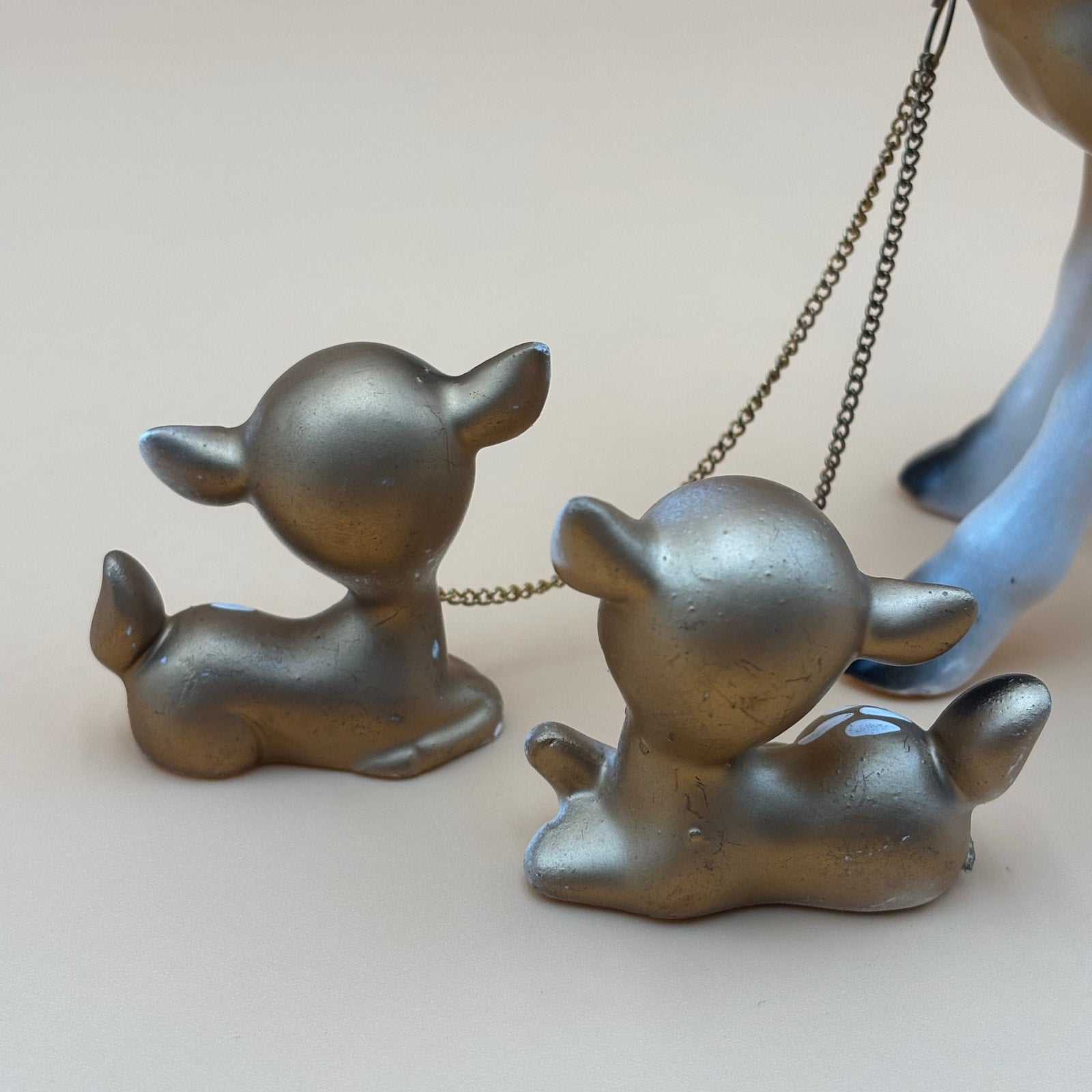 Charming mid-century ceramic deer family featuring a standing mother deer with two chained fawns. Hand-painted in soft gray with white accents and expressive big eyes. Classic 1950s–1960s Japan-style design reminiscent of Lefton and Napco figurines — a nostalgic collectible that adds warmth and character to any display.