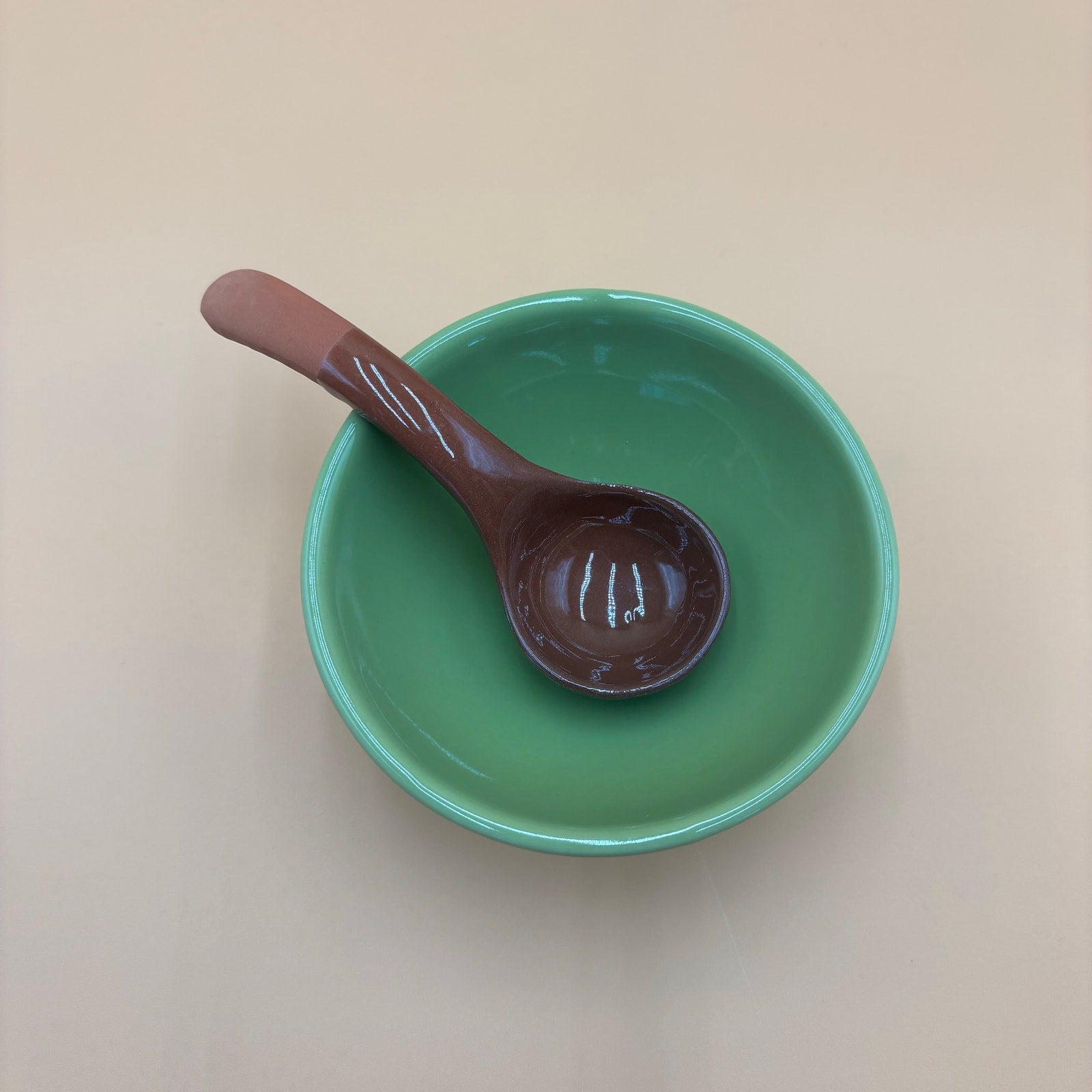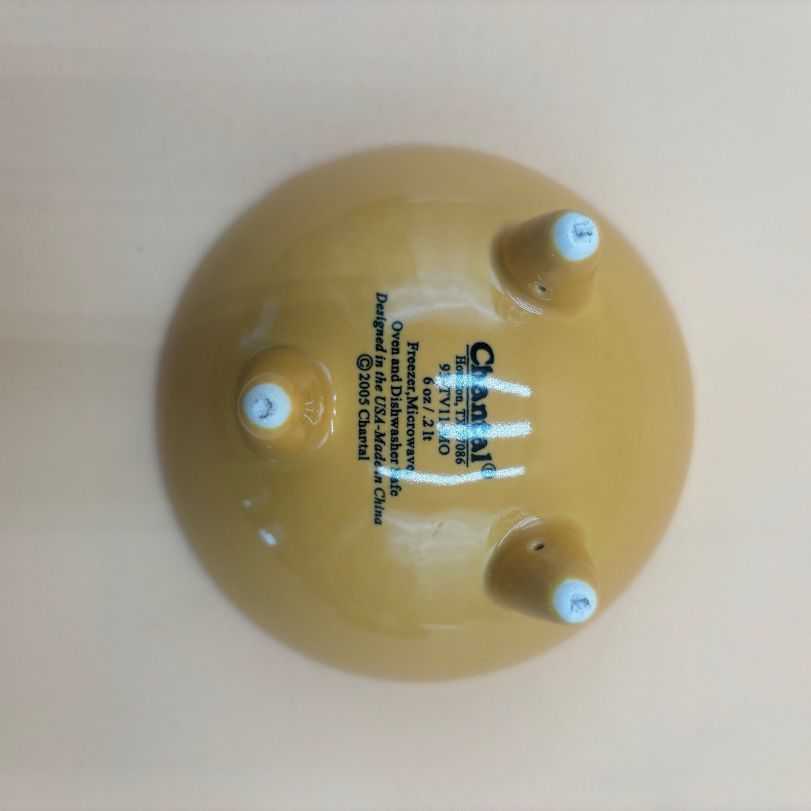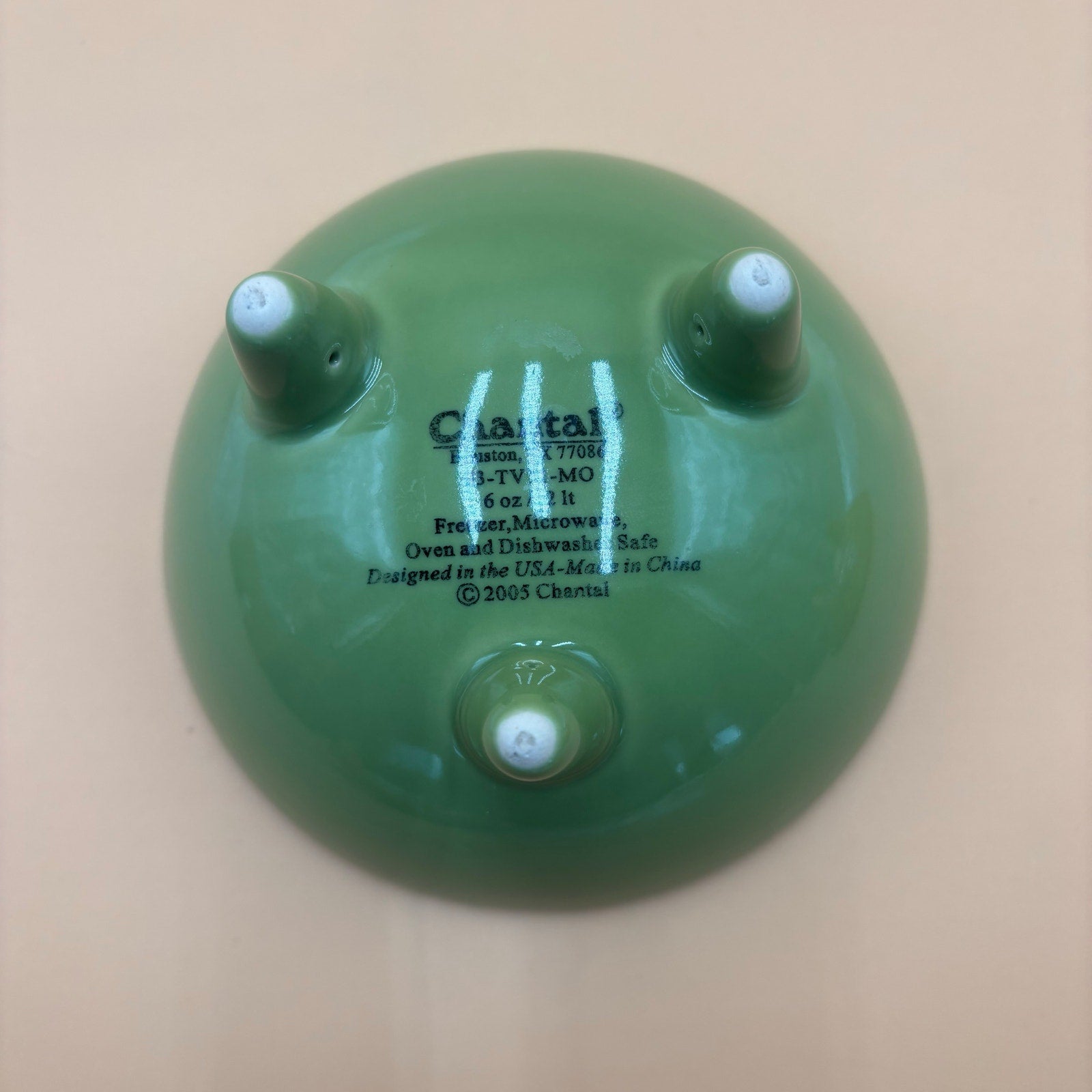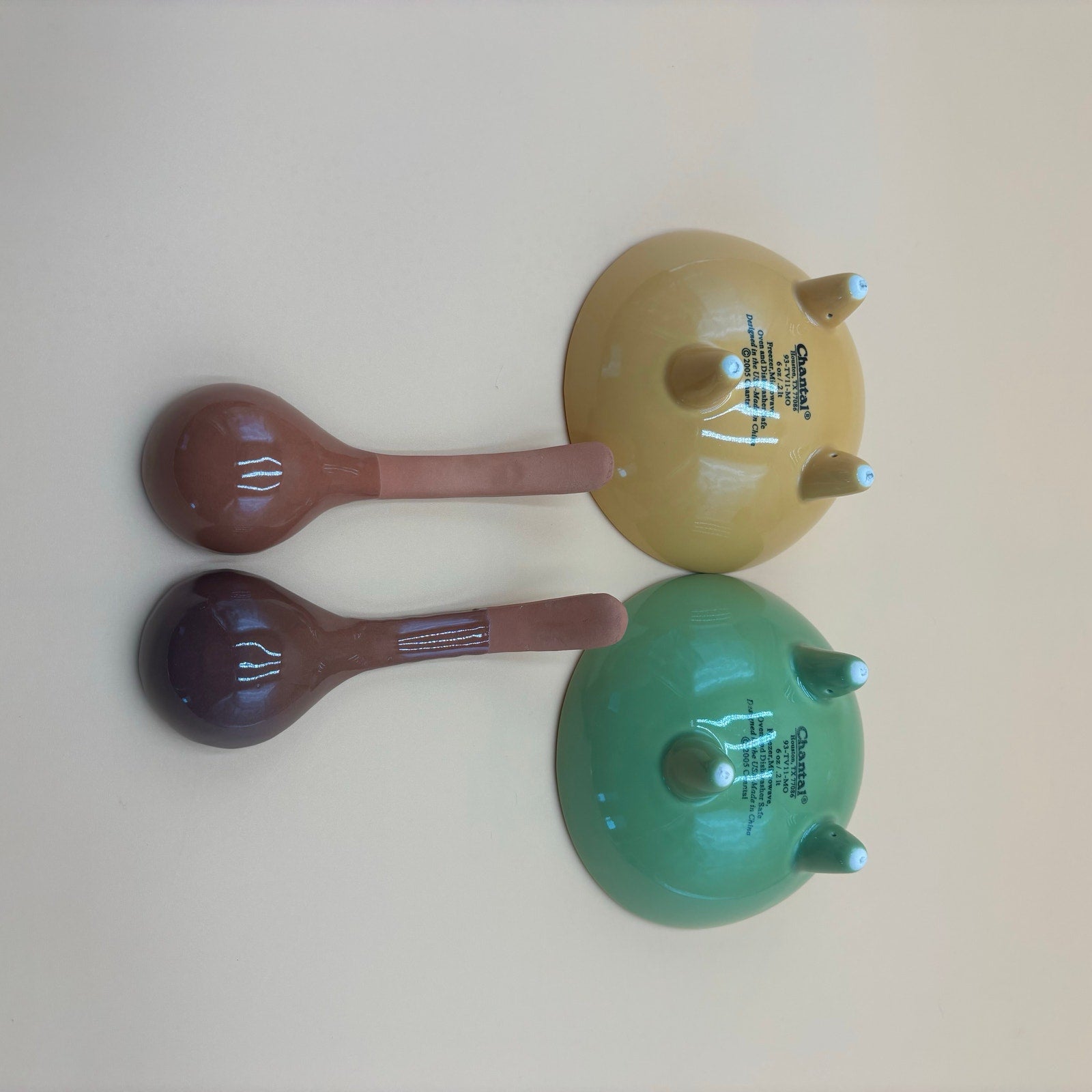 Add a pop of color to your kitchen with this fun vintage set of Chantal ceramic bowls in vibrant yellow and green. Each tripod-footed bowl includes a matching two-tone ladle, making them perfect for serving dips, sauces, or soup. Discontinued and hard to find!