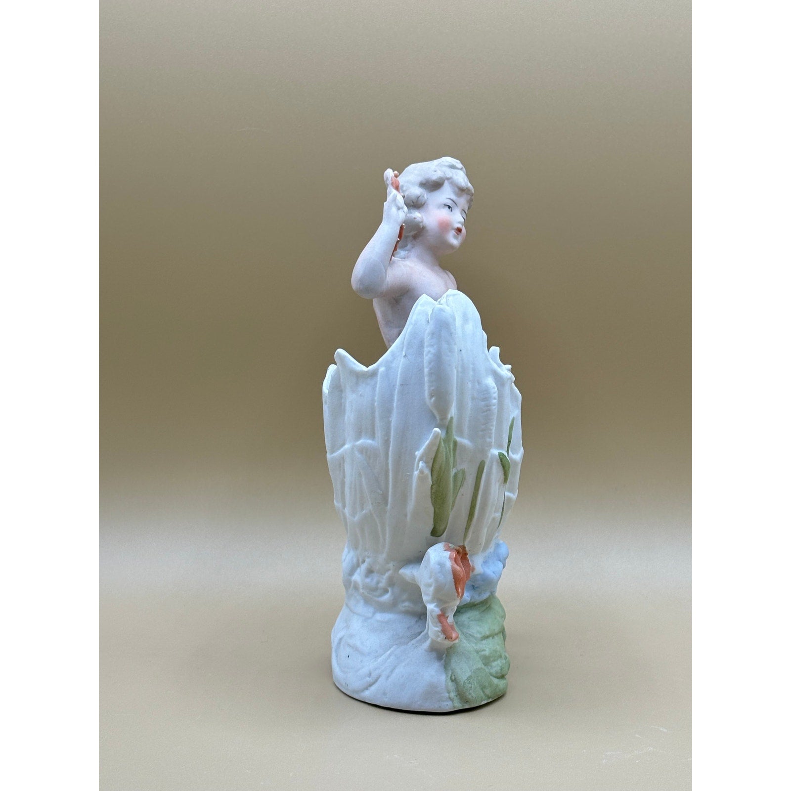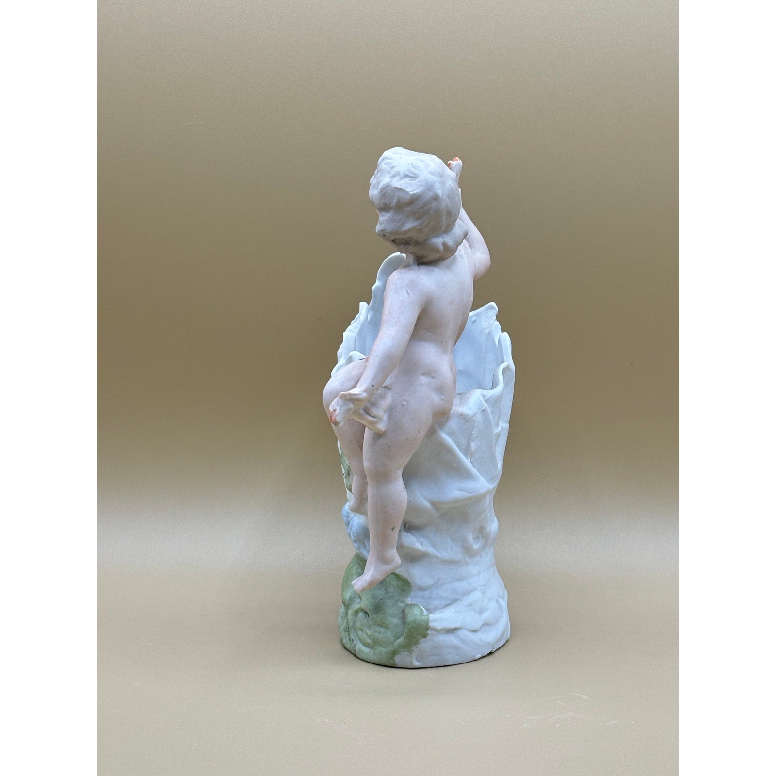 Charming vintage porcelain planter featuring a cherub figurine sitting on a decorative shell. Soft pastel colors with blue shell bowl, coral accents, and sage green base. Small barely noticeable chip on back of shell. Number 7331 carved into bottom.