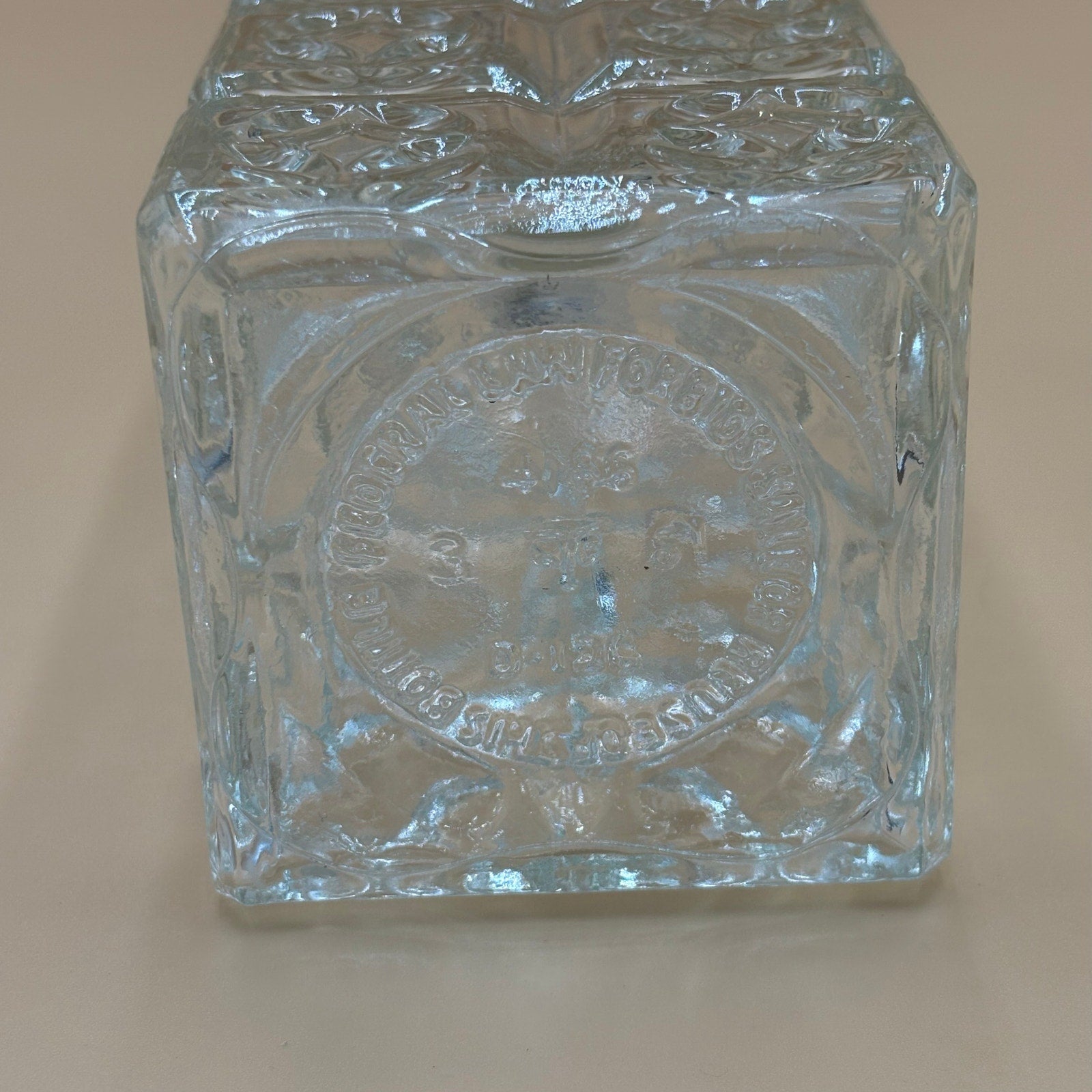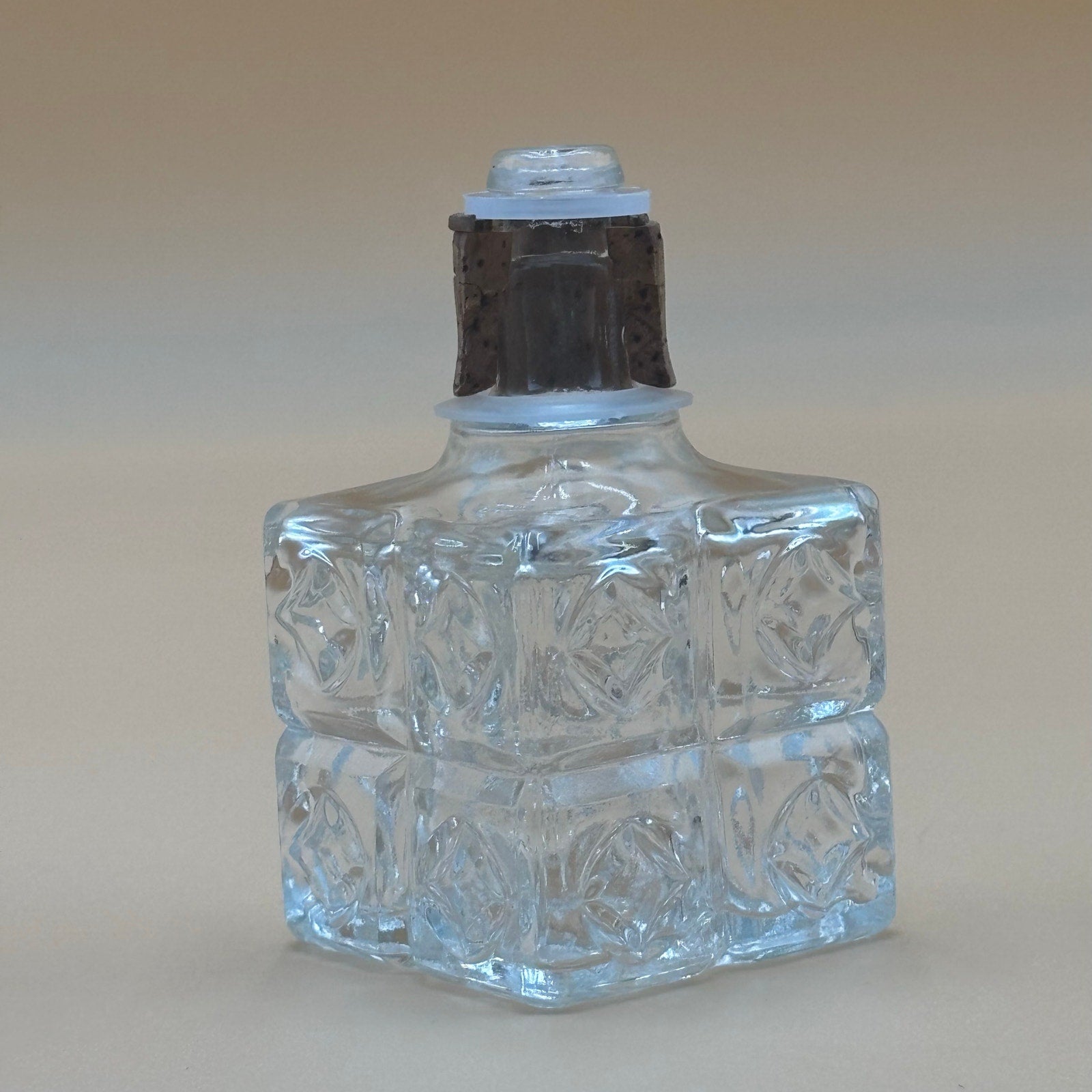 Beautiful vintage clear pressed glass decanter featuring intricate diamond cut pattern and geometric designs throughout. Square shape with elegant detailing makes this a striking display piece for your bar or collection. Needs a new cork.