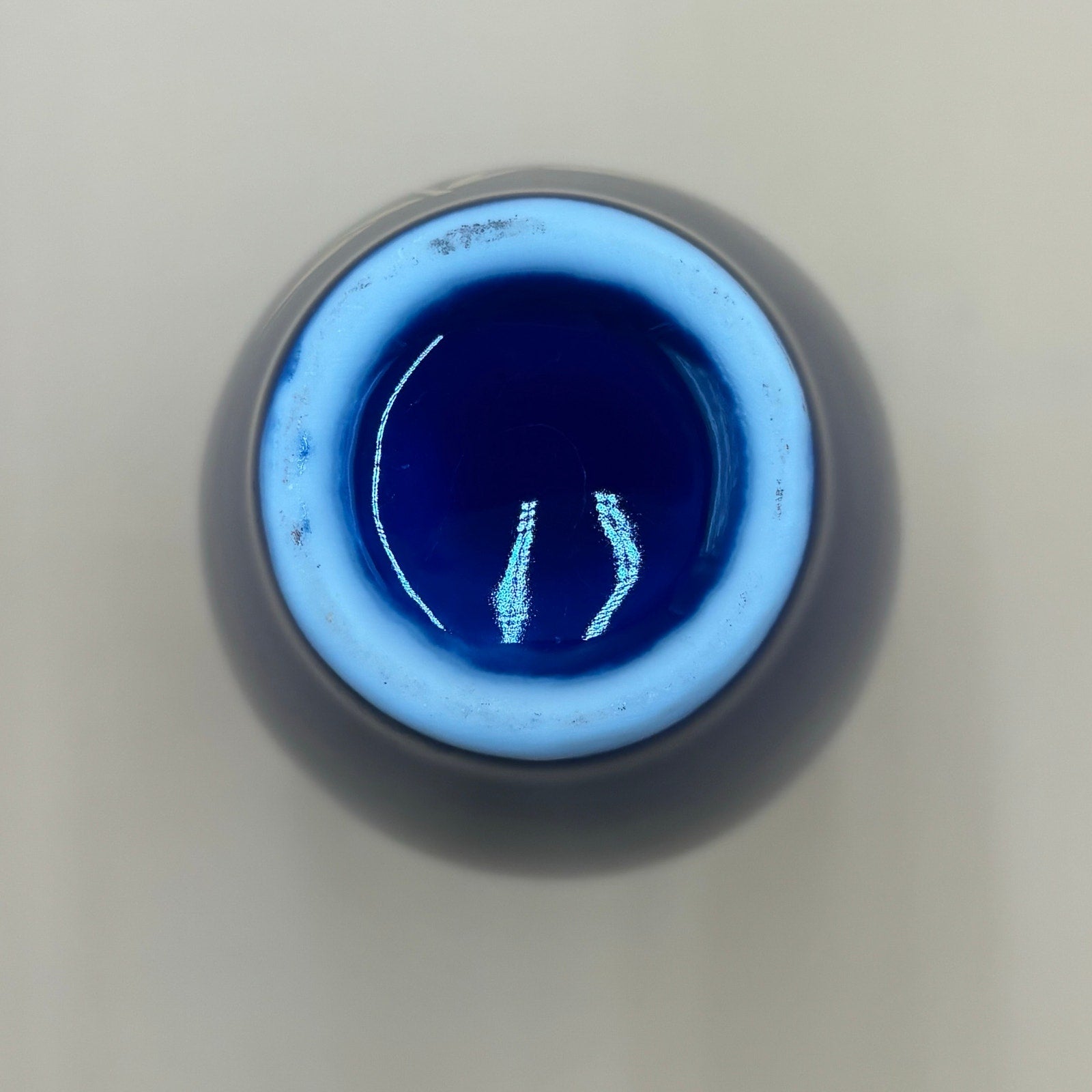Small vintage vase in glossy cobalt blue with gold bamboo design. Flared rim and smooth, reflective surface. Unmarked on the base. Great for minimalist shelf styling or display as-is.