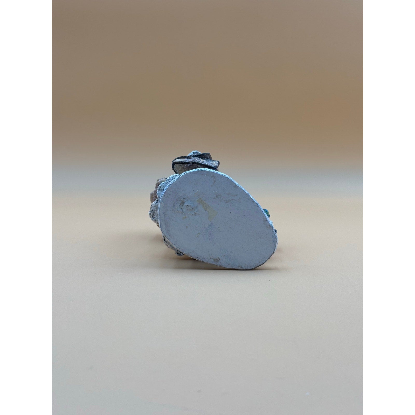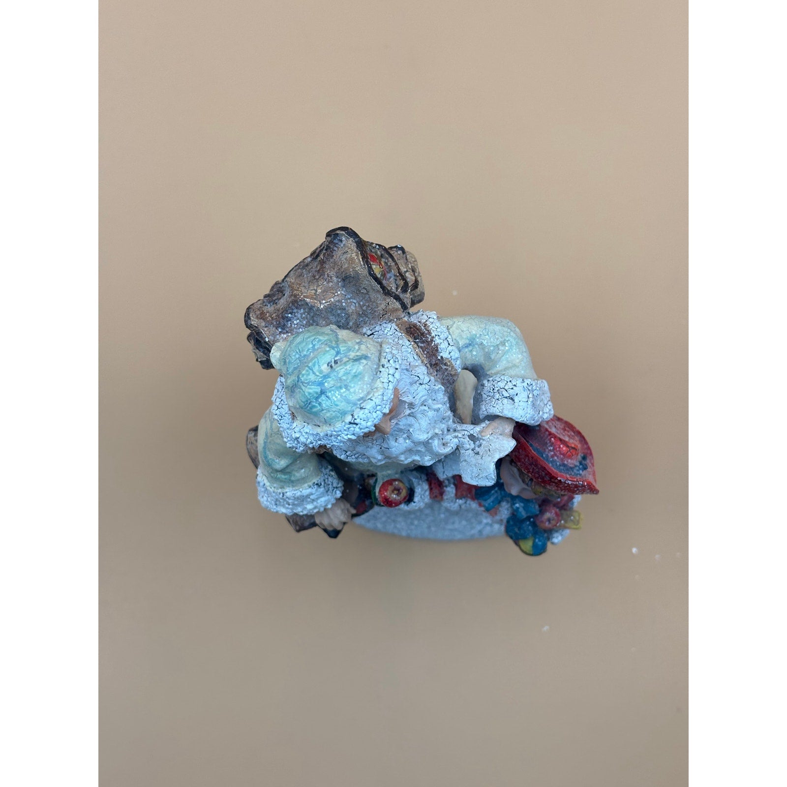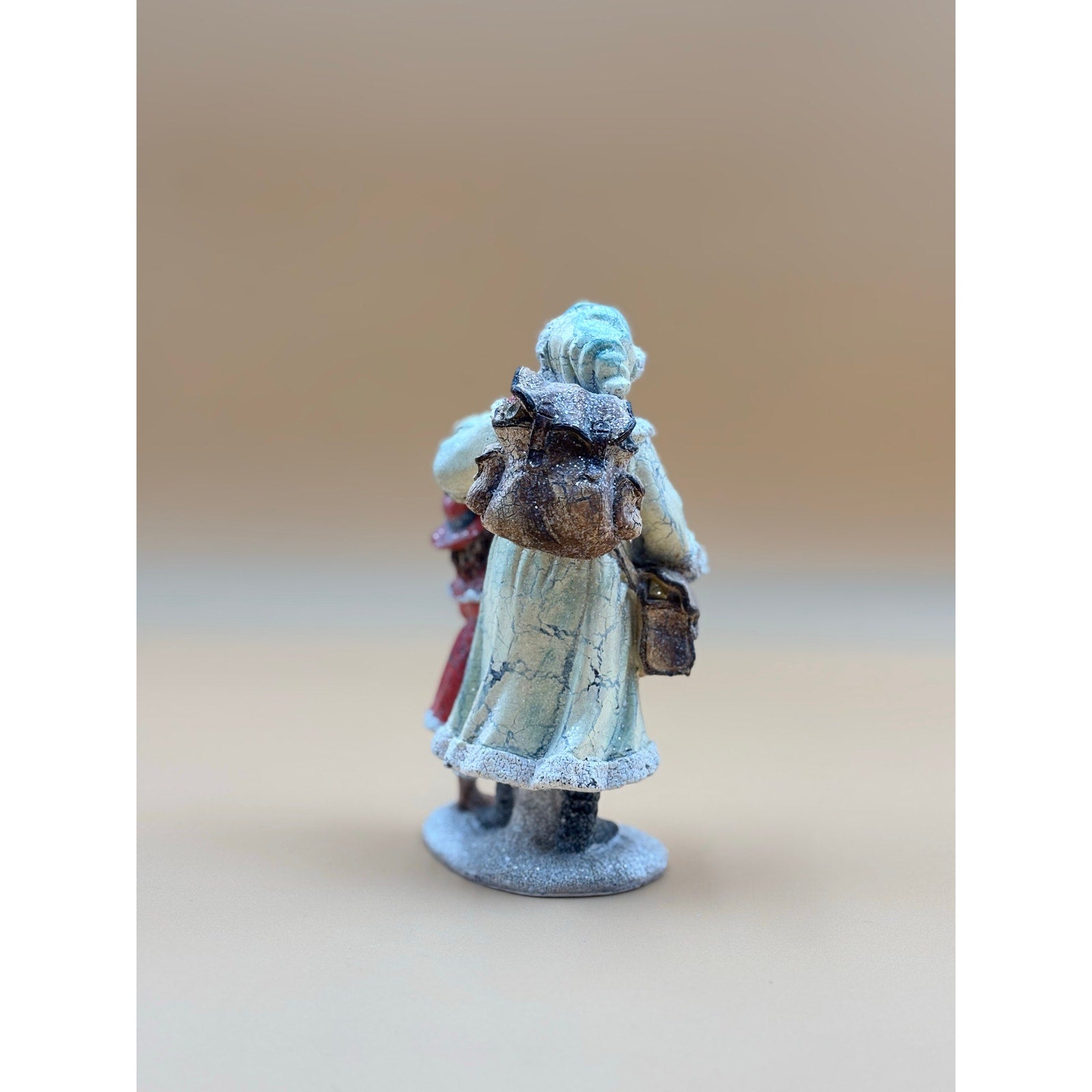 Charming vintage Santa and girl figurine with a textured crackle glaze and light glitter finish. Hand-painted in cream, red, and green tones for a rustic holiday look.