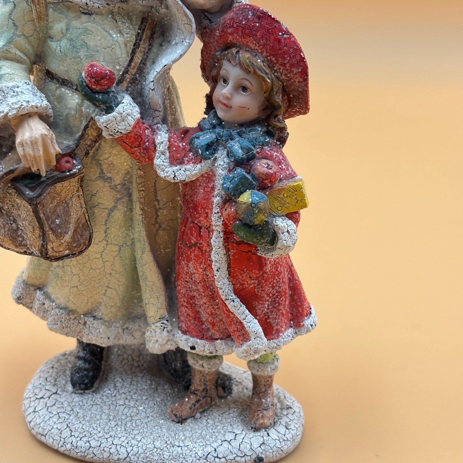 Vintage Crackle Santa and Girl Figurine with Glitter Finish