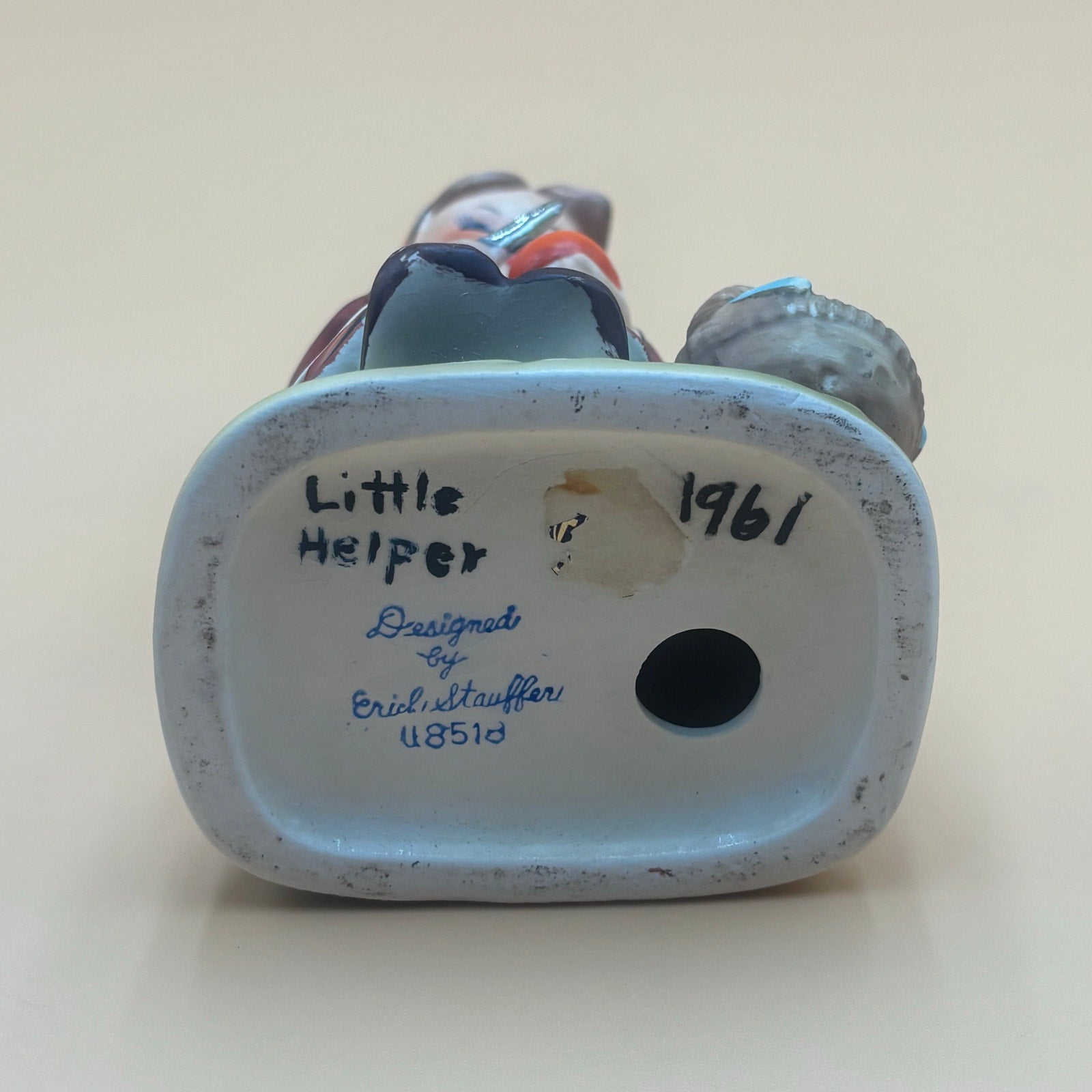 Charming vintage Erich Stauffer porcelain figurine featuring a girl in pink headscarf and apron peeling/cutting apples with a knife. Includes a basket of red apples beside her. Hand-painted with delicate details in vibrant colors. Officially marked "Designed by Erich Stauffer" with number 48512 on bottom, plus a handwritten note "Little Helper 1961" added by previous owner.