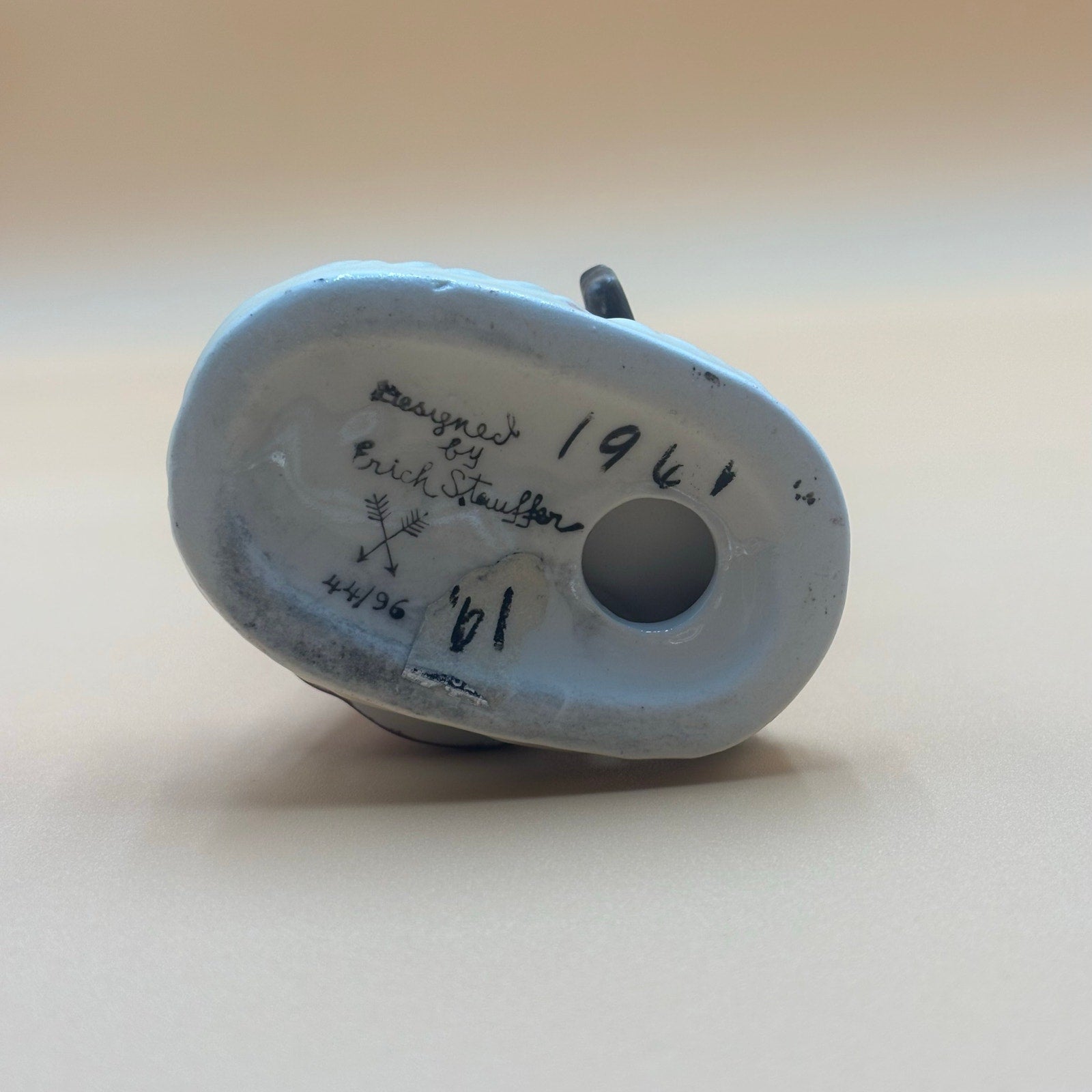 Charming vintage figurine designed by Erich Stauffer featuring a girl in pink bonnet and burgundy dress playing a small lyre, with a white duck beside her. Sweet farmyard scene with wooden fence detail on mint green base. Bottom marked "Designed by Erich Stauffer" with production number 44/96 and handwritten date "1961" added by previous owner or collector.
