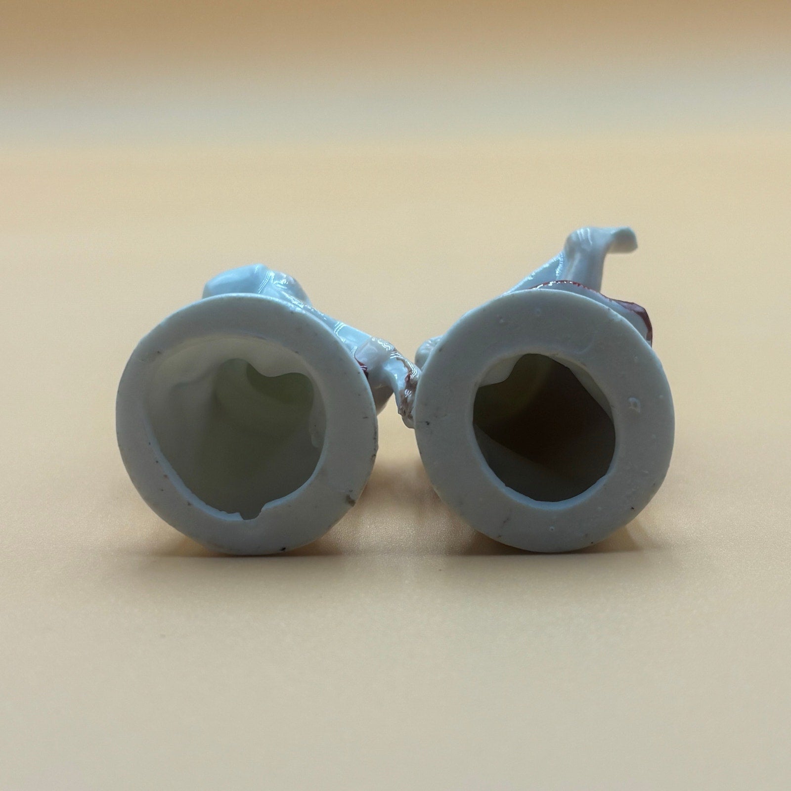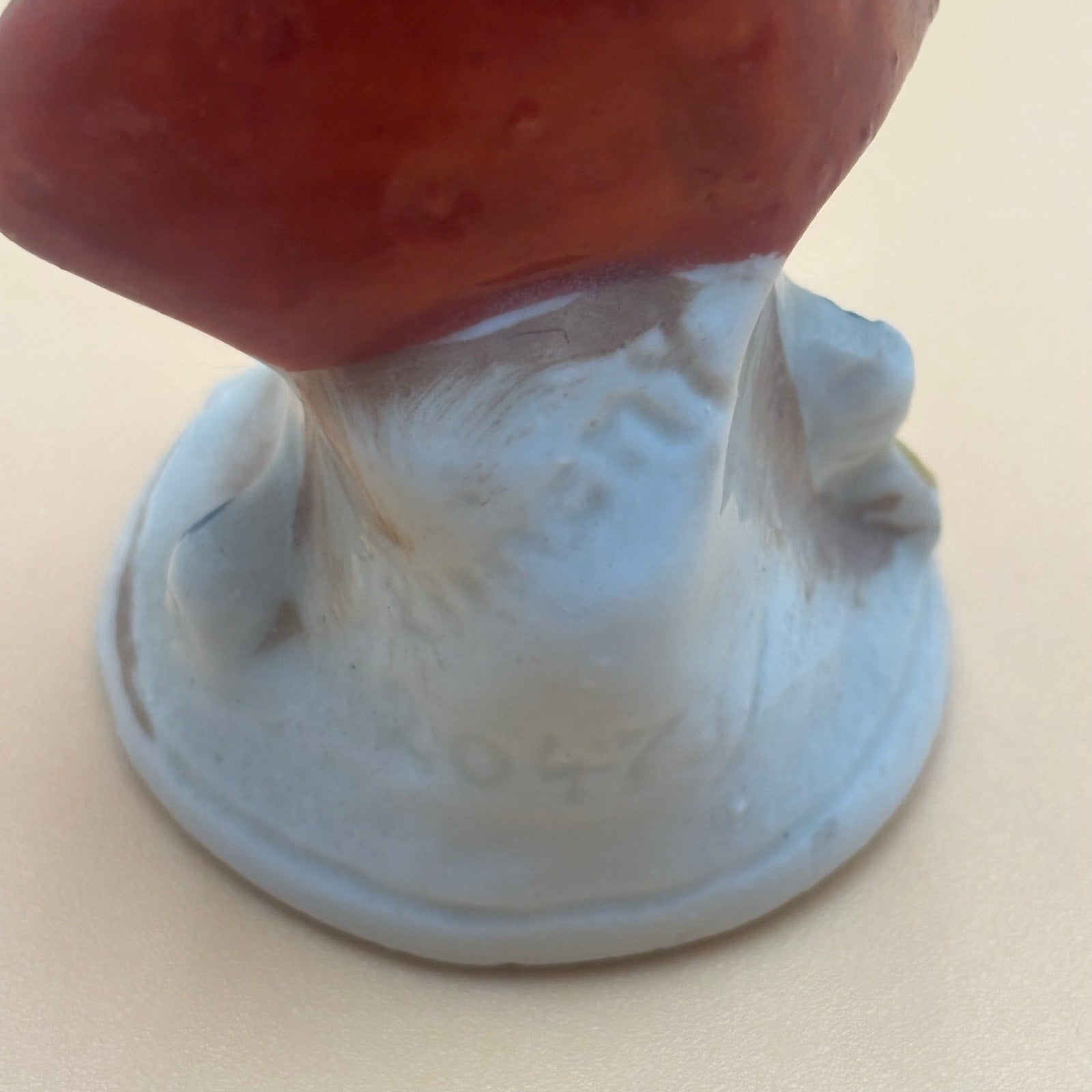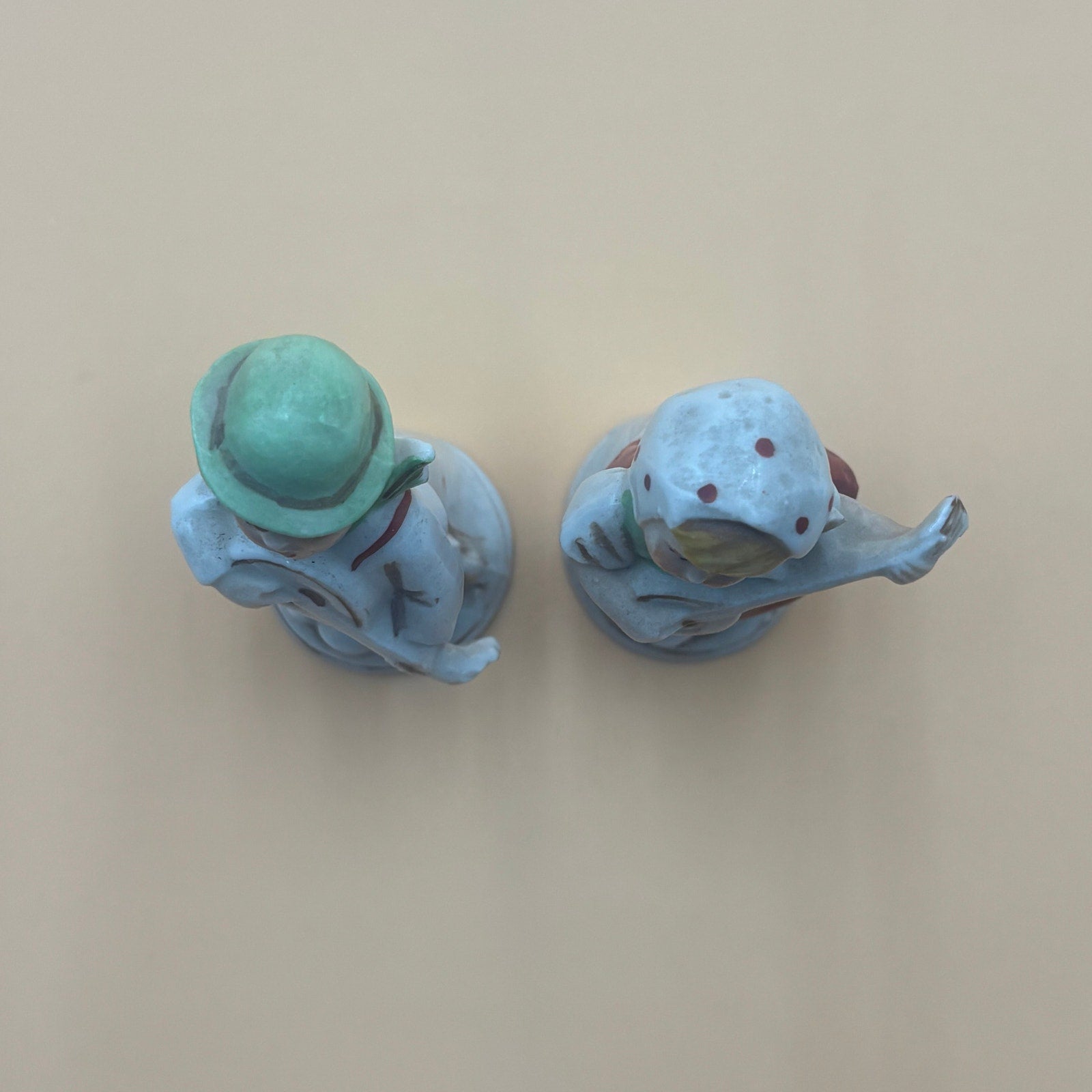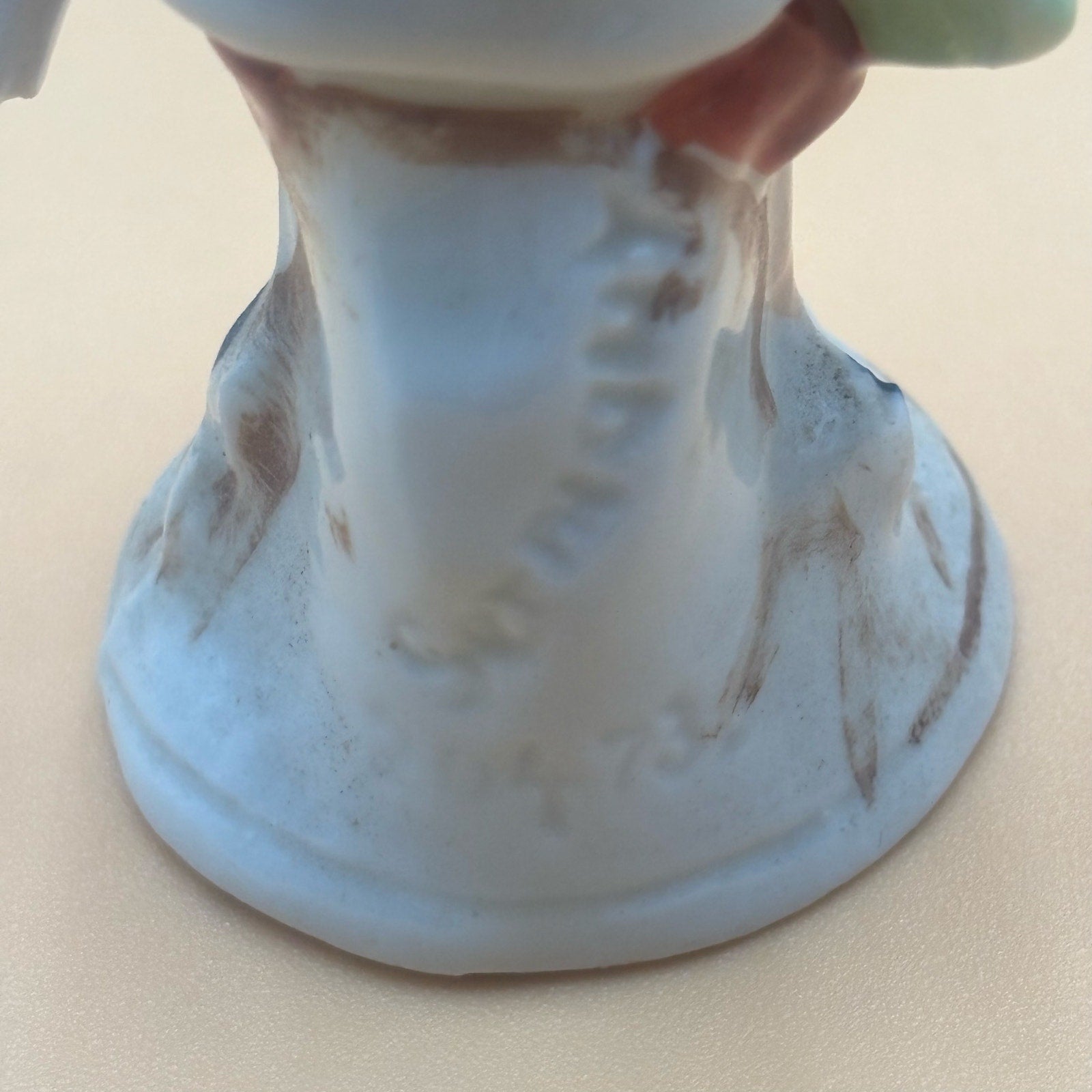Charming pair of vintage German porcelain figurines featuring traditional Oktoberfest folk musicians. Set includes girl in polka dot headscarf with red skirt playing guitar and boy in mint green hat with red shorts playing mandolin. Both showcase delicate hand-painted details, rosy cheeks and lace-trimmed socks. Bottom marked "Germany 20473". Wonderful examples of traditional European figurine craftsmanship.