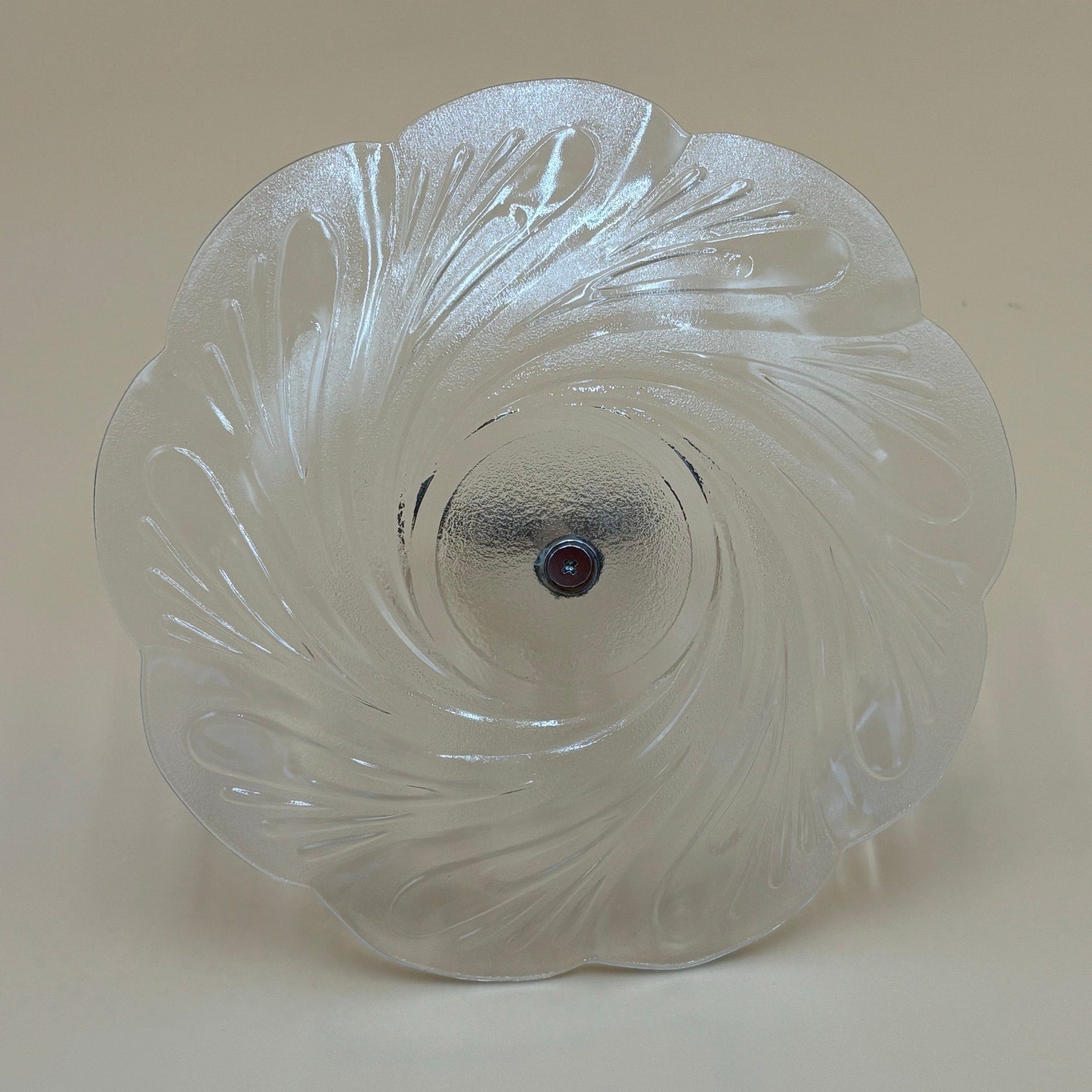 Elegant vintage glass serving dish featuring a decorative silver-tone center handle. Perfect for displaying candies, nuts, or small treats. This charming piece adds vintage flair to any table setting or buffet.