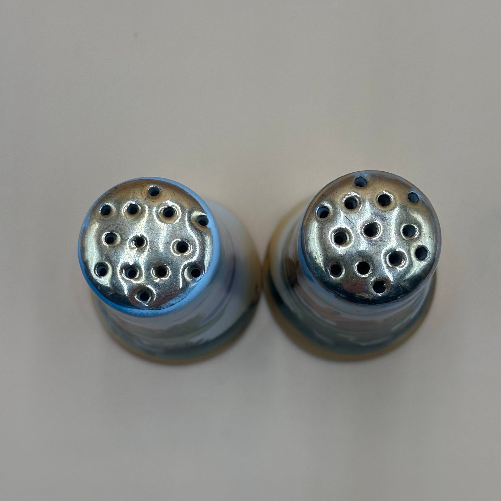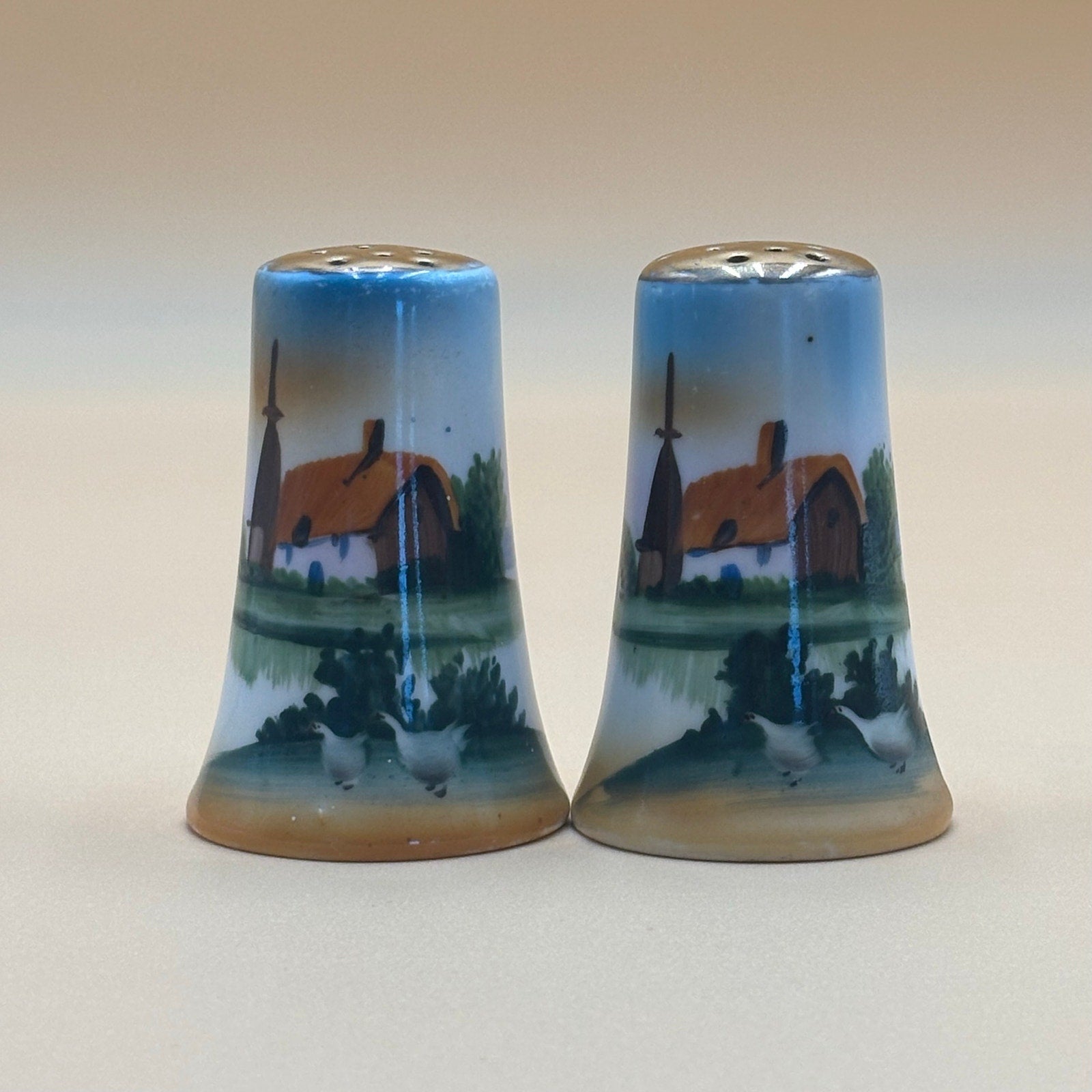 Charming vintage salt and pepper shaker set featuring hand-painted Dutch countryside scene with windmill, thatched cottage, and pond with flying geese. Beautiful blue sky to green landscape color gradient. Gold-tone perforated tops. Made in Japan.