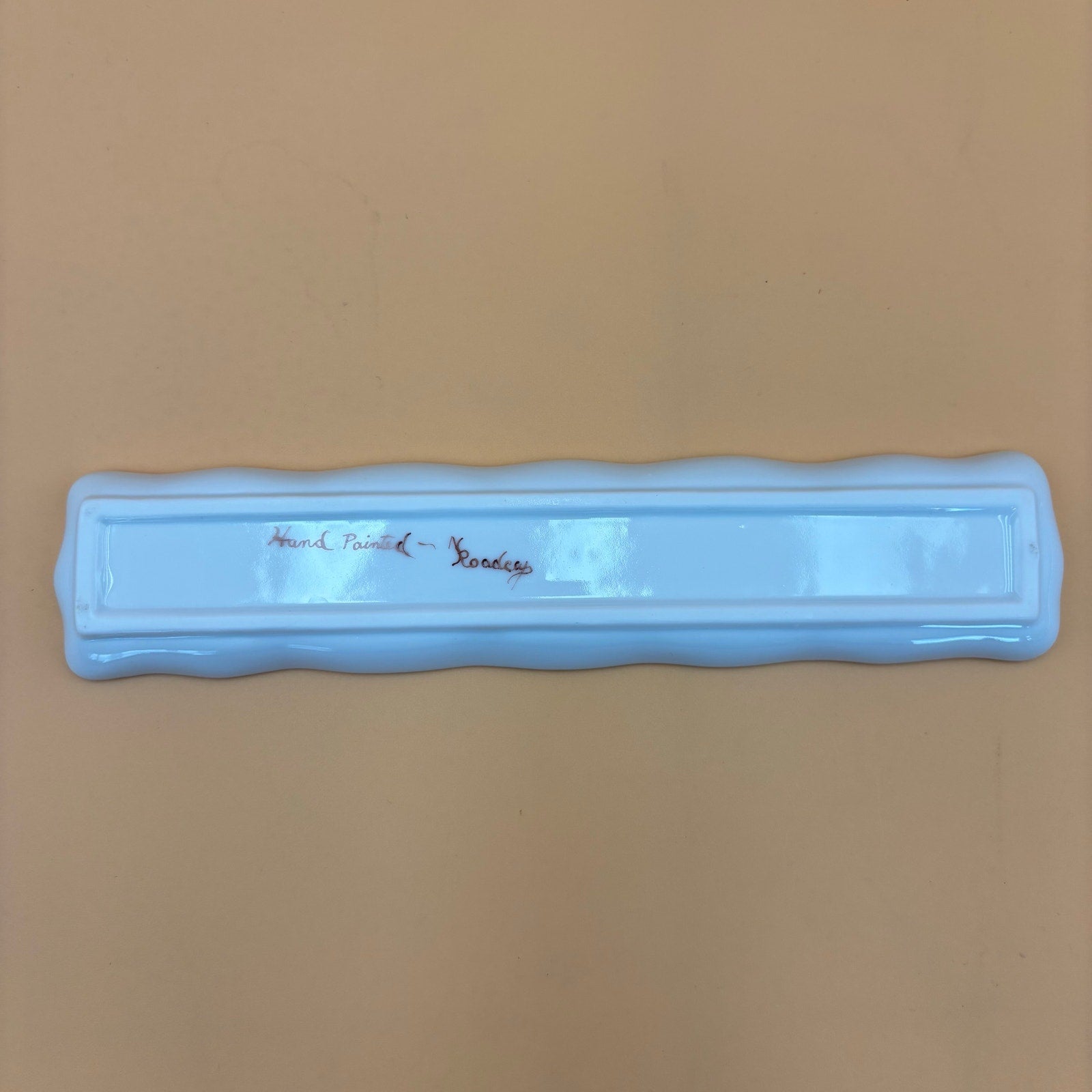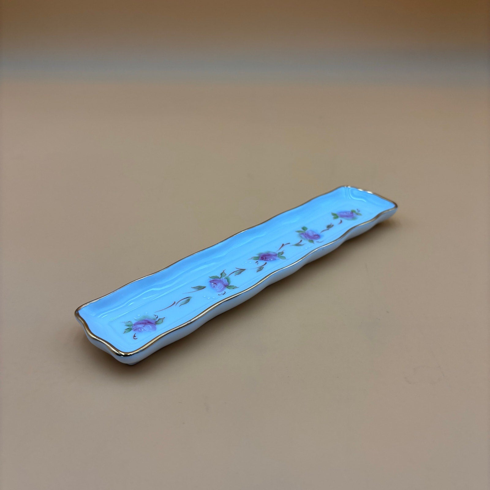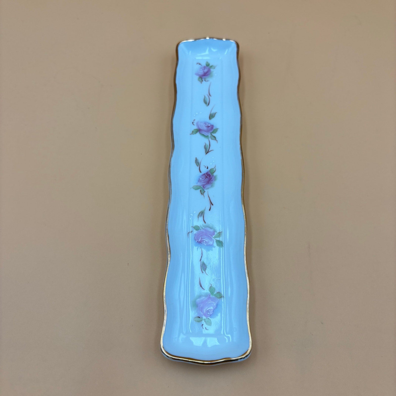 Delicate hand painted porcelain tray featuring soft pink roses with green leaves, a light blue hue around the florals, and raised white dot accents. Edged with gold trim along the scalloped rim. Underside is marked “Hand Painted” — additional wording is unclear.