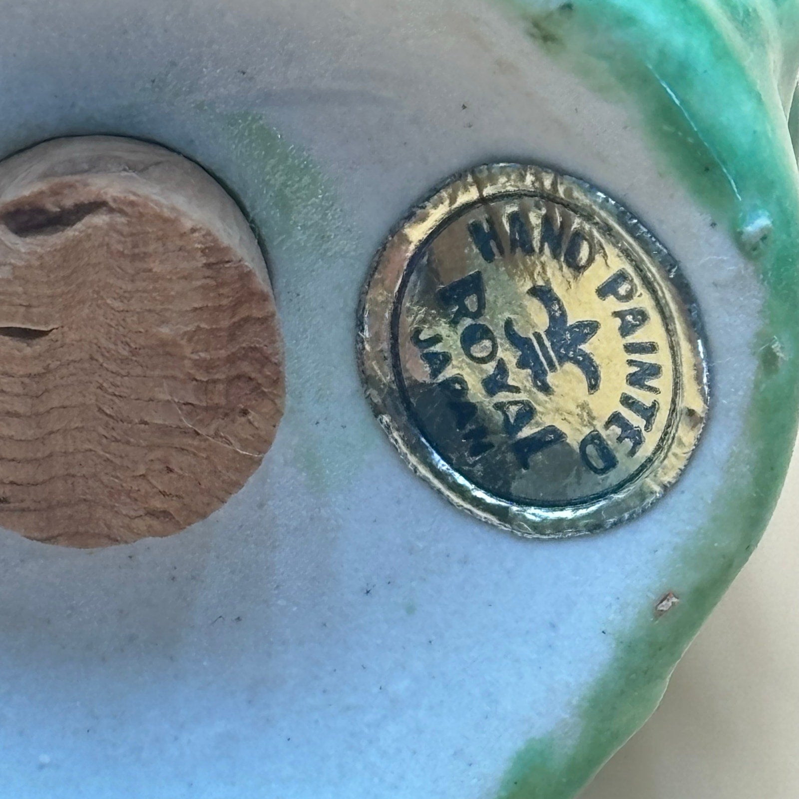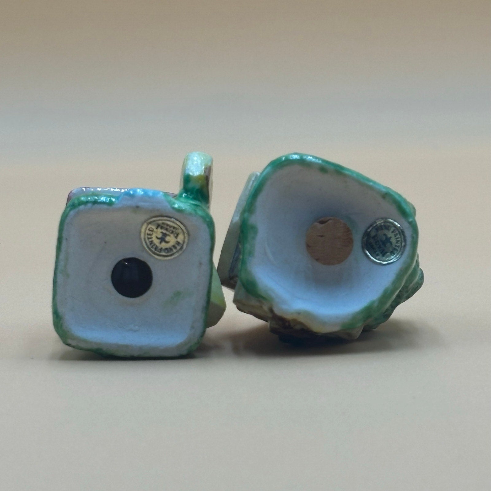 Adorable vintage miniature windmill salt and pepper shakers made in Japan. This charming set features a water wheel mill and a traditional windmill with red and yellow sails, both with detailed hand-painted accents and green grassy bases. Original "Hand Painted Royal Japan" stickers on bottoms authenticate these sweet collectibles.