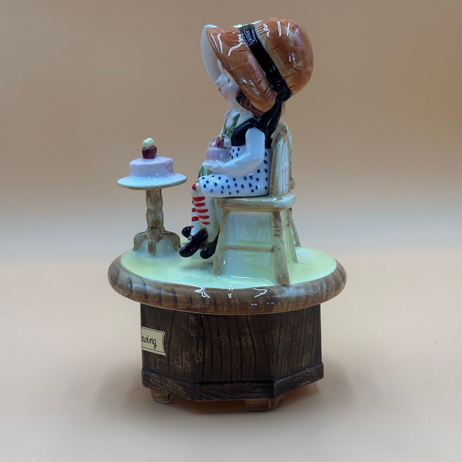 Charming vintage American Greetings Holly Hobbie music box featuring two children seated at a table with birthday cake. Made in Japan with high-quality ceramic figures on a wooden-look base. Features classic Holly Hobbie styling with bonnets, striped socks, and sweet details like the teddy bear companion. The music box plays when wound and the label reads "Happy Candle Blowing." A nostalgic collectible from this beloved character series.