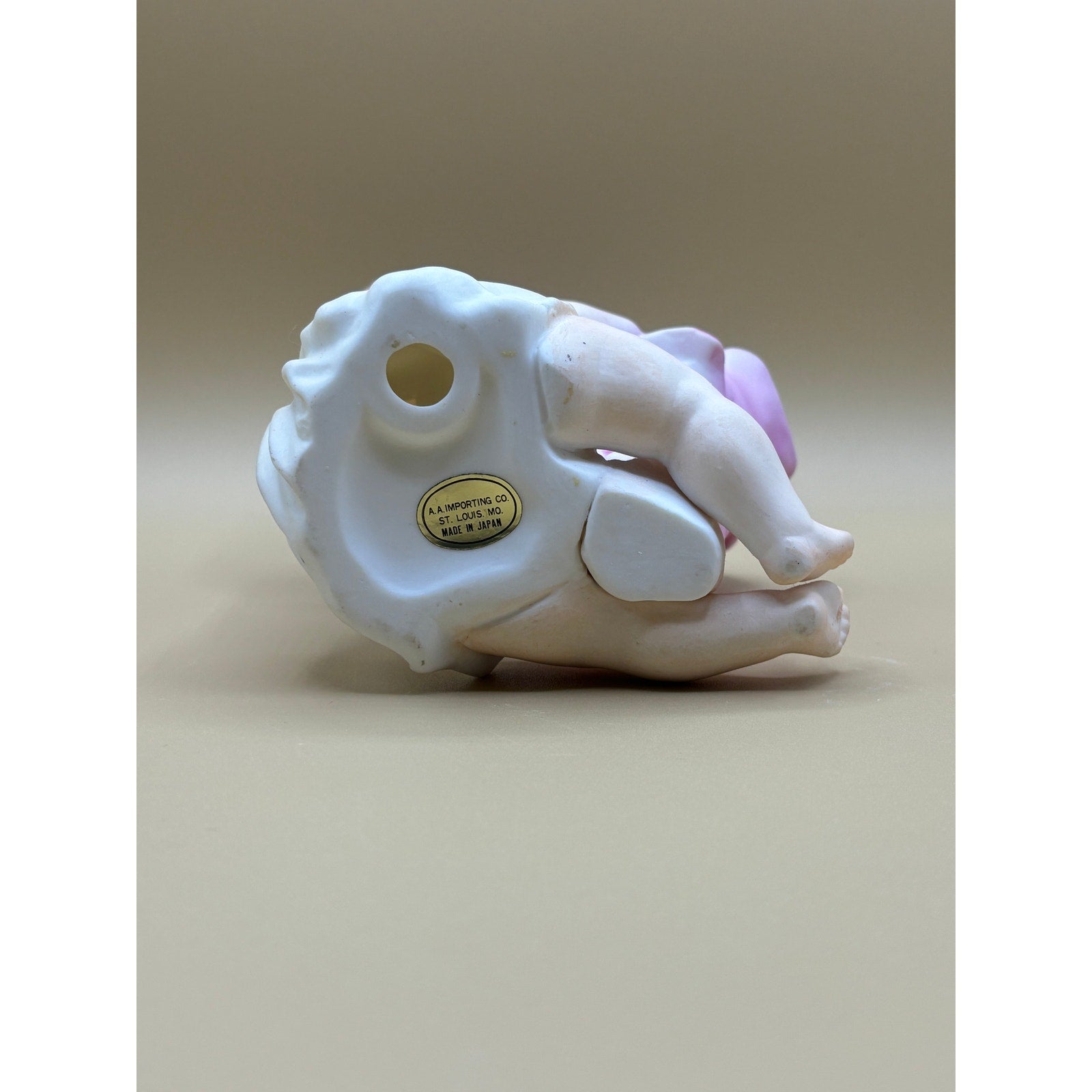 Made in Japan by A.A. Importing Co St Louis • Sweet girl figure in blue and white dress with floral details • Pink tulip vase design • High-quality bisque material