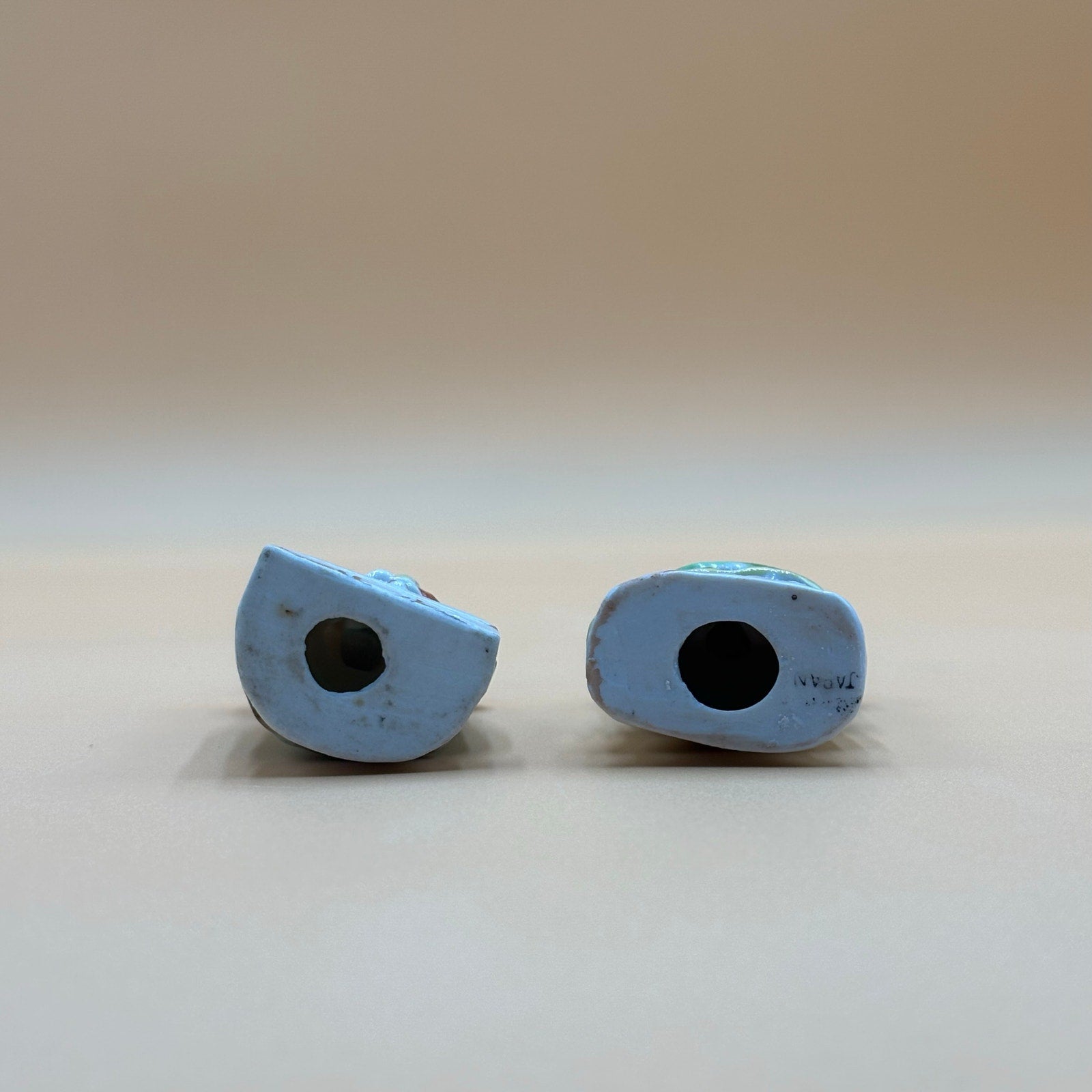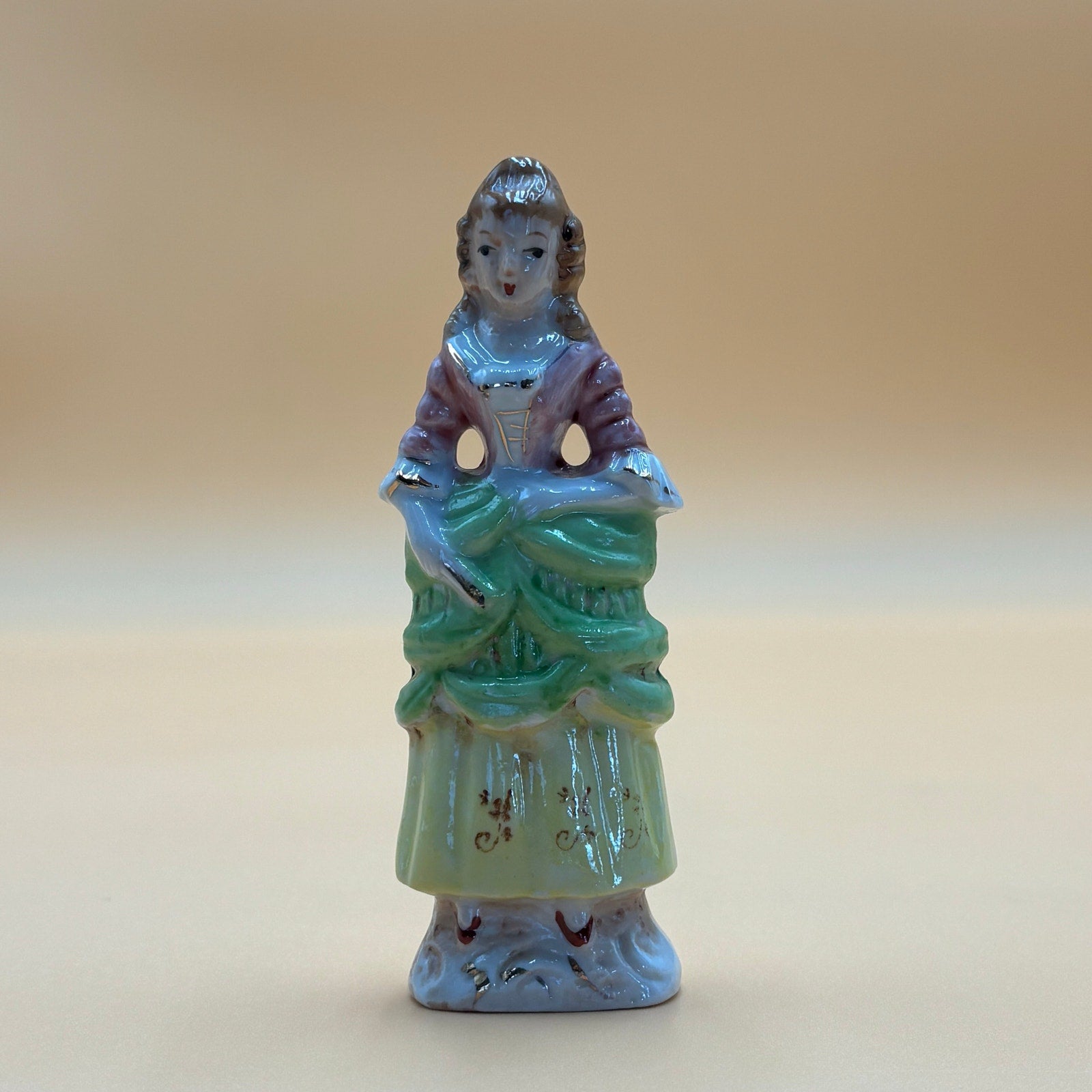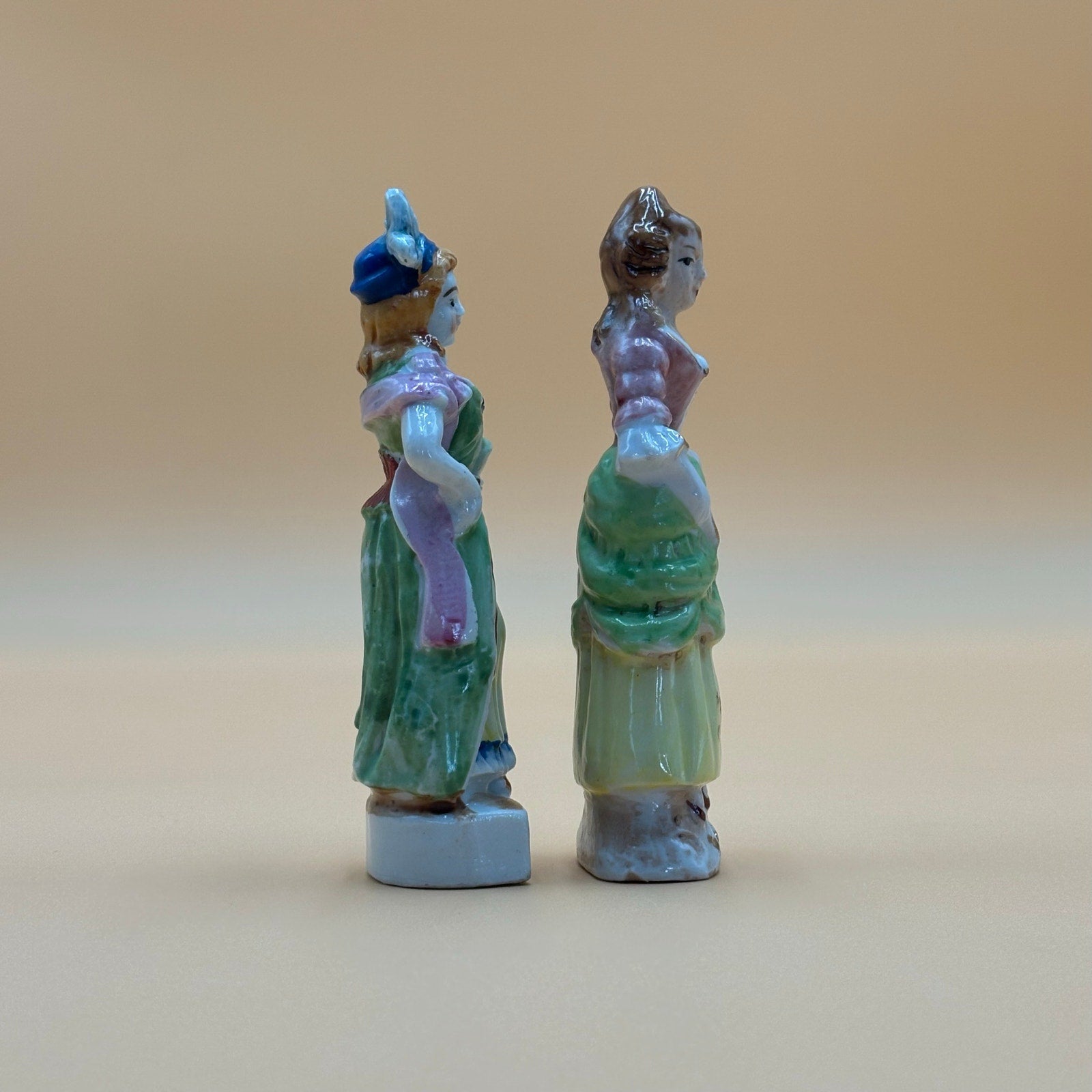 Charming pair of Japanese-made porcelain figurines depicting colonial-era ladies. One with blue hat and red sash, the other with mauve jacket and green skirt. Vibrant colors with "Japan" marking on bottom. Perfect for collectors or vintage decor display.