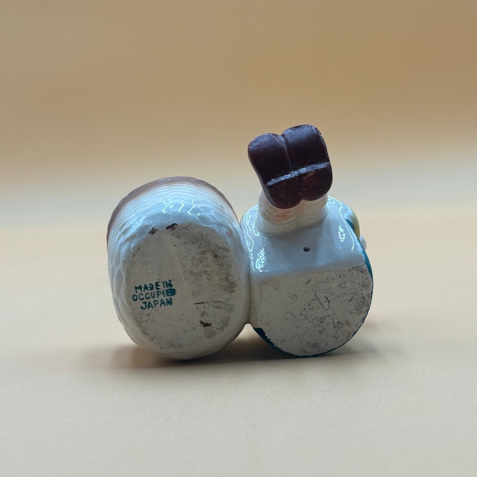 Charming vintage Japanese ceramic figurine featuring a young girl in blue top and yellow polka dot skirt with orange hair bow holding blue flowers. Attached to a small cylindrical planter/trinket dish perfect for small plants, jewelry or desk items. Sweet mid-century piece with delicate hand-painted details.