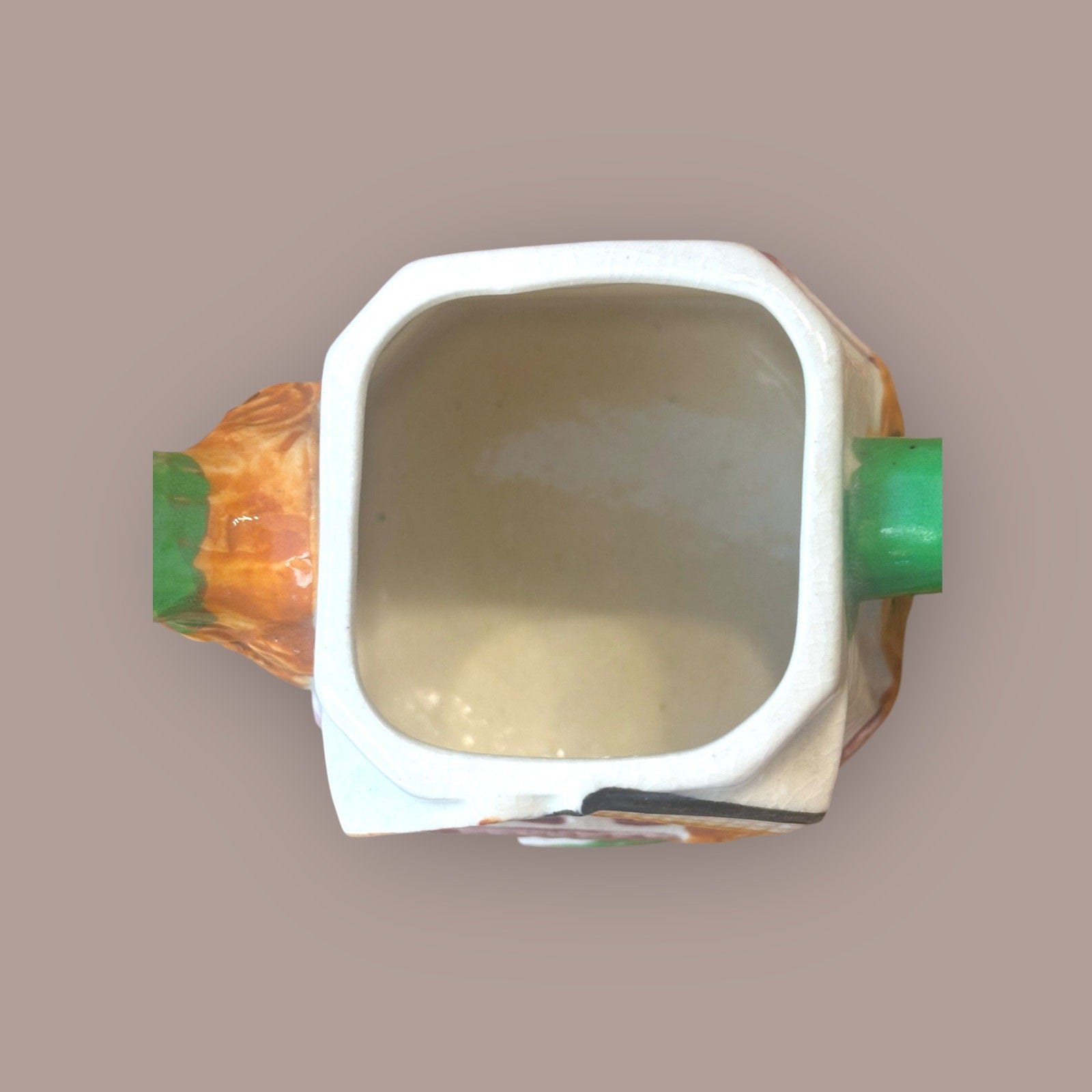 Mid-century Japanese teapot featuring a hand-painted windmill cottage design. Marked "Made in Japan". Brown and yellow colors with charming vintage appeal.