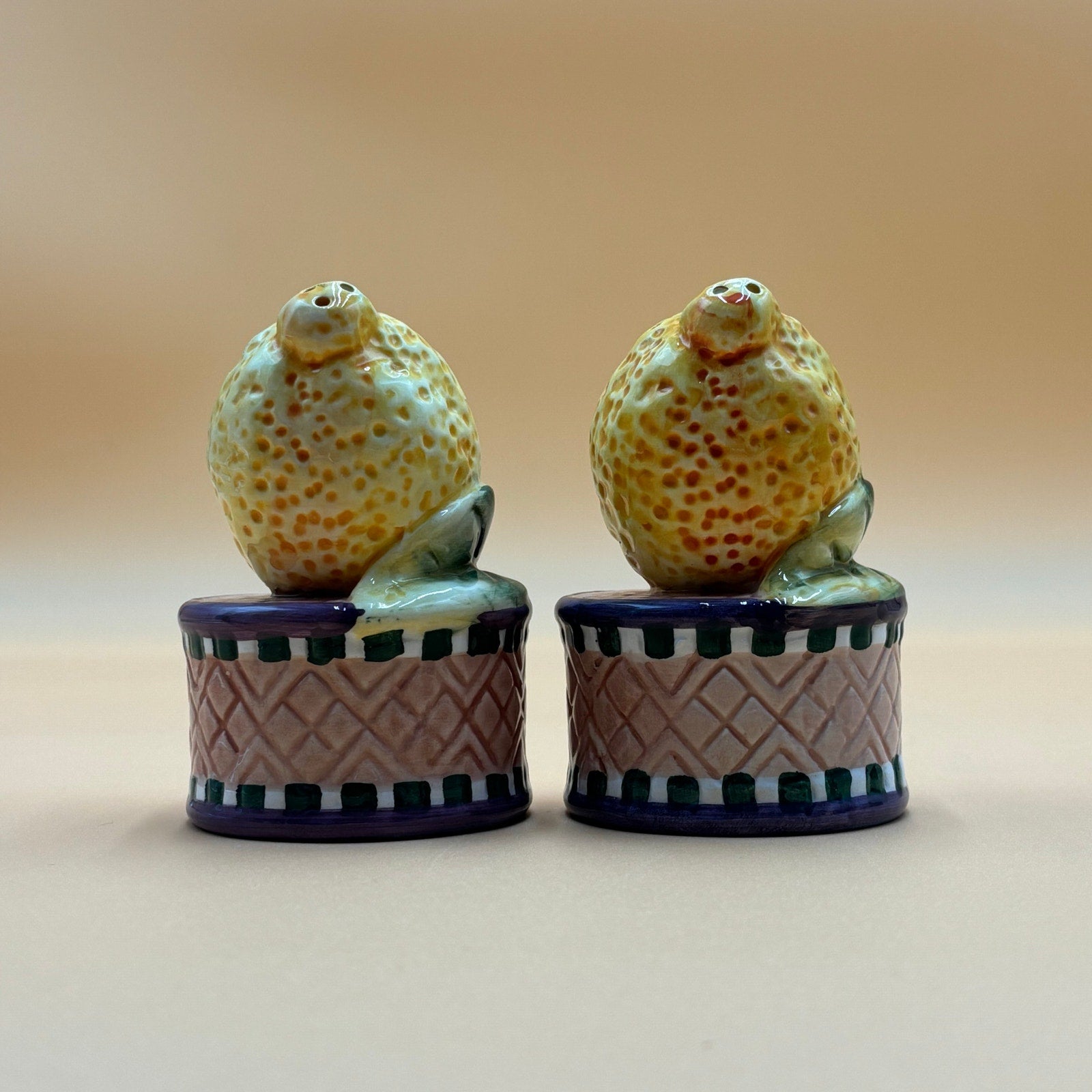 Charming vintage ceramic salt and pepper shakers shaped like lemons with green leaf accents. Each sits on a decorative base with pink lattice pattern and colorful trim. Marked "Made in China" on the bottom. Perfect for adding a pop of color to your kitchen or dining table.