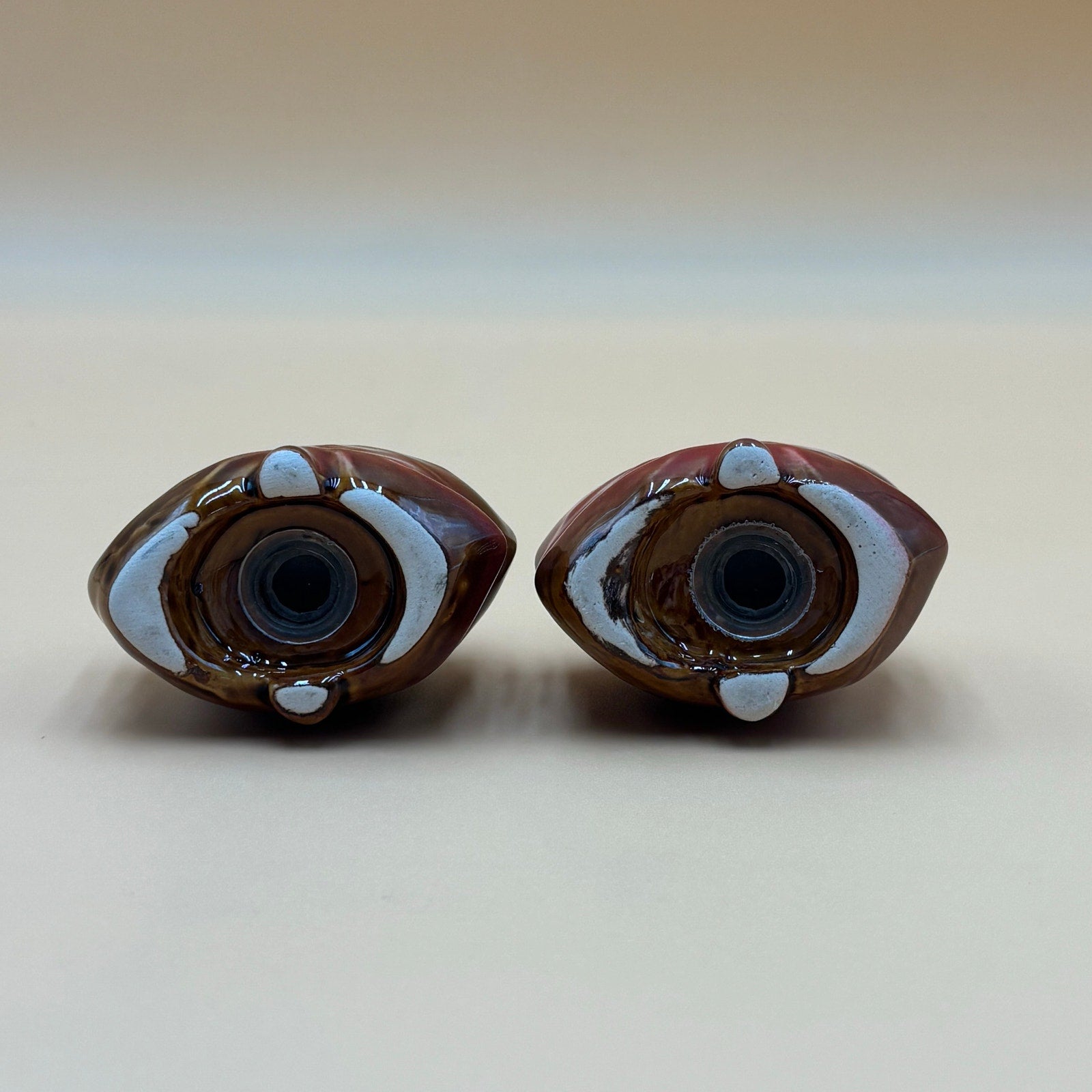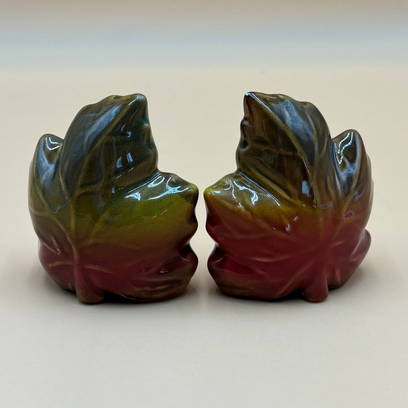 Charming maple leaf salt and pepper shakers with gorgeous autumn-inspired glazing that transitions from deep burgundy to golden yellow to forest green. Eye-catching artistic design with detailed veining and a glossy finish. Small touch-up needed on one shaker. A perfect statement piece for any fall table setting!