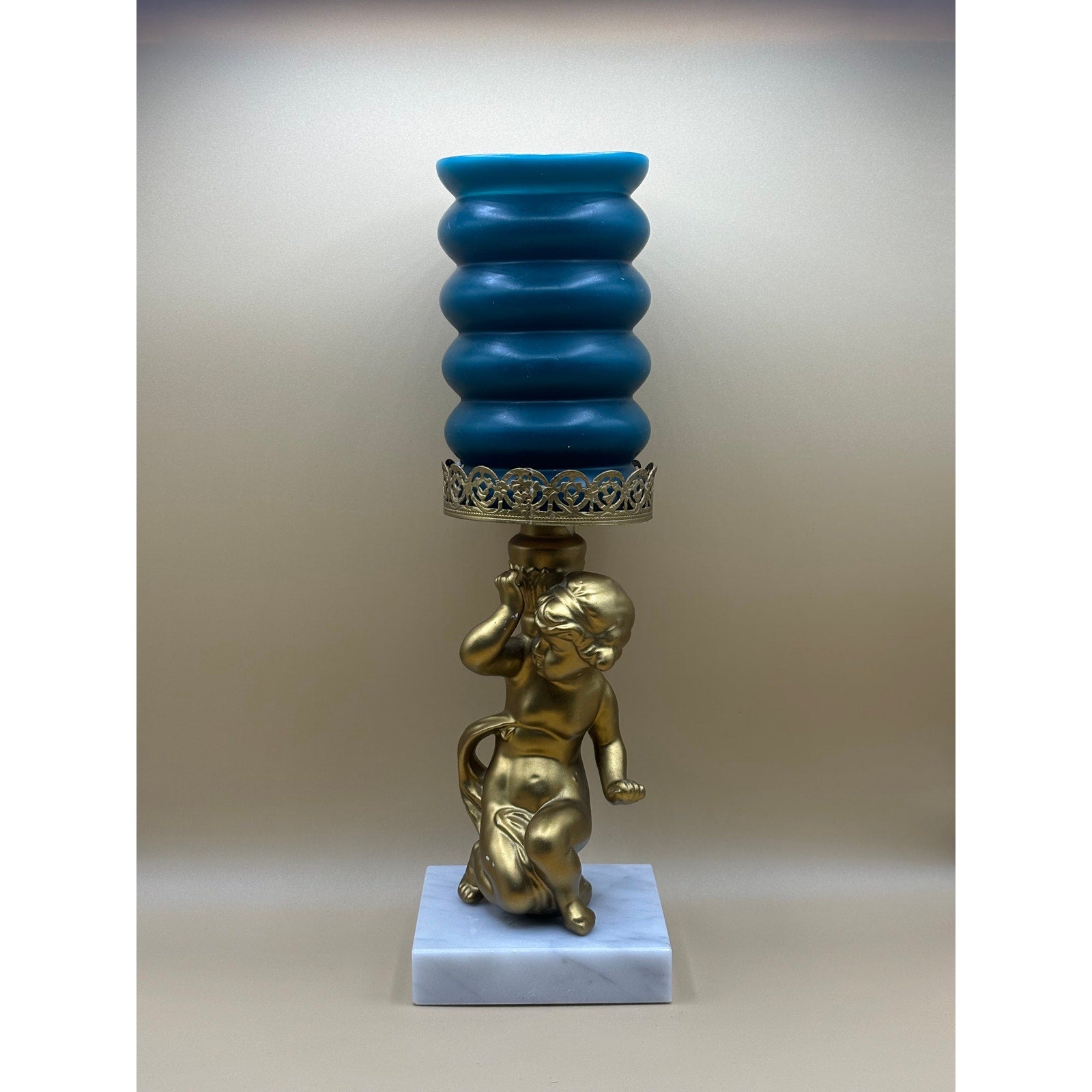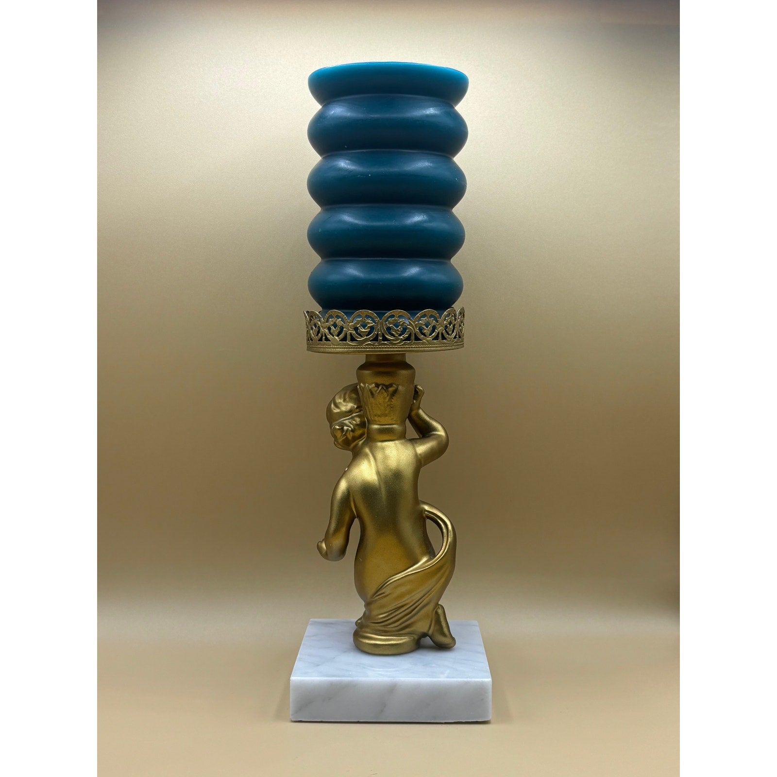 Metal gold cherub candle holder featuring a marble base. Gold finish has developed a nice aged patina. Note: small paint chips and nicks. Chip under the shoulder holder (only visible when turned upside down). Candle NOT included.