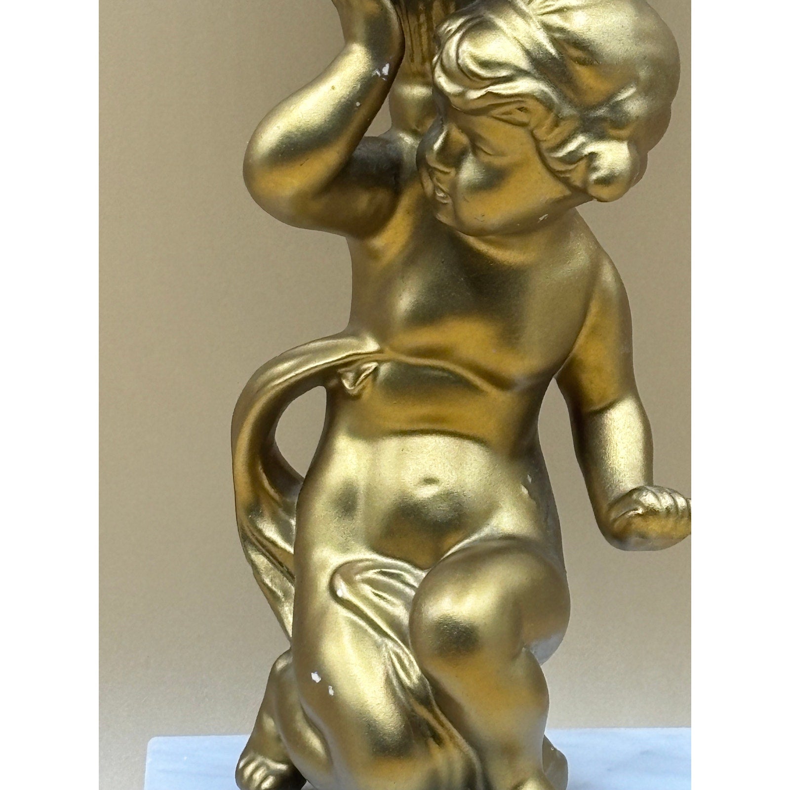Vintage Metal Gold Cherub Candle Holder with Marble Base 7.5 Inches Tall