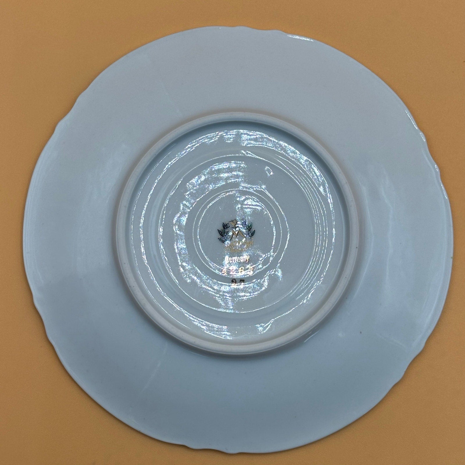 Beautiful vintage teacup and saucer set by Mitterteich Bavaria, Germany featuring delicate pink dogwood flowers with gold trim. The elegant white porcelain showcases hand-painted floral designs with a scalloped gold-trimmed edge on the saucer. Footed teacup has a graceful handle and sits perfectly on the matching saucer. Marked with the Mitterteich Bavaria logo, "Germany" and a date mark from around 1920.