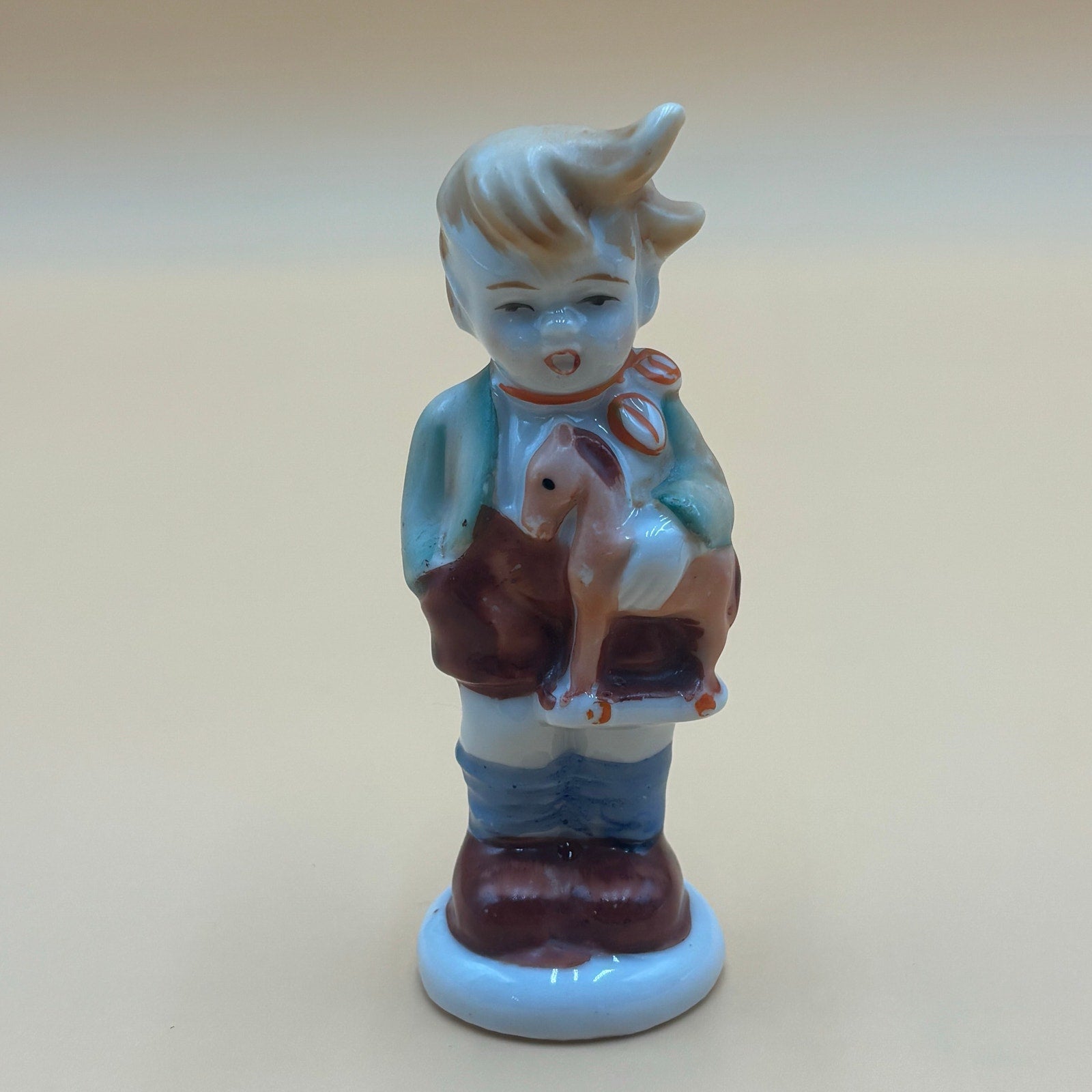 Charming pair of vintage Occupied Japan ceramic boy figurines. One features a boy with distinctive horn-like hairstyle holding a toy horse, the other a boy with hands in pockets. Sweet painted faces with blue details. Both marked "Japan" on the bottom. Occupied Japan items date from 1945-1952 post-WWII period.
