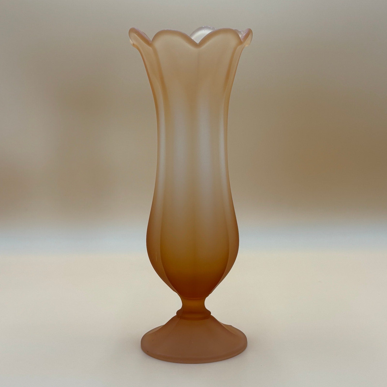 Beautiful vintage swung vase in frosted peach satin finish, likely by Westmoreland Glass or similar quality manufacturer. Features a distinctive tulip shape with elegant ruffled rim and graceful pedestal base. This classic piece showcases a lovely uniform peach color with the characteristic satin finish that collectors prize.
