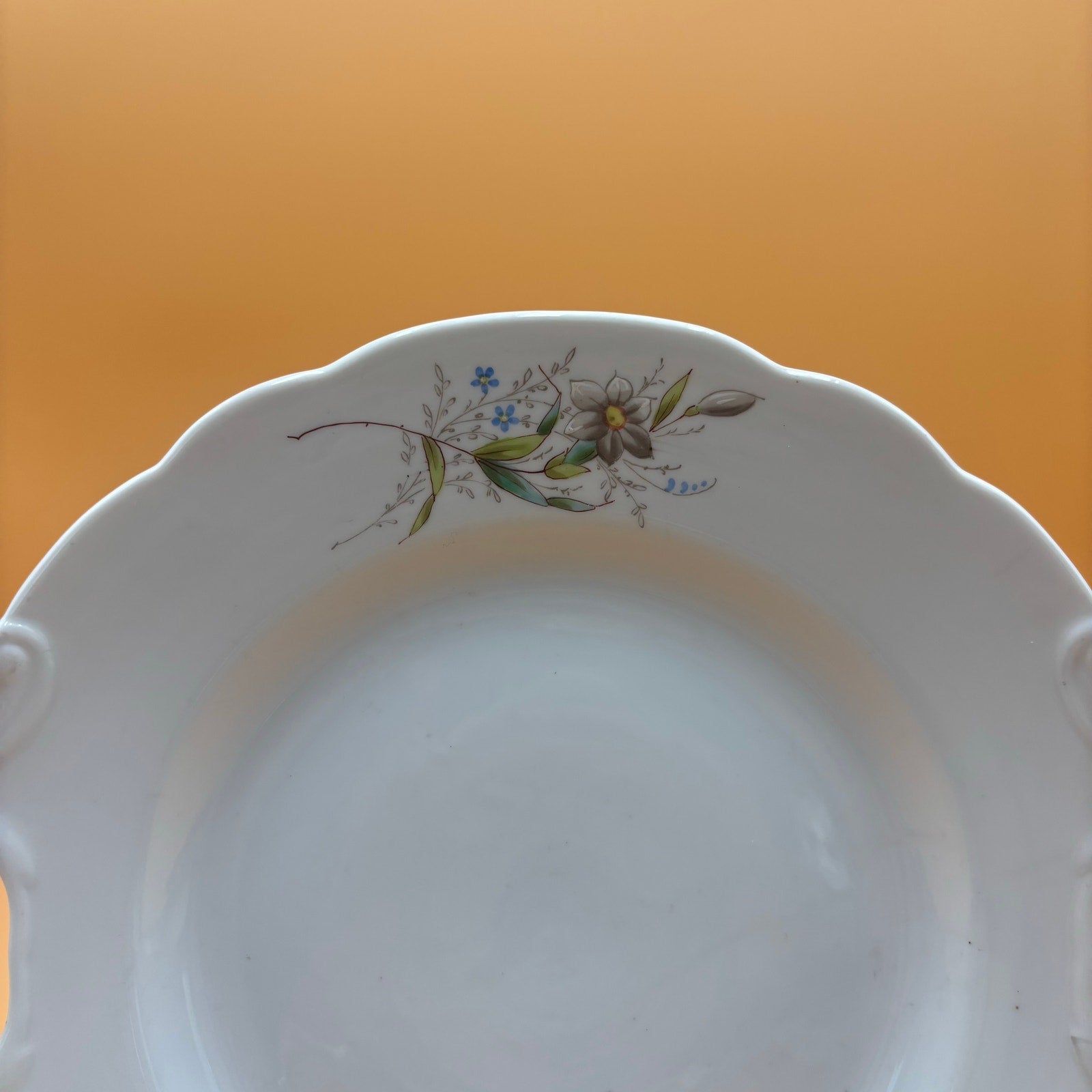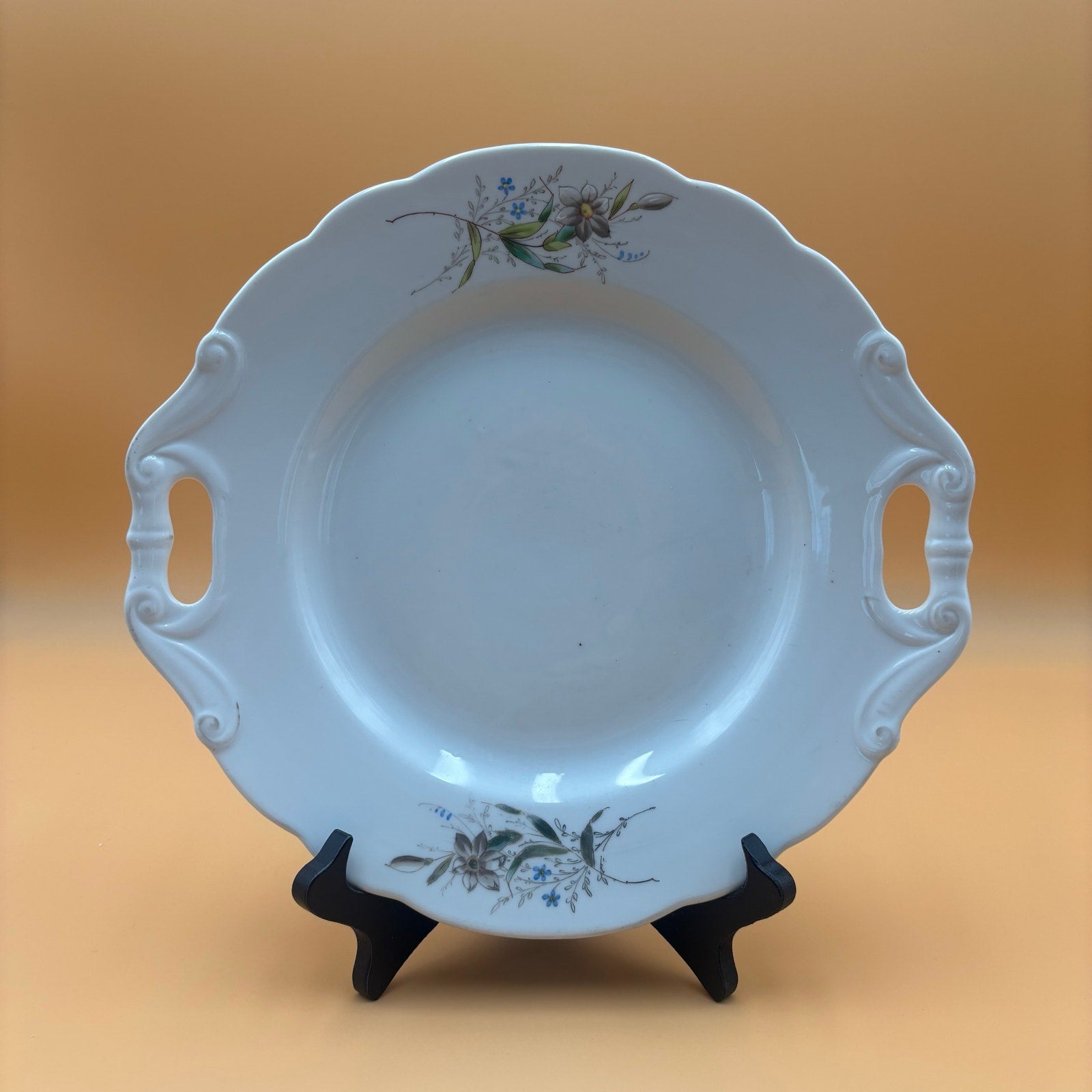 Vintage white porcelain handled serving plate featuring delicate brown, green, and blue floral motifs on opposite edges. Scalloped edges and embossed scroll handles add a touch of elegance. No makerβs mark visible.