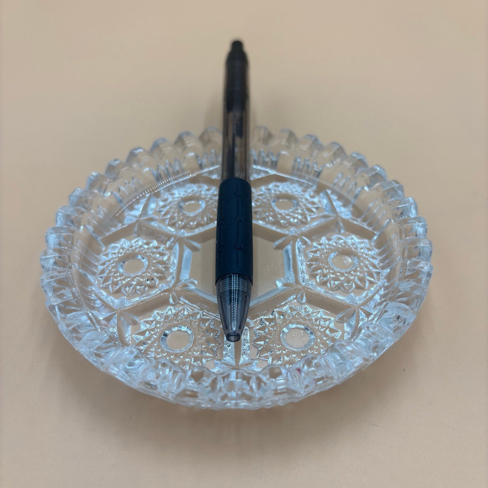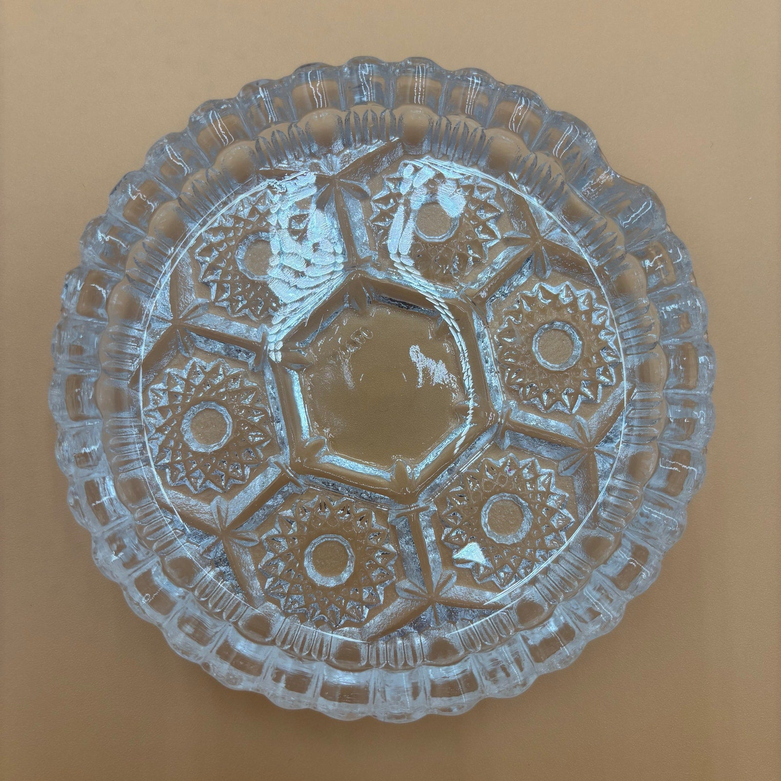 Beautiful set of 4 vintage pressed glass trinket dishes with a stunning hexagon and starburst pattern. These clear glass pieces feature a scalloped edge with ribbed detailing and a geometric design of 6 starburst medallions arranged in a circle. Originally designed as ashtrays but perfect for modern use as trinket dishes, ring holders, or decorative catchalls.