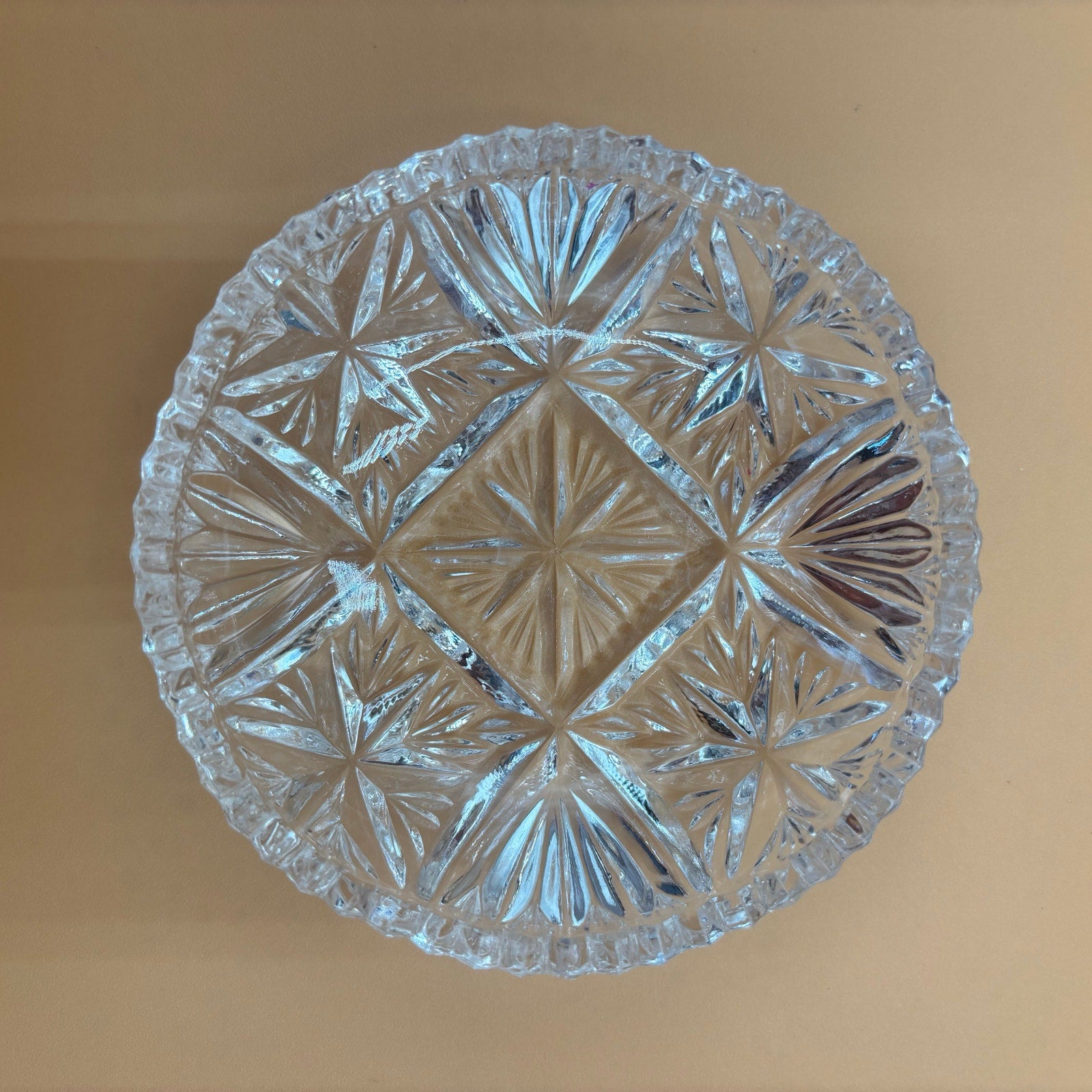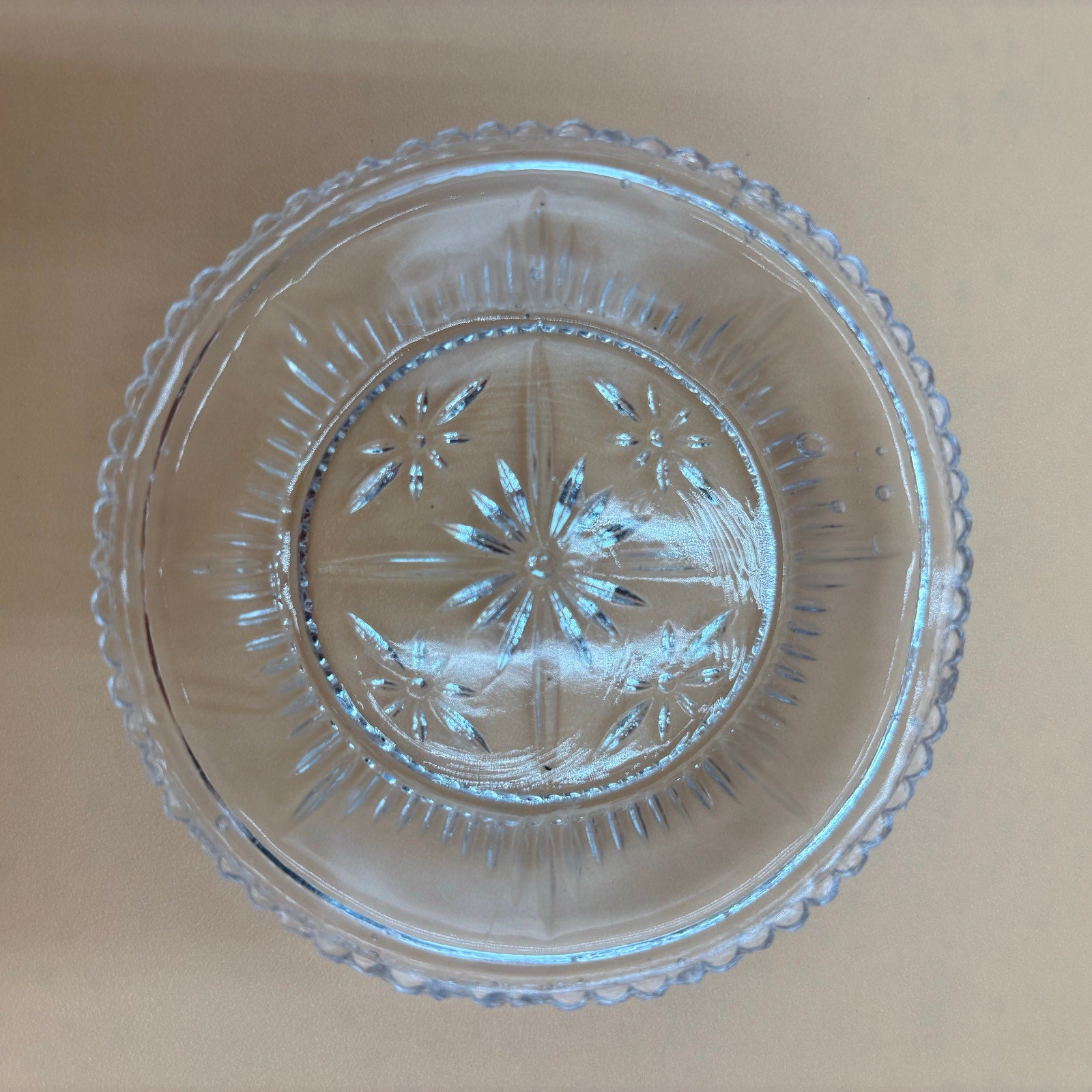 Collection of three vintage pressed glass trinket dishes with different beautiful patterns. Each features a scalloped edge and intricate star/floral cut designs in clear glass. These versatile pieces are perfect for holding jewelry, small accessories, or as decorative accents.