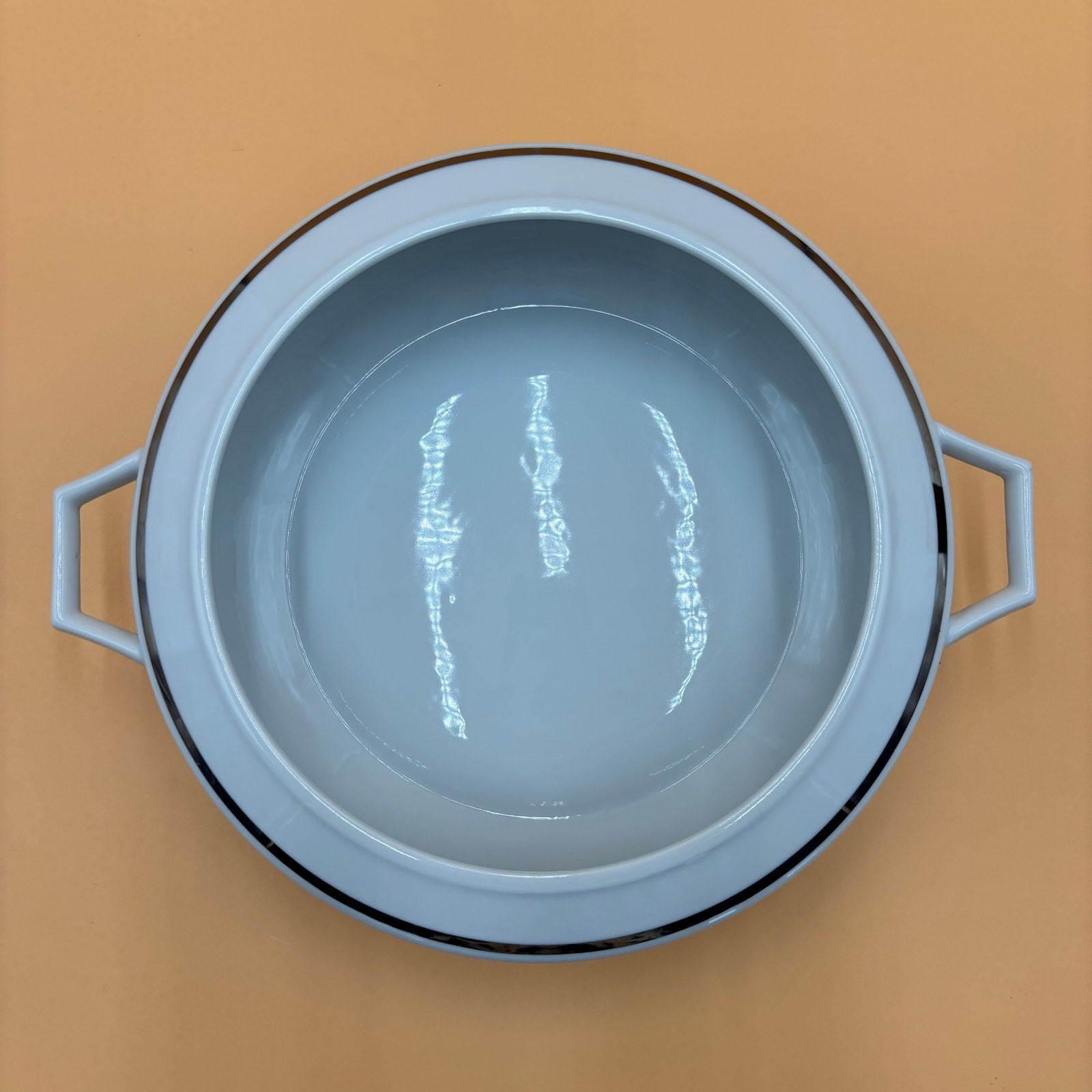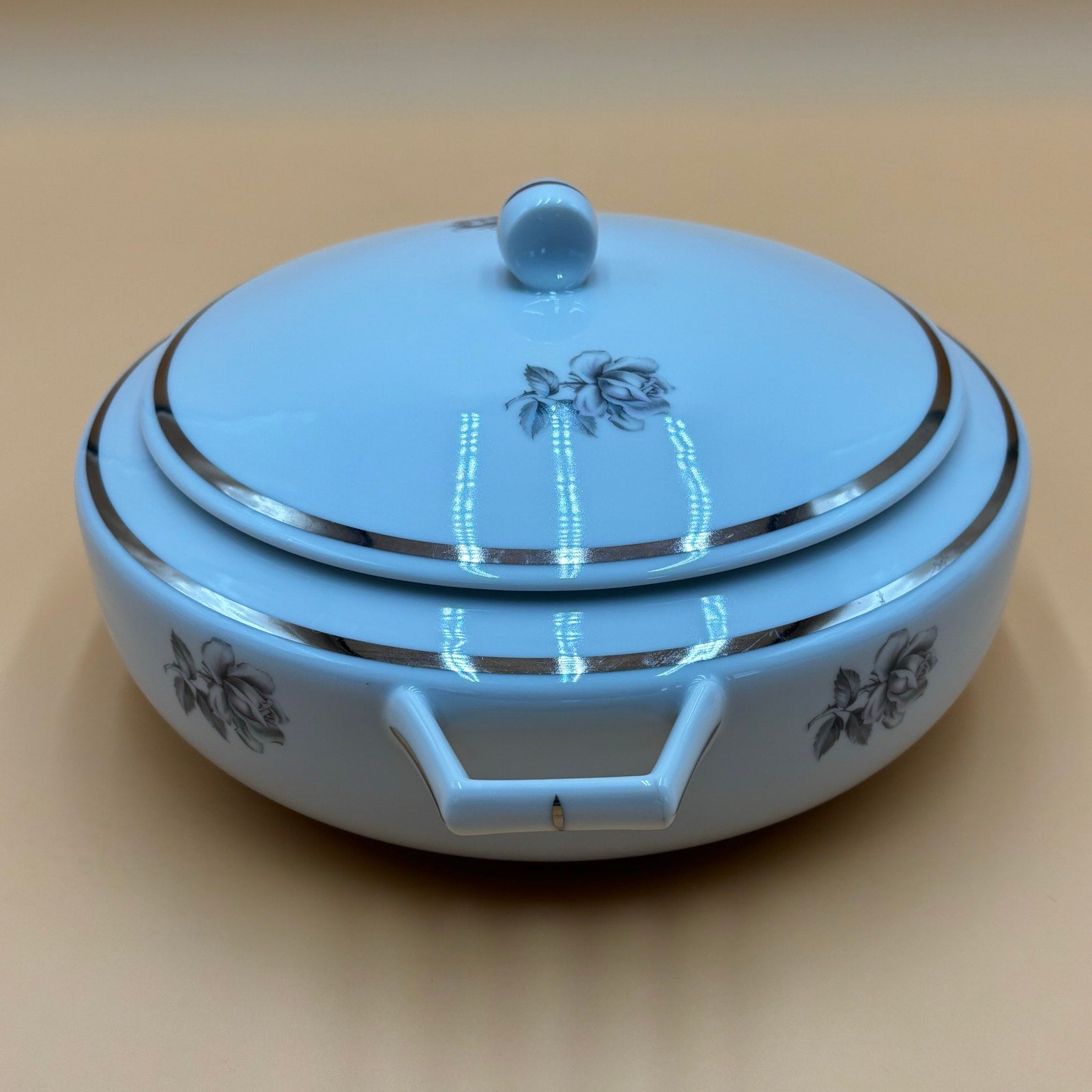 Elegant vintage covered casserole dish by Princess-Empcraft USA in the "Cameo Rose" pattern. Features delicate gray rose designs on white porcelain with platinum/silver trim bands. This beautiful piece includes a fitted lid with center knob handle and convenient side handles for easy serving.