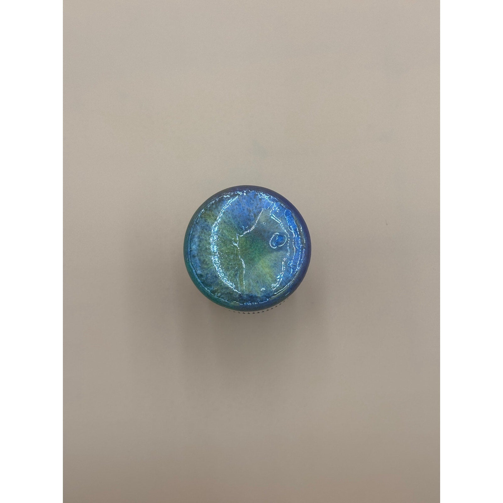 Charming small studio pottery bud vase featuring a stunning reactive glaze in vibrant blue with green undertones. This handcrafted piece showcases vertical ribbed texture around the body and a smooth neck with a small opening perfect for displaying a single stem or small bouquet. The bottom edge has a natural unglazed/rough texture, which is characteristic of handmade pottery and not a defect.