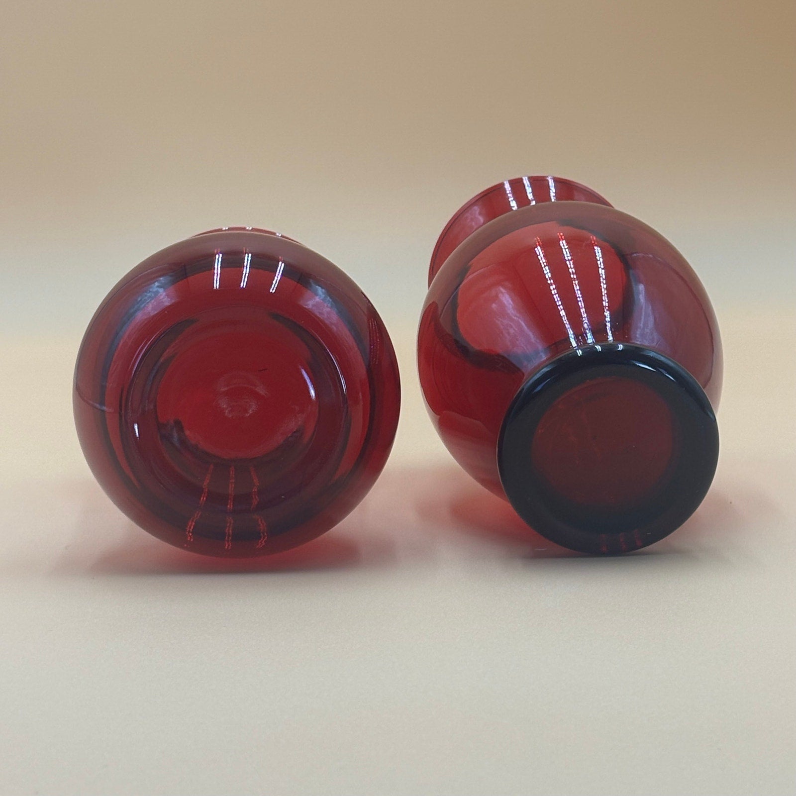 Beautiful pair of vintage ruby red glass vases - one with elegant ribbed neck and round base, and one traditional oval shape. Stunning deep red color throughout both pieces perfect for Valentine's Day displays, holiday decor, or adding a vibrant touch to any room. Versatile size for small floral arrangements or as decorative accents. Flowers not included. There's a flaw on the ribbed one. I didn't even notice it until I went to take close up lighted pictures.