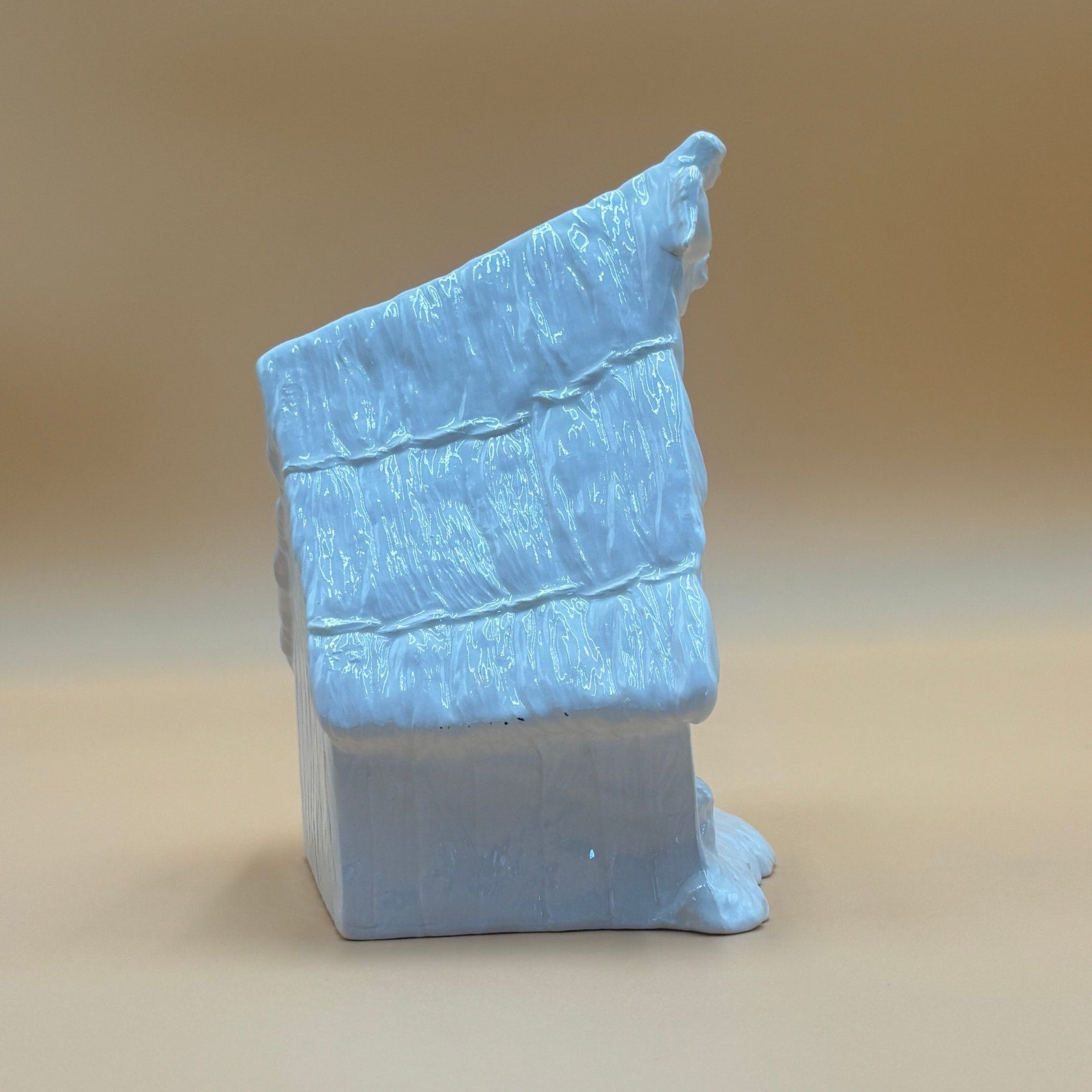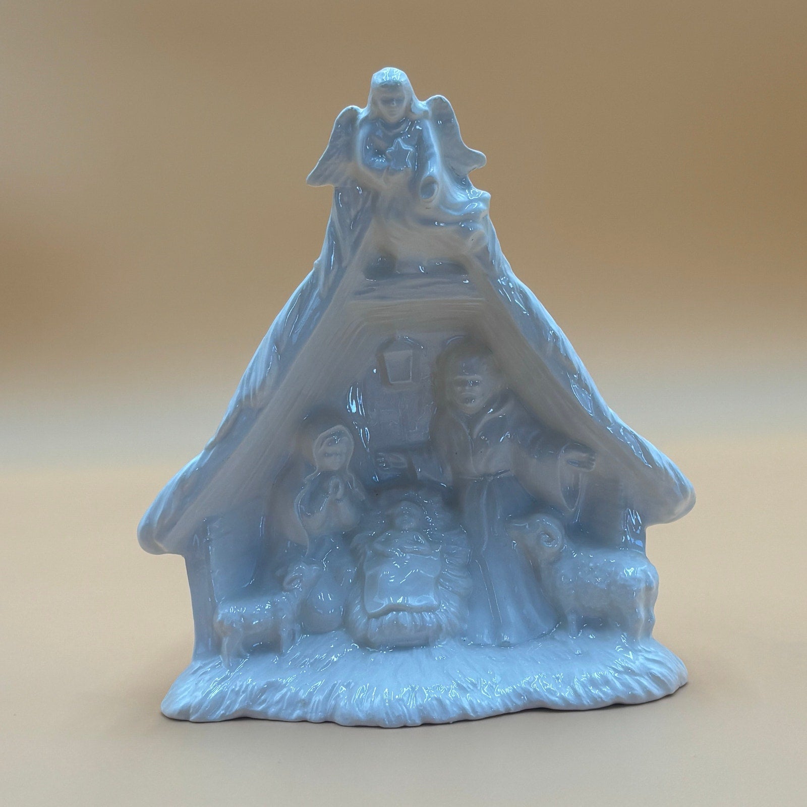 Charming vintage ceramic nativity scene with a delicate shiny white glaze. Features the Holy Family in a stable with guardian angel perched atop the roof. This sweet, minimalist nativity makes a beautiful addition to holiday decor or a year-round religious collection. Hollow construction with open back.
