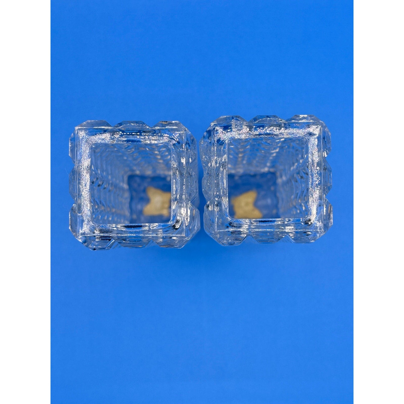 Square cut clear glass bud vase by Enesco featuring a cube design with block pattern. Original foil Enesco tag on bottom.