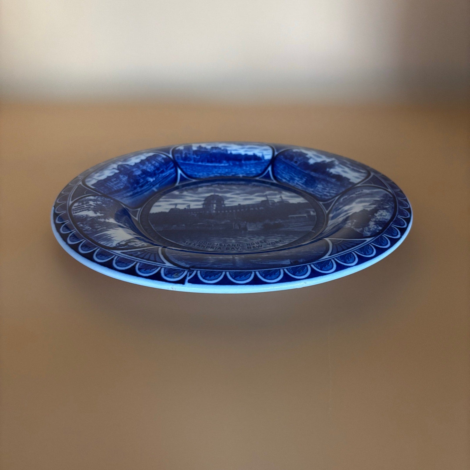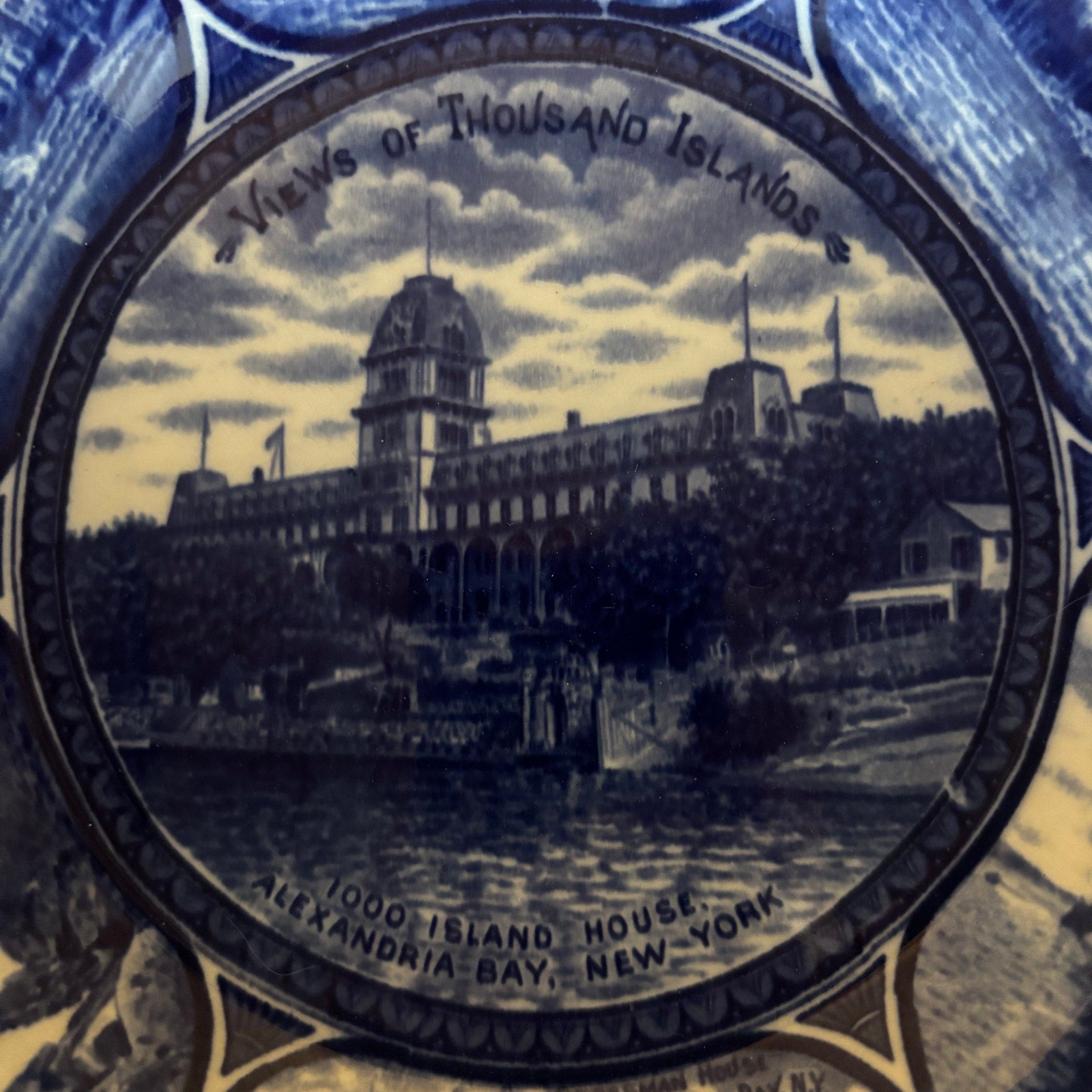Beautiful vintage blue and white collectible plate featuring Thousand Islands, New York scenes. Manufactured in Staffordshire, England expressly for 1000 Island Souvenir Co. in Alexandria Bay, NY. Features multiple scenic views of the region including waterfront buildings and landscapes in classic blue transferware style with decorative border.