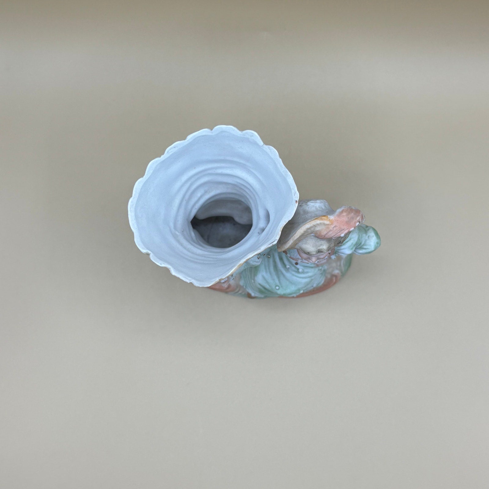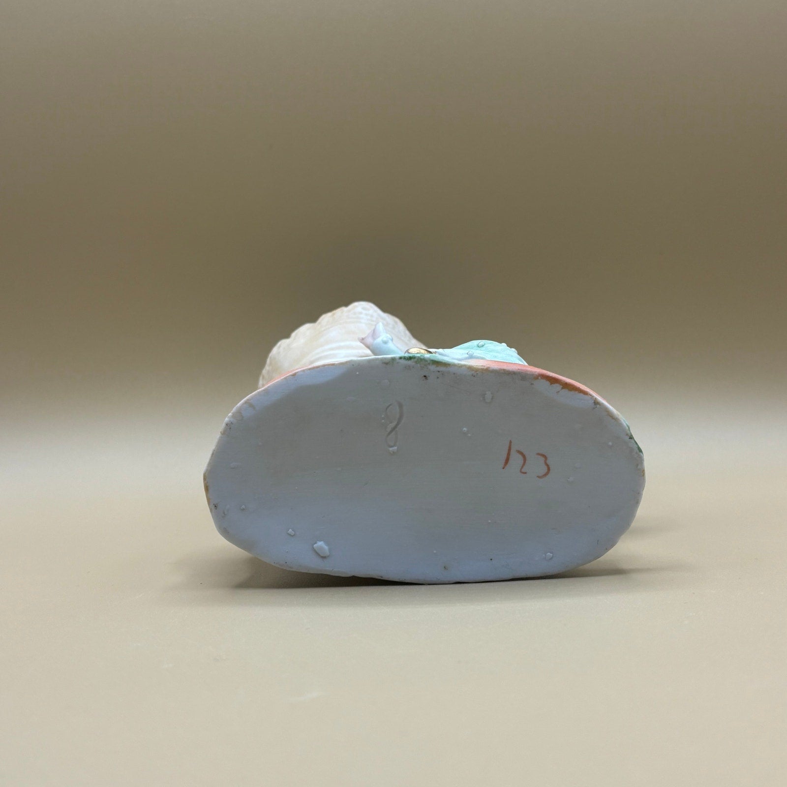 Charming pair of Vintage possibly Antique porcelain boot planters featuring Victorian-dressed children. Each piece depicts a beautifully detailed figure in mint green and peach tones seated beside a decorative boot vase. The boy wears knickers while the girl is dressed in a full-length dress with matching bonnet. Marked "123" on bottom and "3270" on back.