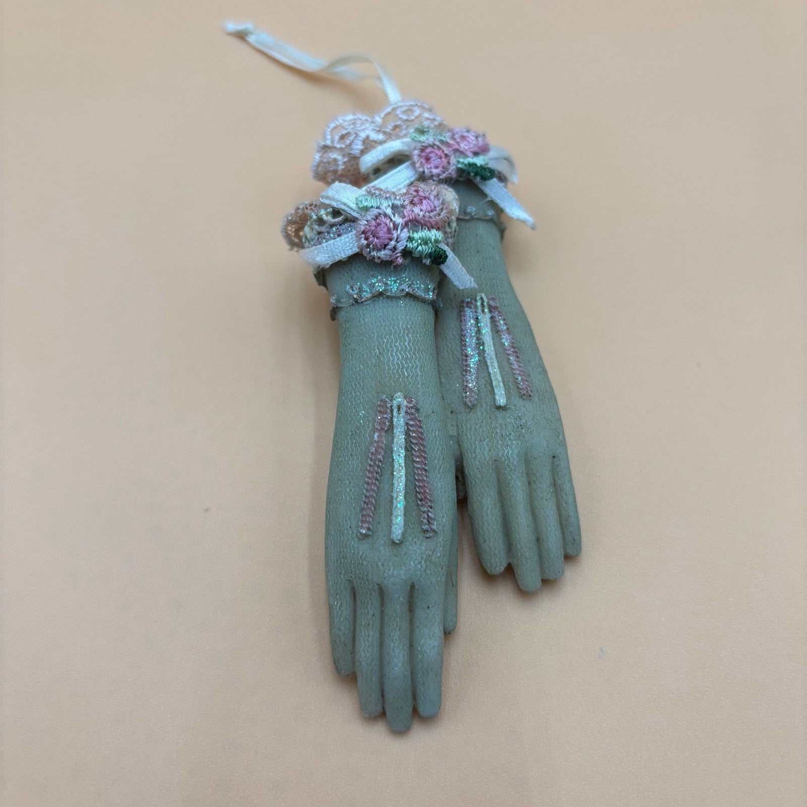 Delicate Victorian-inspired decorative glove ornament in a soft seafoam green color. Features intricate embroidered pink roses, detailed stitching on fingers, and beautiful lace trim at the wrist. Finished with satin ribbon hanging loop. This charming piece makes a lovely addition to a Christmas tree, doorknob decoration, or as part of a Victorian-themed display.