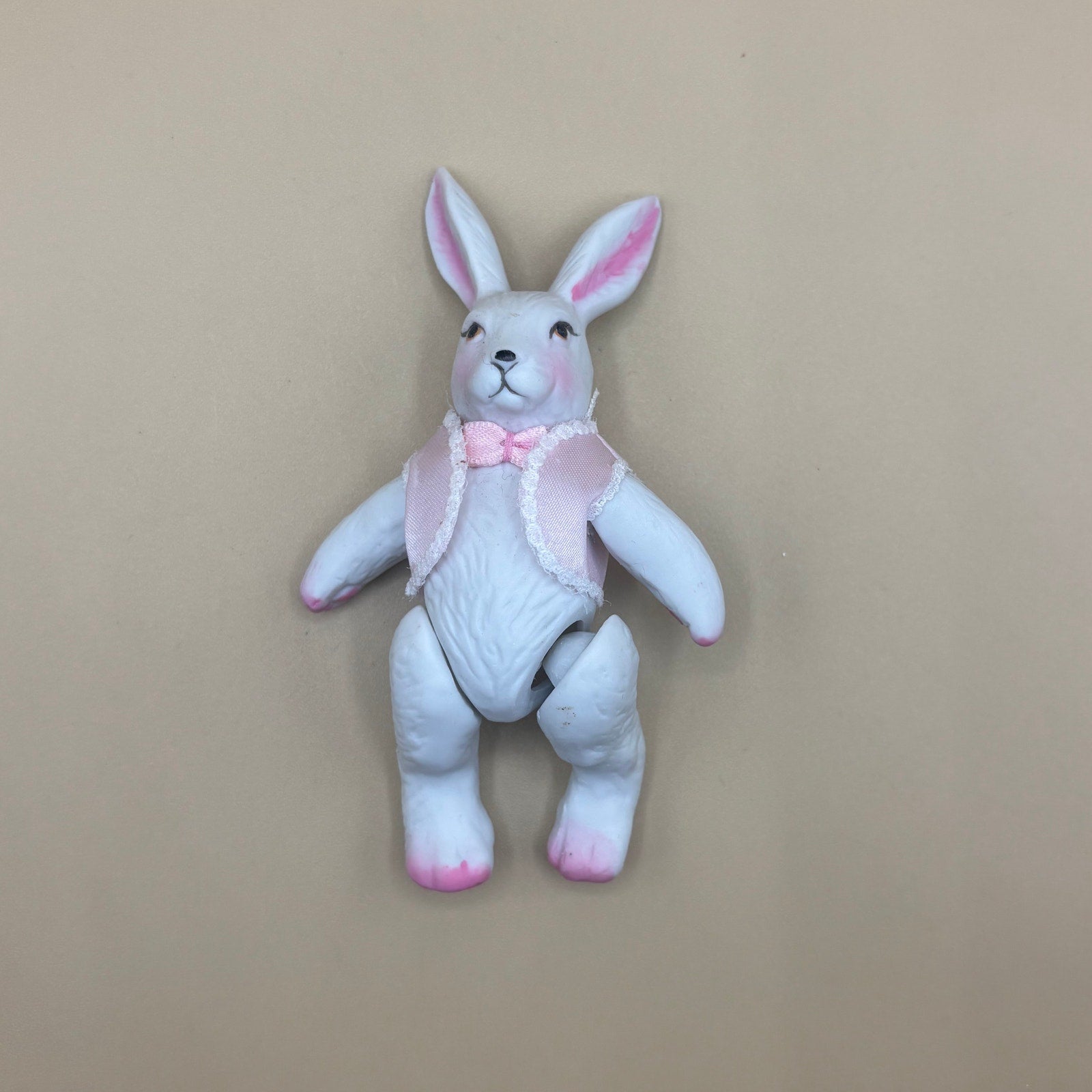 Charming vintage bunny figurine with sweet hand-painted details. Features pink-tipped ears, paws, and nose. Wearing a delicate pink vest with white lace trim and bow. Poseable design with jointed limbs.