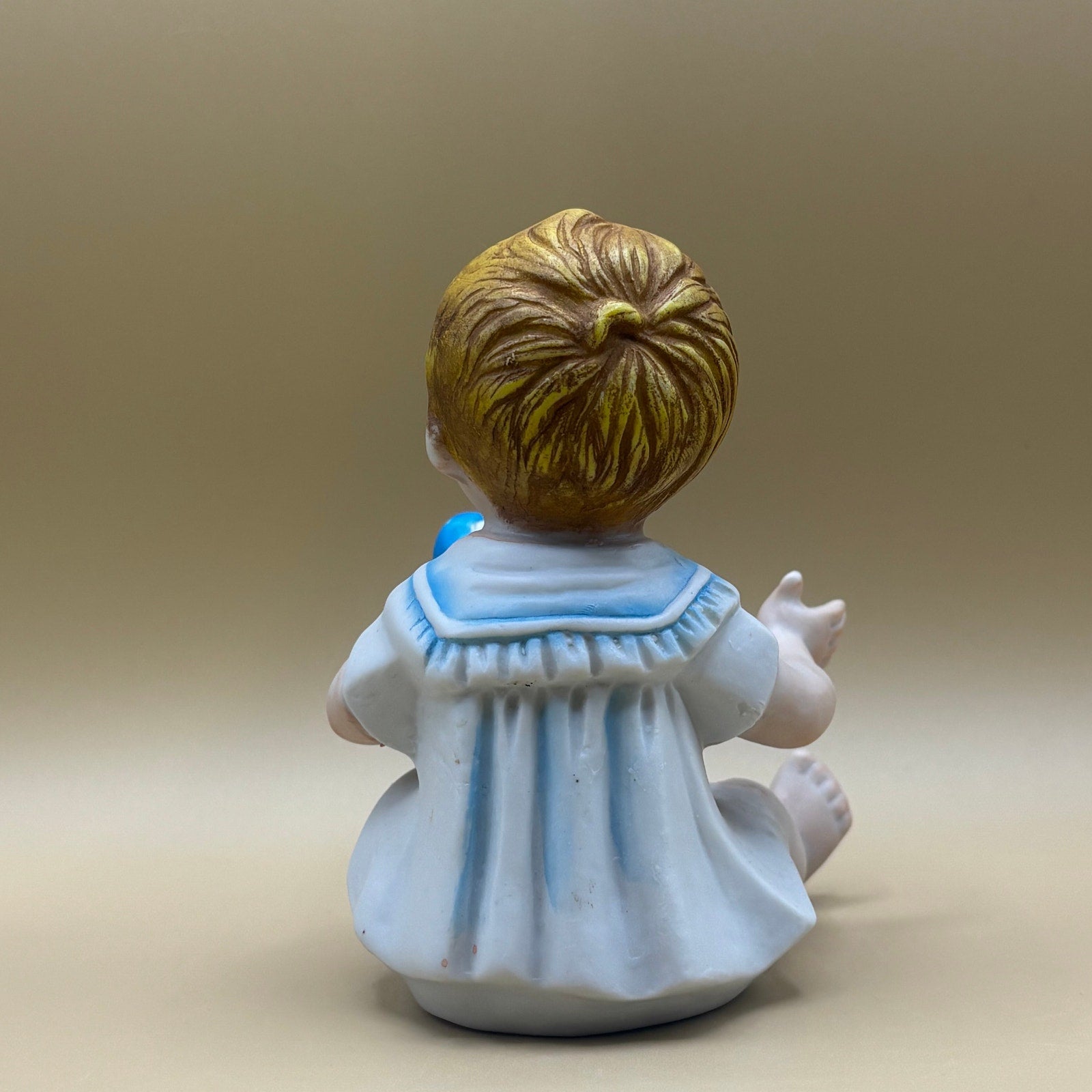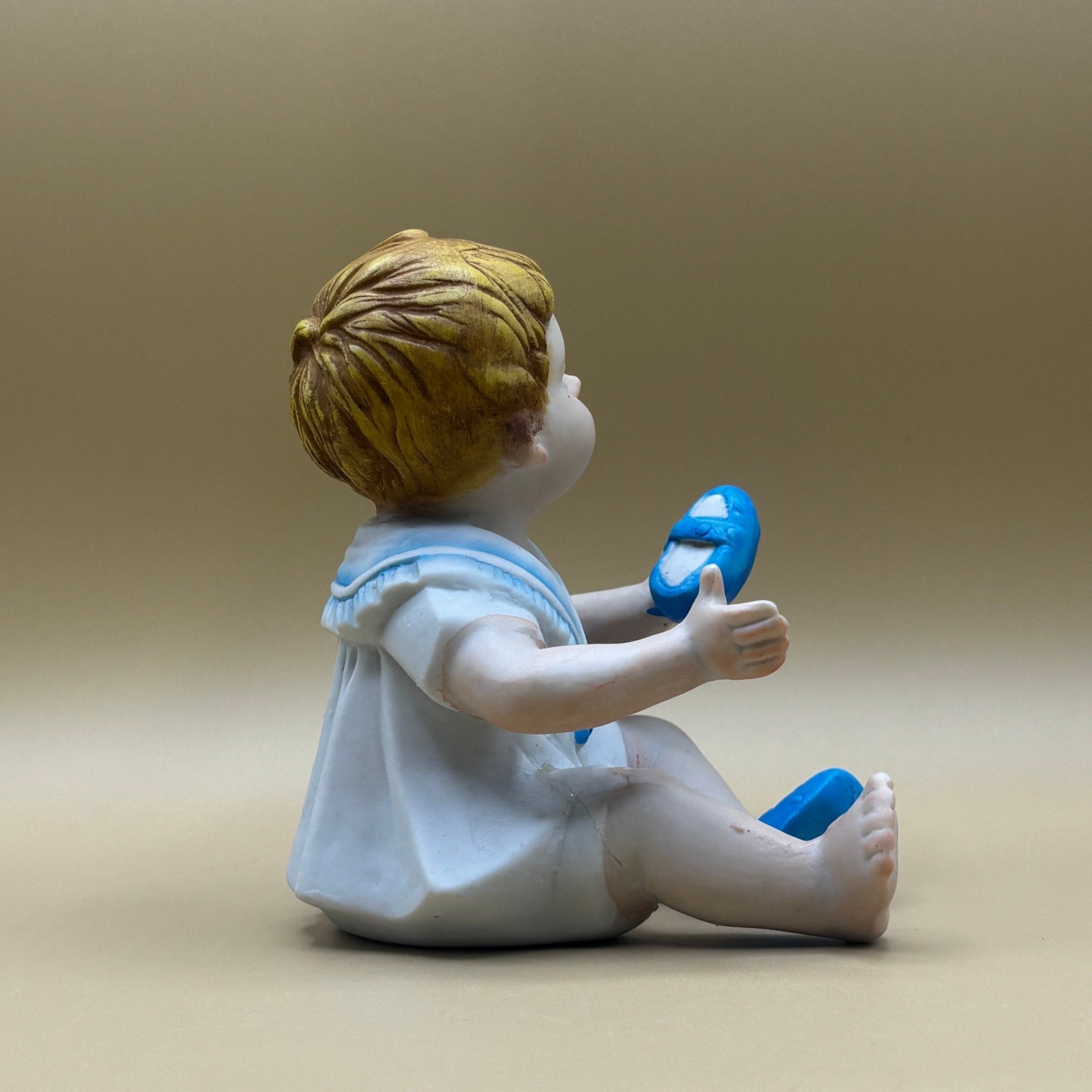 Sweet vintage baby figurine in white romper putting on bright blue shoes. Hand-painted details including rosy cheeks and golden blonde hair. Sitting pose with one arm reaching out quizzically.